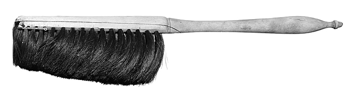 BORSTE (sop-) Borstrygg och skaft av björk, svarvade i ett stycke; ryggen med halvstavig översida, undersidan plattad, med en frånskuren, sedermera pålagd skiva för bindlarna, skivan vid inre änden fäst med en s. k. träskruv. Skaft med inre delen insvängd, den yttre spolformig, med ytteränden avslutad i en profilerad knopp. Bindlar grova av svart tagel. Längd: 51 cm.; bredd: 3,4 cm. Skaft, längd: 28 cm.