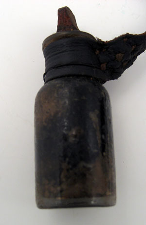 Oljeflaska av klart glas, nu färgad svartaktig av oljan. Cylindriskt tvärsnitt med kort bred hals och nerstucken träplugg. Runt halsen lindat svart läderband, fästat vid kryttygets mässingsring.