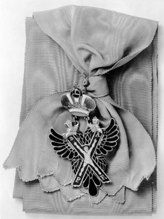 Axelband av ljusblå sidenmoaré, tandade bandändar, nertill sammanbundet för fästning av tecknet.