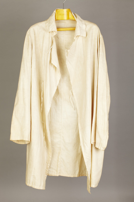 Överdragsrock av ofärgat linne. Ryggsöm, ingen midjesöm. Stänges med snören som knytsihop.