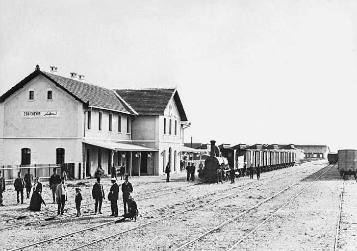 Stationen i Eskişehir. Text på originalet: "Station d´Eskichéhir." Fotografierna LXVI:O.01.-54. kommer från resan till Turkiet och Mindre Asien som Wilhelmina och Walther von Hallwyl gjorde den 27 april - 20 juni 1901. De lämnade Sverige den 5 november 1900 för Egypten, där de stannade till den 28 mars 1901, då de fortsatte till Palestina. Den 27 april fortsatte de till Turkiet och Mindre Asien. Med på resan var Wilhelminas sällskapsdam, fröken Ida Uhse. I Konstantinopel (Istanbul) anslöt sig Wilhelminas mor Johanna Kempe och kusindottern Elma Hök. Fotografierna är inköpta av Wilhelmina i Konstantinopel (Istanbul) och Brussa. Alla uppgifter kommer från Ida Uhses reseanteckningar.