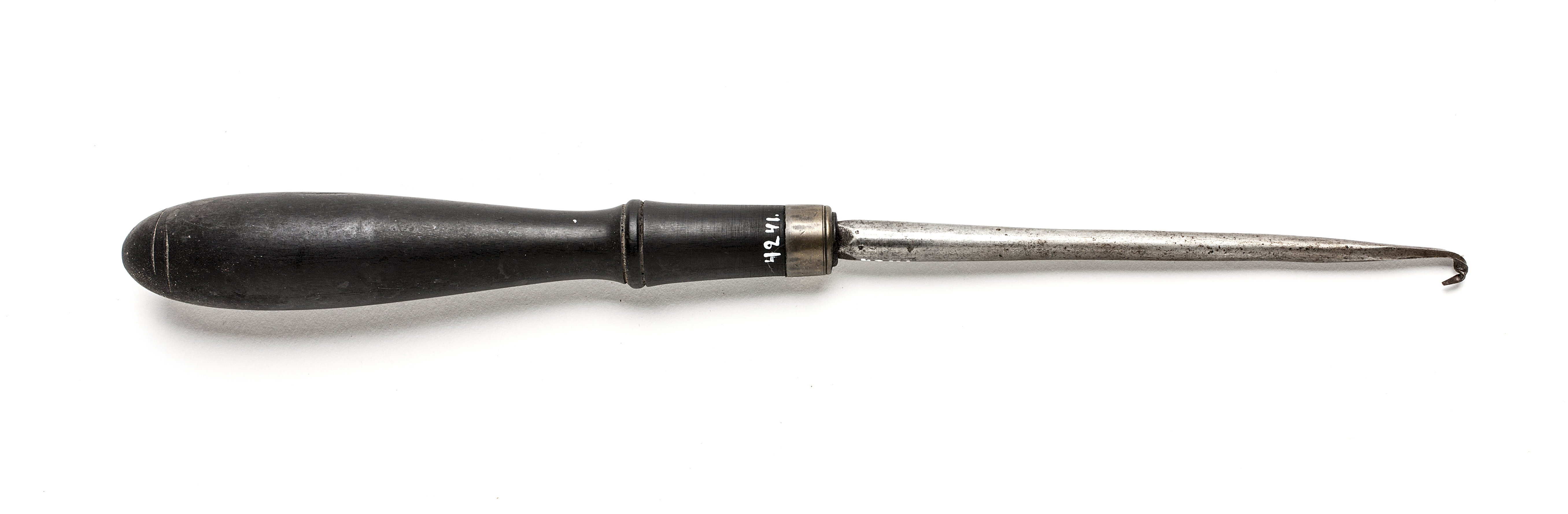 Rund klinga med från två sidor tillplattad ände. Svarvat skaft av ebenholts med en vulst. Mässingsring.
