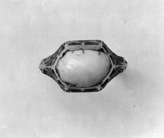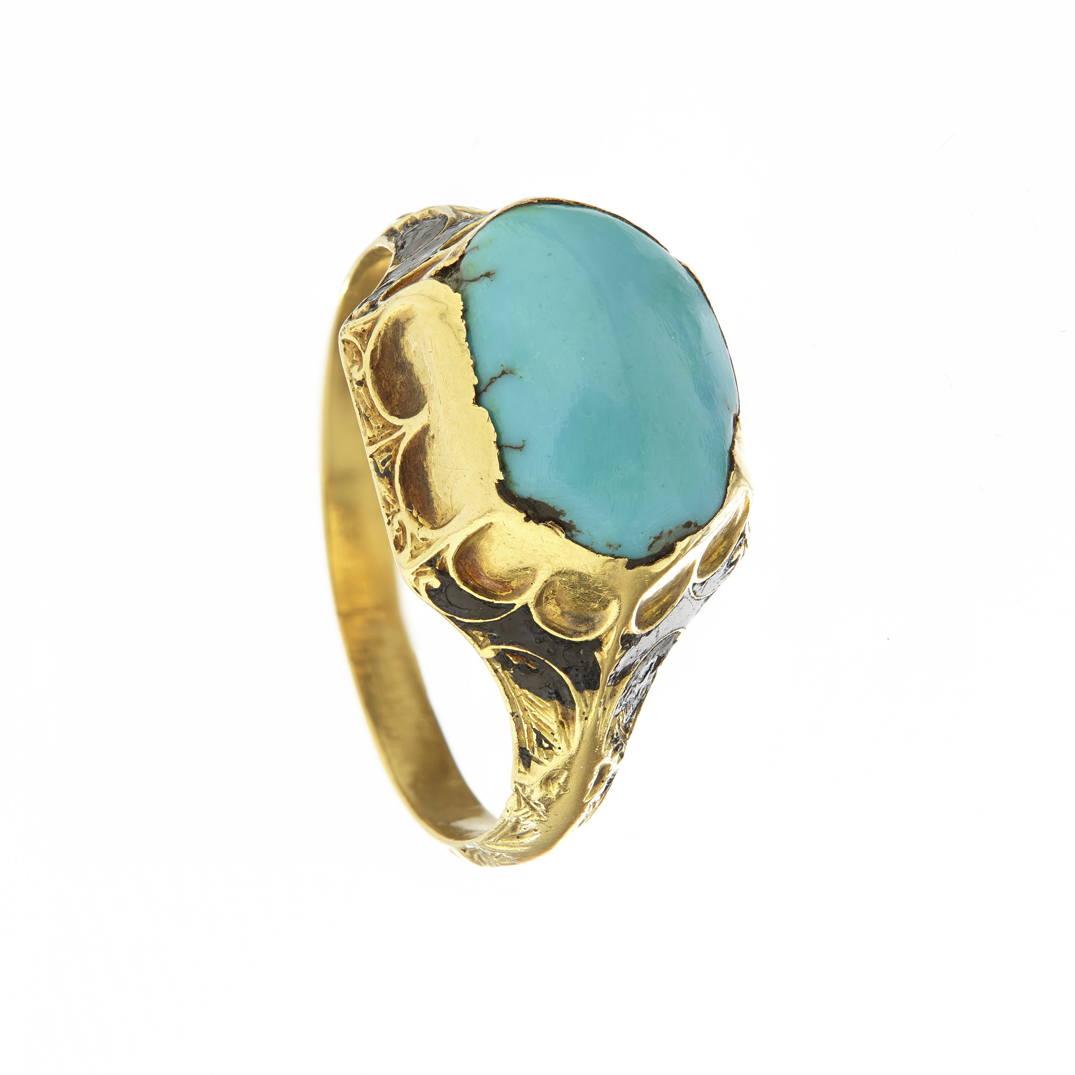 Sexkantig platta med infattad cabochonslipad turkos, avdeckt fattning av guld. Övergående i ring med trekantigt tvärsnitt, graverad dekor på övre delen, ifylld med svart emalj.