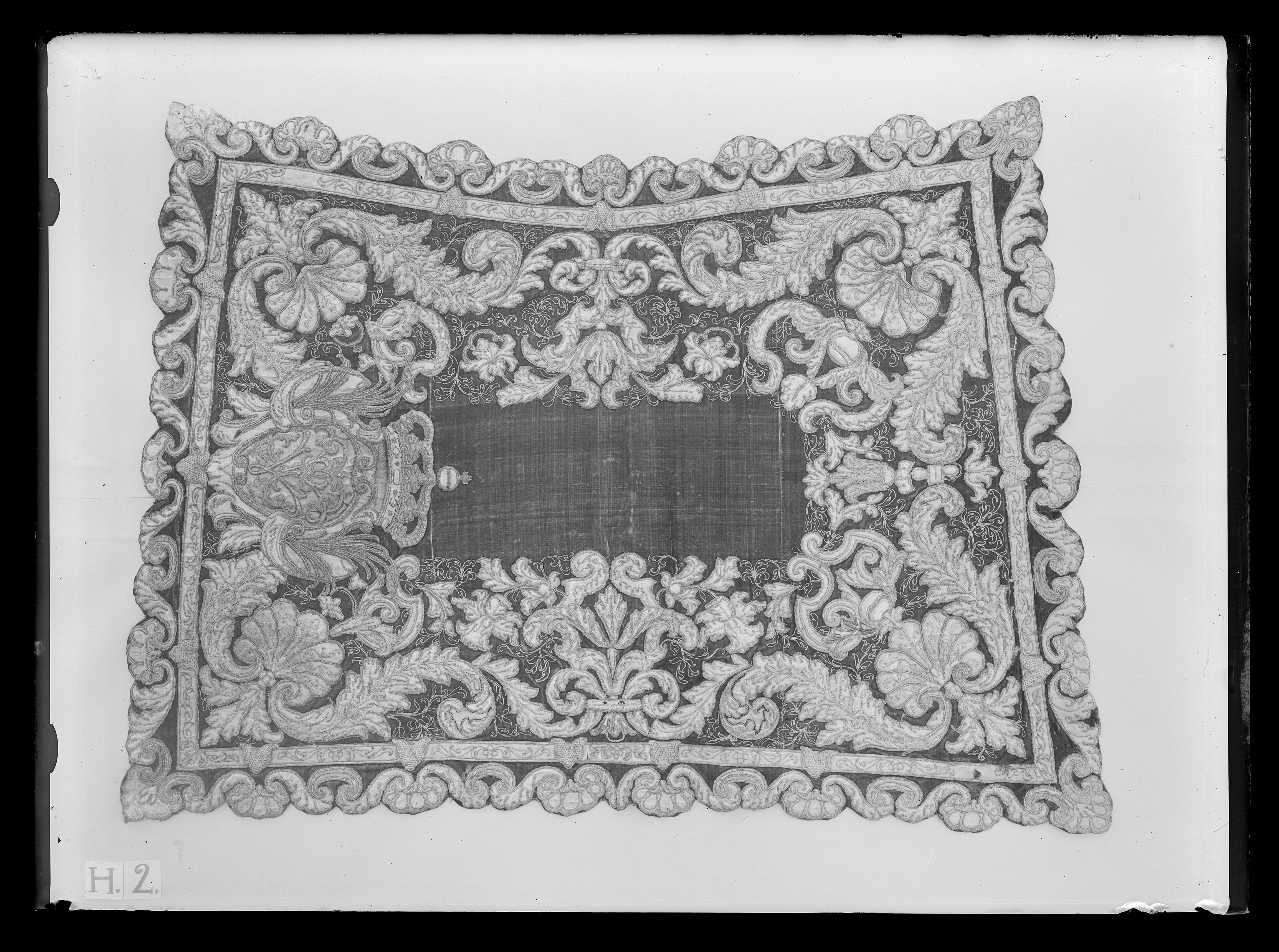 Bottentyg av röd sammet, tre våder på mitten 430 mm, 520 mm och 430 mm. Alla sidor avslutade i runda uddar. Applikationerna i blå och beige gyllenduk, kantade med ett 3 mm brett band av gult silke med inslag av guldtråd som bildar öglor i ytterkanten. Ovanför detta löper en guldtråd glest överspunnen med en annan guldtråd på de beige applikationerna. På de blå applikationerna silvertråd gles överspunnen med annan silvertråd. En ca 80 mm bred bård med palmettbladsmotiv av beige gyllenduk och voluter av blå. Fyra voluter på varje kortsida, sex på varje långsida. Innanför denna ett 30 mm brett band med applikationer i bottenbroderi av silvertråd. På kortsidorna tre stycken, i framkanten fyra och en saknas, i bakkanten fem och en saknas. Mellan dessa är bladkonturer av guldtråd glest överspunnen med annan guldtråd. Innanför denna ett 30 mm brett band med applikationer i bottenbroderi av silvertråd. På kortsidorna tre st, i framkanten fyra och en saknas, i bakkanten fem och en saknas. Mellan dessa är bladkonturer av guldtråd glest överspunnen med annan guldtråd. Innanför detta band en bård mellan 260 mm och 300 mm bred. I hörnen diagonalt utgående palmetter med plattsömsreliefer av silvertråd. På framkantens och bakkantens mitt en akantus utgående från en volutform. Mellan applikationerna kontursömmar på sammeten av guldtråd glest överspunnen med annan guldtråd. På vänster sida, ca 400 mm högt Ulrika Eleonoras spegelmonogram i plattsömsrelief av silvertråd på blå gyllenduk i en kartusch omgiven av palmkvistar av guldtråd och krönt. Mellan kvistarna några stygn med starkt blågrönt silke. Kunglig krona med på kronringens fem pärlformer rester av blågrönt och brunt silke. Foder av rött ylle i kypert, fastsytt med förstygn. Längs fodrets vänstra sida 4 st. lädertampar med mässingsringar och i hörnet en läderrem 450 mm lång på mitten fäst. Mellanfoder av hampväv i tuskaft.