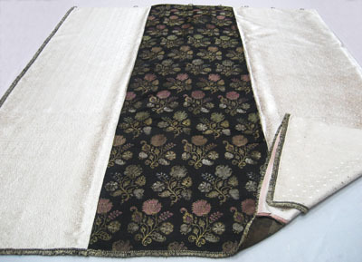 Del av sängomhänge till stolpsäng. Sängomhänget består av fyra våder. De två yttre och en av mittvåderna är i benvitt siden med invävt mönster i form av stiliserade blommor i geometriska former. Den andra mittvåden är av svart sidenatlas med invävda blomsterkvistar i gul, cerise, vit och grön silke. Överst är den svarta våden lappad med en remsa i samma tyg. Vit vådbredd ytterst: 465 mm, i mitten: 495 mm. Svart vådbredd: 490 mm. Franskant runt om långsidorna och nedre kortsidan, av svart, beige och vit silke, bredd: 18 mm. Längs överkanten nio metallringar, av vilka fem är av gul, grövre metall med raka kanter och mäter 25 mm i diameter. Fyra är av järntråd med knutliknande fäste upptill och mäter 30 mm i diameter. Fästa med beigefärgat garn. Fästen efter ytterligare tre ringar.
