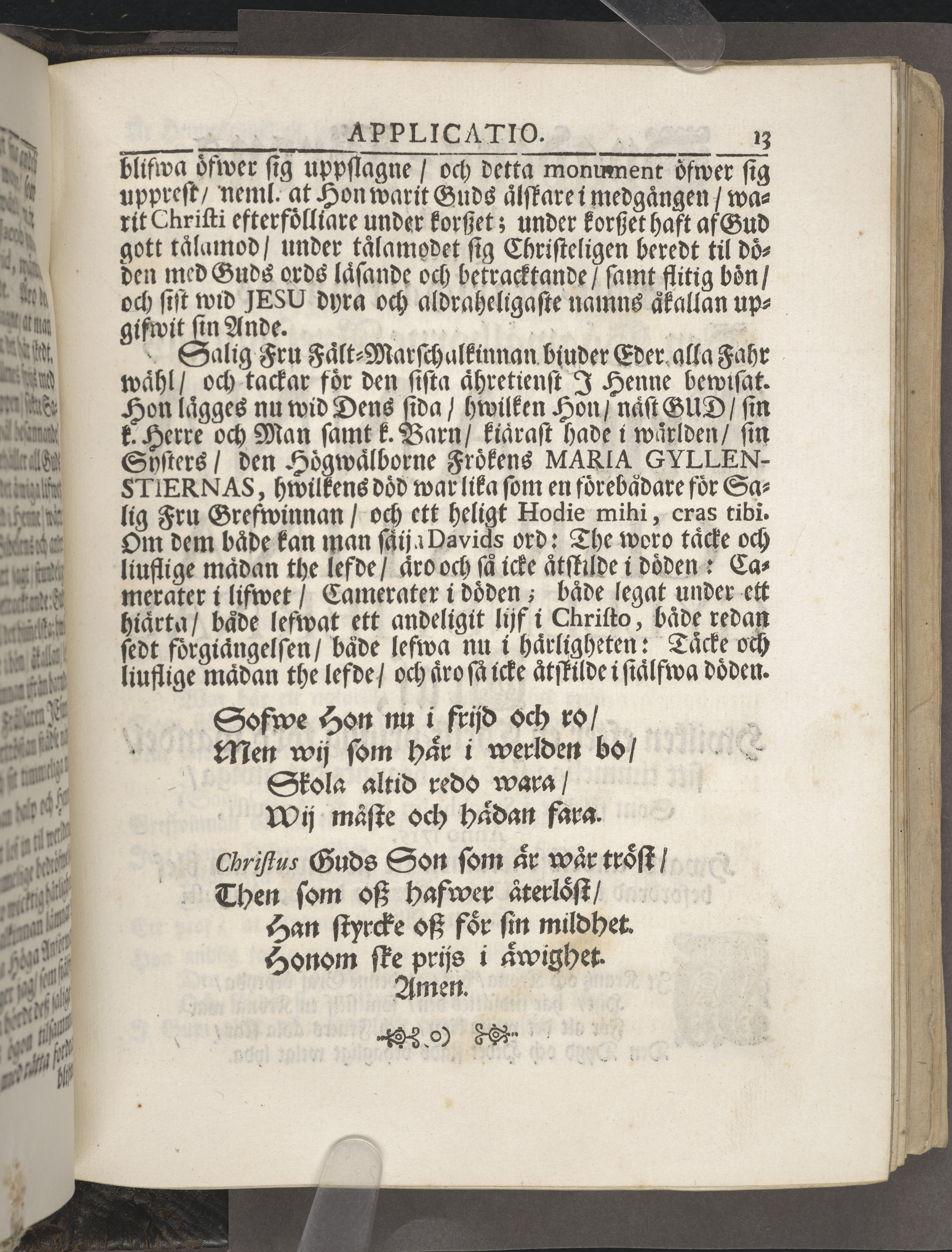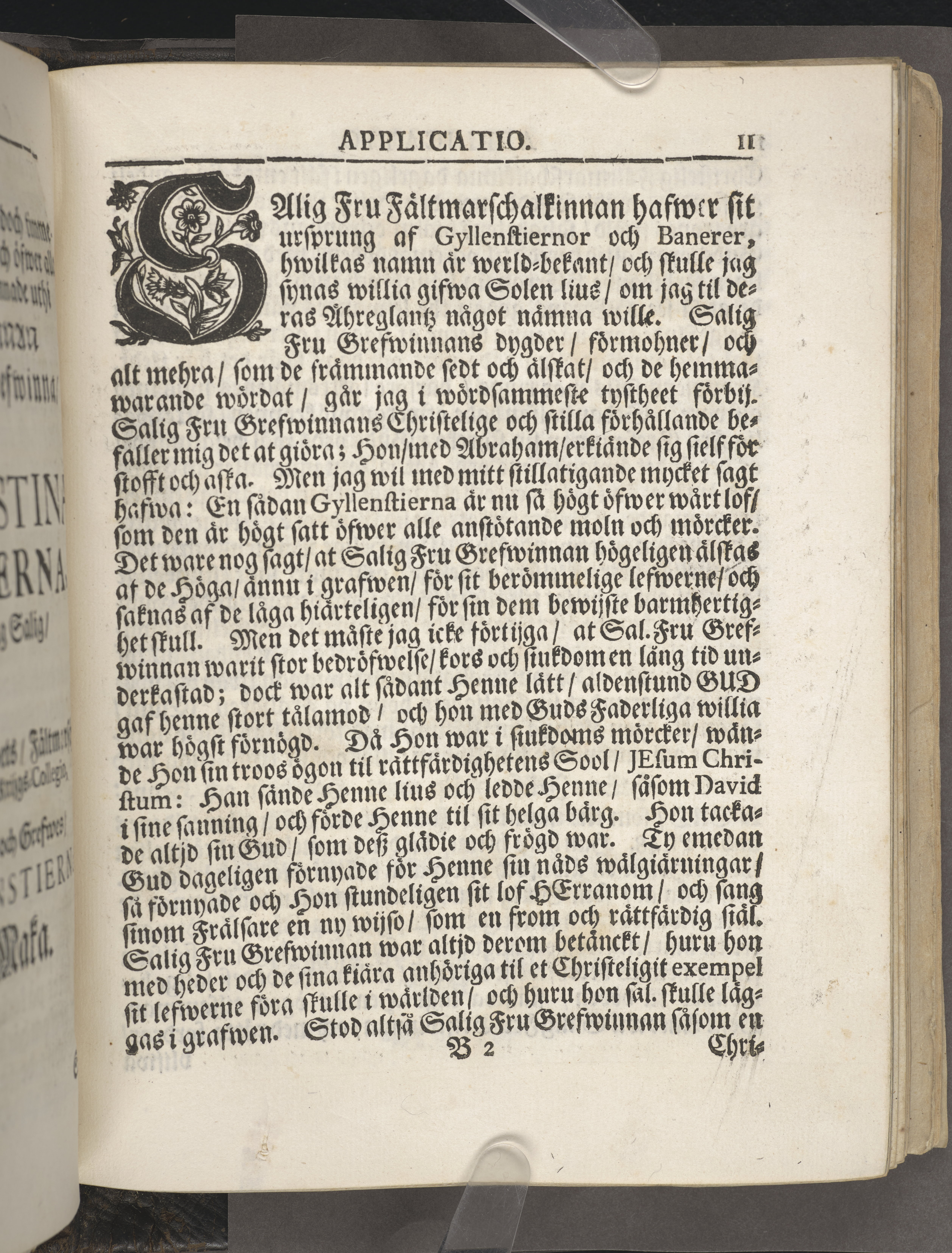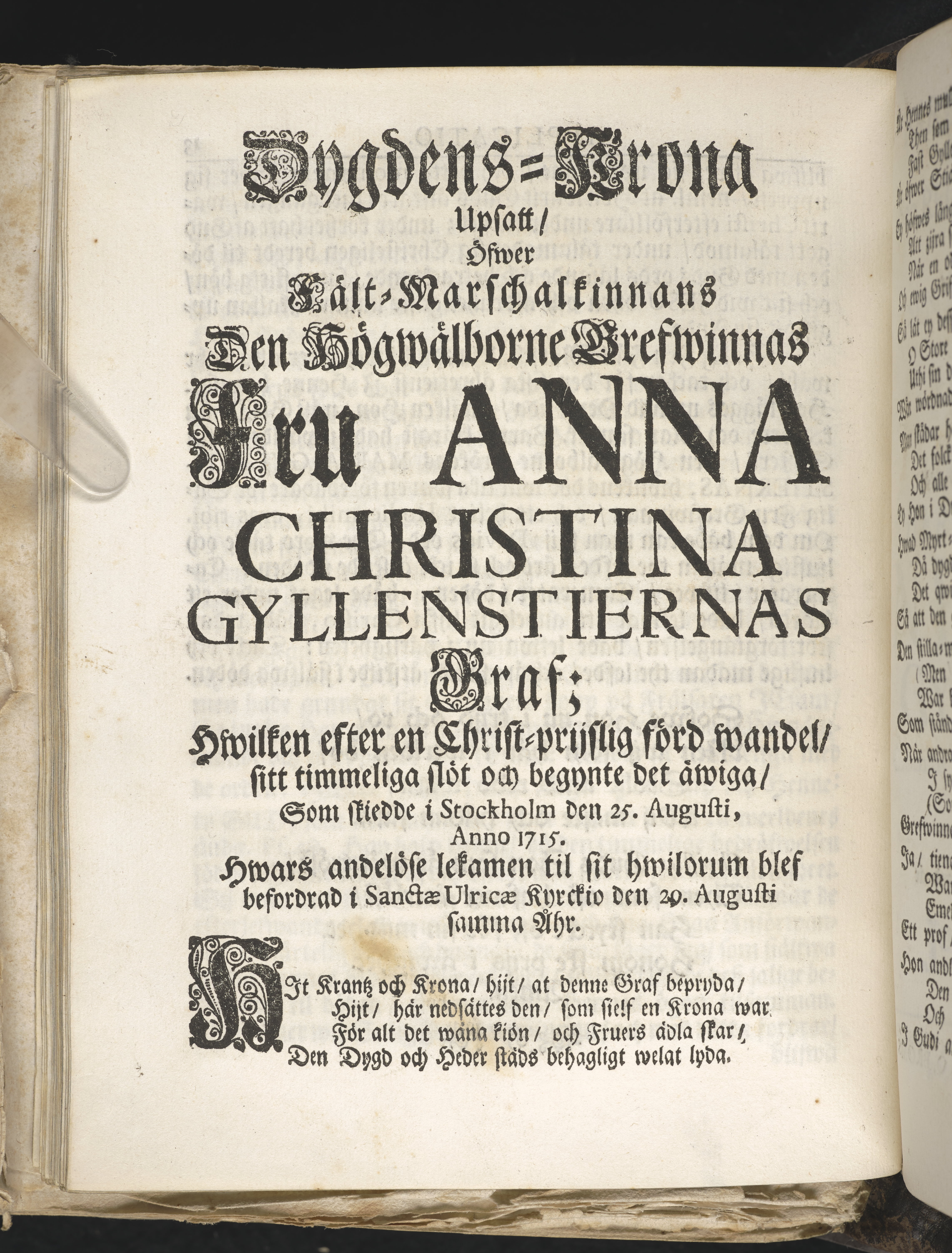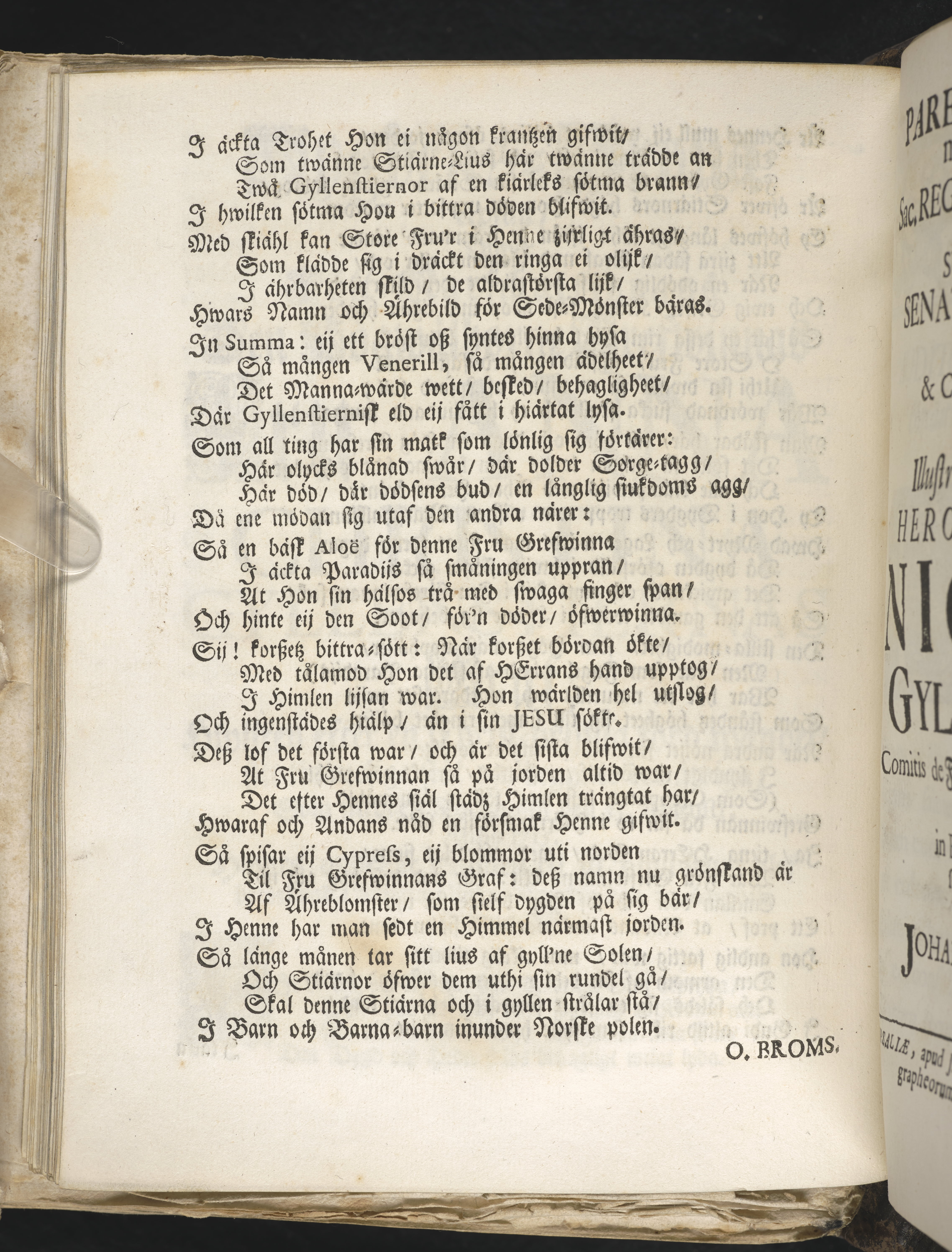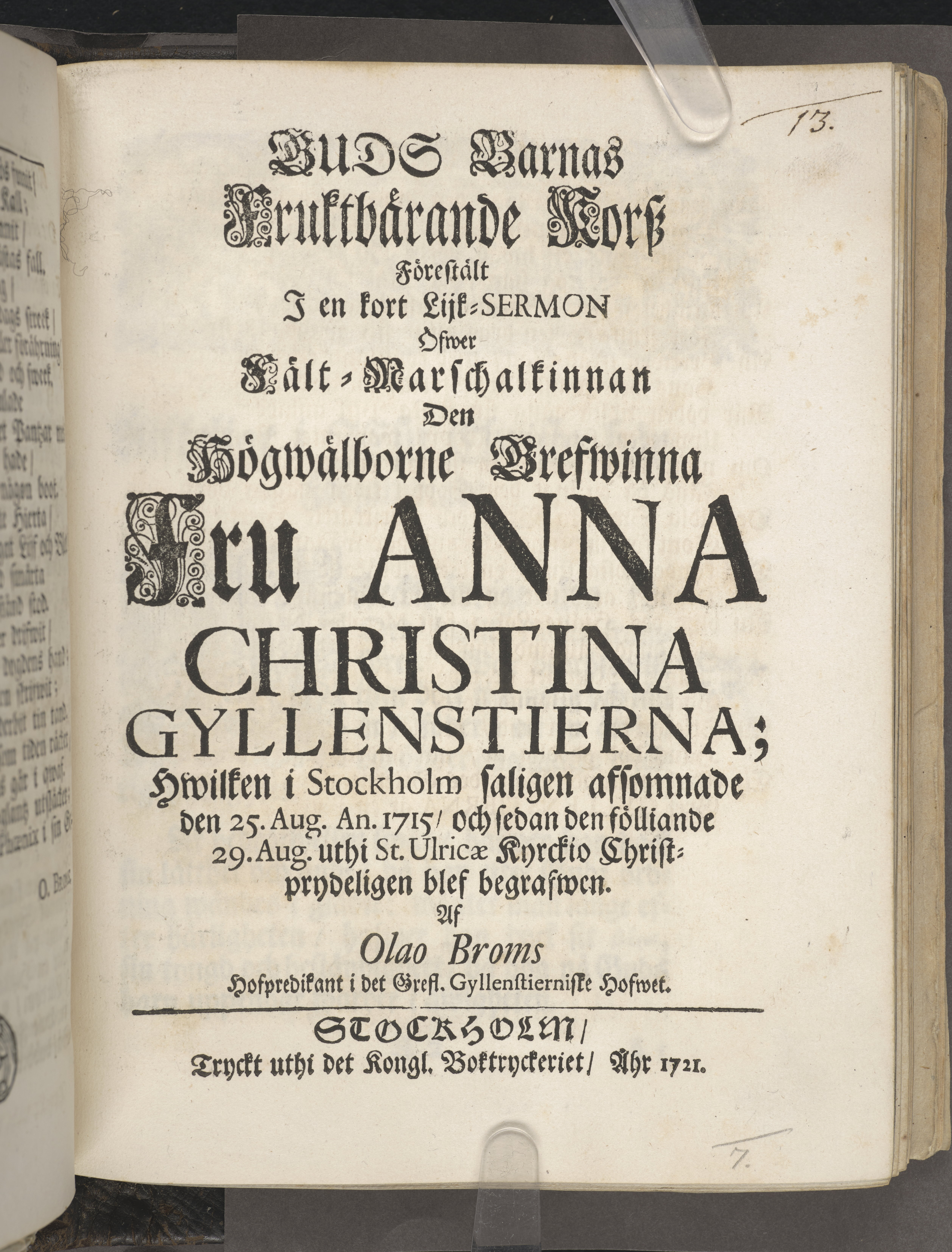 Guds barnas fruktbärande korsz förestält i en kort lijk-sermon öfwer fält-marschalkinnan ... Anna Christina Gyllenstierna; hwilken i Stockholm saligen afsomnade den 25. aug. an. 1715, och sedan den fölliande 29. aug. uthi St. Ulricæ kyrckio christprydeligen blef begrafwen. Af Olao Broms ... Stockholm, tryckt uthi det kongl. boktryckeriet, åhr 1721.