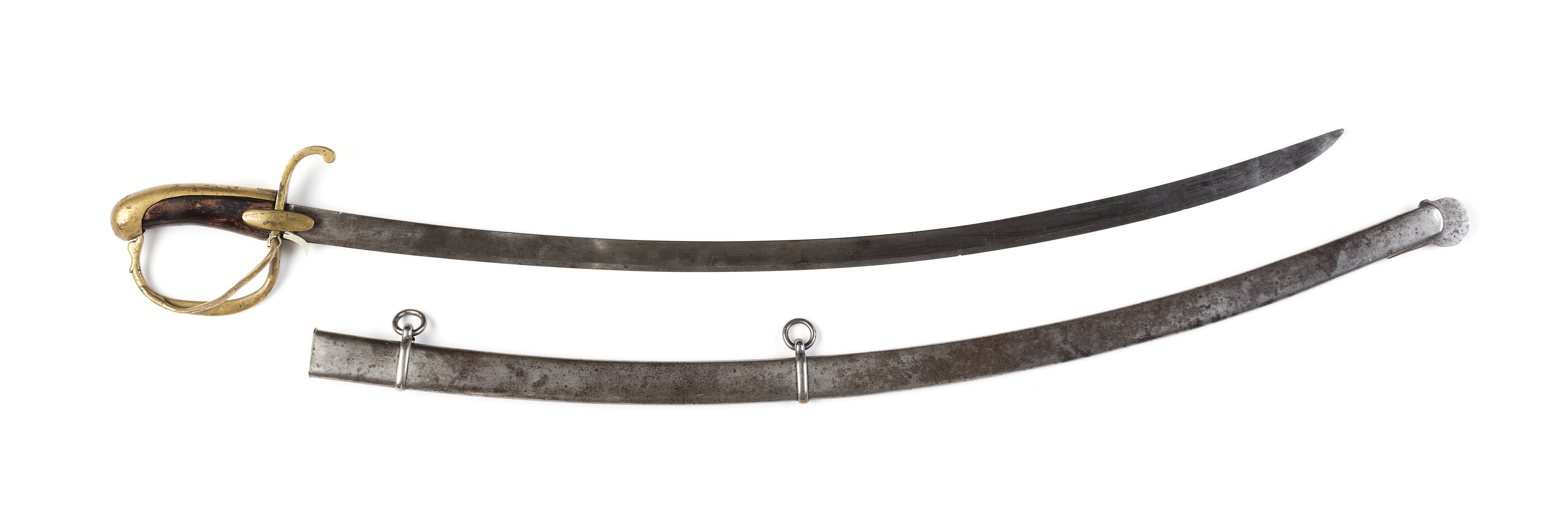 Fäste av slät mässing. Kappa rundad, direkt övergående i den bakre parerstången, anslutande till ryggskenan. Handbygel bågformig, rundat platt, över änden konturerad, intappad i kappans nederdel. På utsidan utgår från handbygelns övre hälft en bakåt-inåtsvängd sidobygel. Bakre parerstång med fyrsidigt tvärsnitt, bågformigt nedåtböjd och med ansvälld ytterände. Styrskenor utdraget ovala. Kavel av slätt trä, betsad i mörkbrunt. Klinga böjd, eneggad utom vid det tvåeggade spetspartiet. Intill ryggsidan en bred, tämligen grund hålkäl, nående till en längd av ca 160 mm från spetsen. Samhörande balja nr 13534.