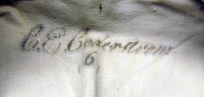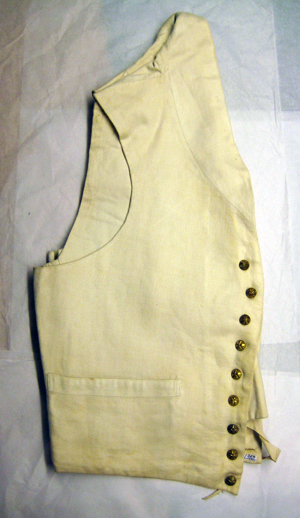 Väst av vitt kypertvävt linne med öppen ståndkrage. Knäppning mitt fram bestående av nio tränsade hål för fästande av knappar. Knapparna är kupiga i formen, av förgylld mässing med ett mönster av en stjärna och små knottror, diam 12 mm. På vardera framstycke är iskuret en horisontal ficka, l. 162 mm, med en kantslå, b. 20 mm. Ryggstycket är av ett tunnare linnetyg. Mitt bak samt i nederkanten sitter påsytt fyra knytband av vitt linne. Västen är på insidan fodrad med vitt linne. På fodret, mitt bak nedanför kragen, står en påskrift med svart bläck: "C. E Cederström// 6".