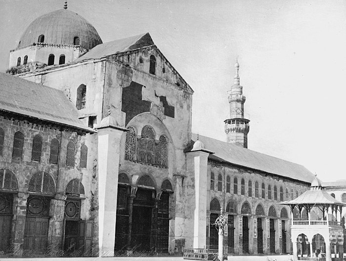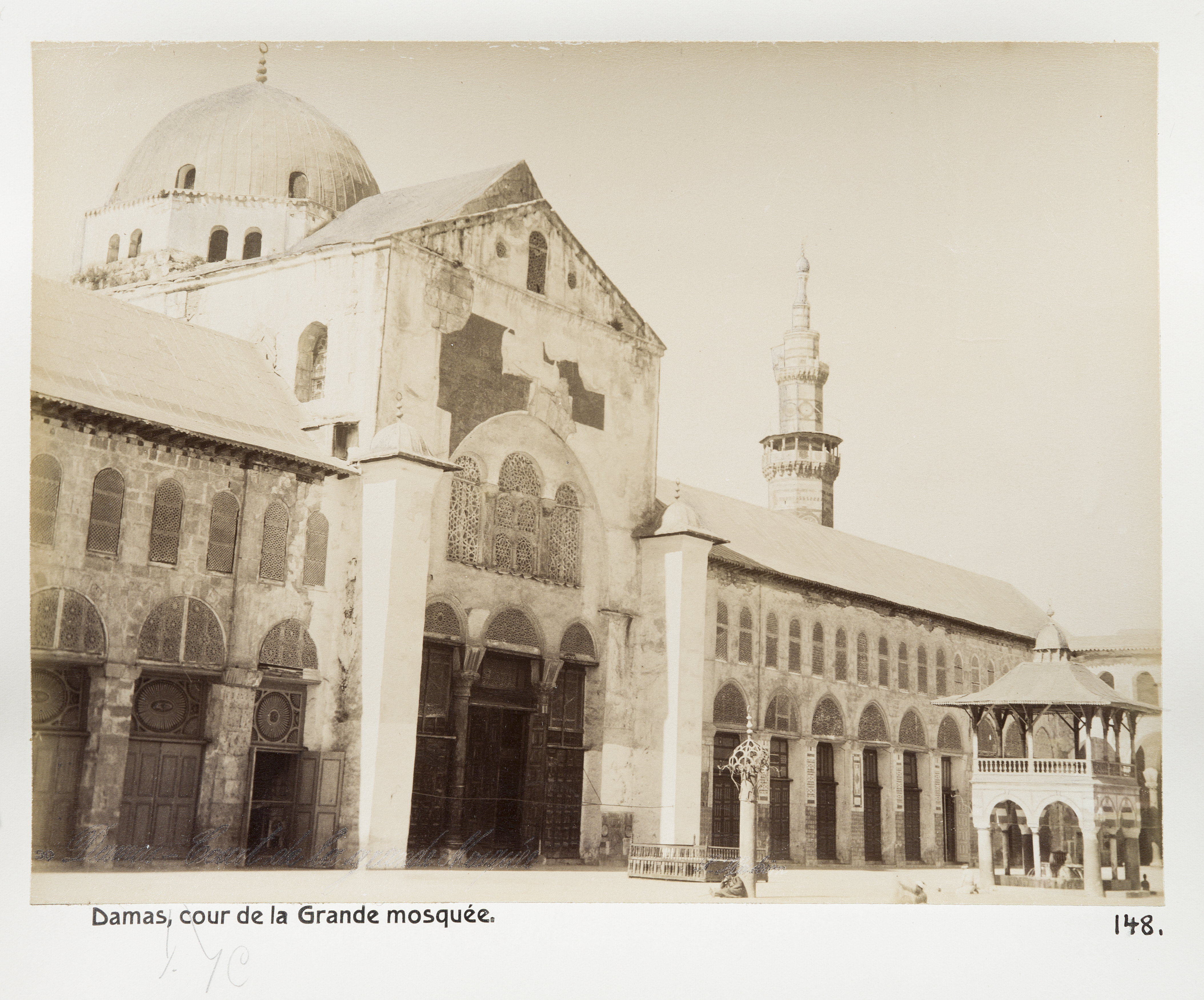Den stora moskéns gård, Damaskus. Text på originalet: "Damas. Cour de la Grande mosquée." Fotografierna LXVI:N.01.-180. kommer från resan till Palestina och Syrien som Wilhelmina och Walther von Hallwyl gjorde den 30 mars-27 april 1901. De lämnade Sverige den 5 november 1900 för Egypten, där de stannade till den 28 mars 1901, då de fortsatte till Palestina. Med på resan var Wilhelminas sällskapsdam, fröken Ida Uhse. Den 27 april fortsatte de till Turkiet och Mindre Asien. De mindre fotografierna (utom de från Samos) LXVI:N.90.-100. är tagna av Wilhelmina själv, under en resa till häst från Jerusalem till Damaskus 8-20 april 1901. Övriga fotografier är inköpta av Wilhelmina i Jerusalem, Damaskus och Beirut. Alla uppgifter kommer från Ida Uhses reseanteckningar.