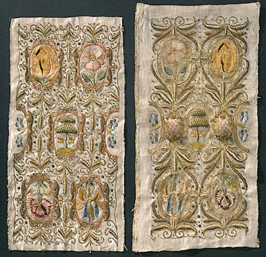 Möjligen tillverkad i England. Ovandel till muff, vilken ursprungligen varit fodrad med harskinn. Av vitt sidenatlas med guld, -silver- och silkebroderi. Motiv med blommor inskrivna i kartuscher omgivna av vegetativa bladornament i engelsk renässansstil. Två av de tre muffarna är lika ( denna samt 19851) medan den tredje avviker något. Kartuschernas dekor är lika för alla tre: tulpan, ros, nejlika, iris samt i mitten ett formklippt träd och på sidorna små penséer. Klädkammarens inventarium 1672: "3: St: harskinss Muffar af mahl fördärfwade -------15:-"