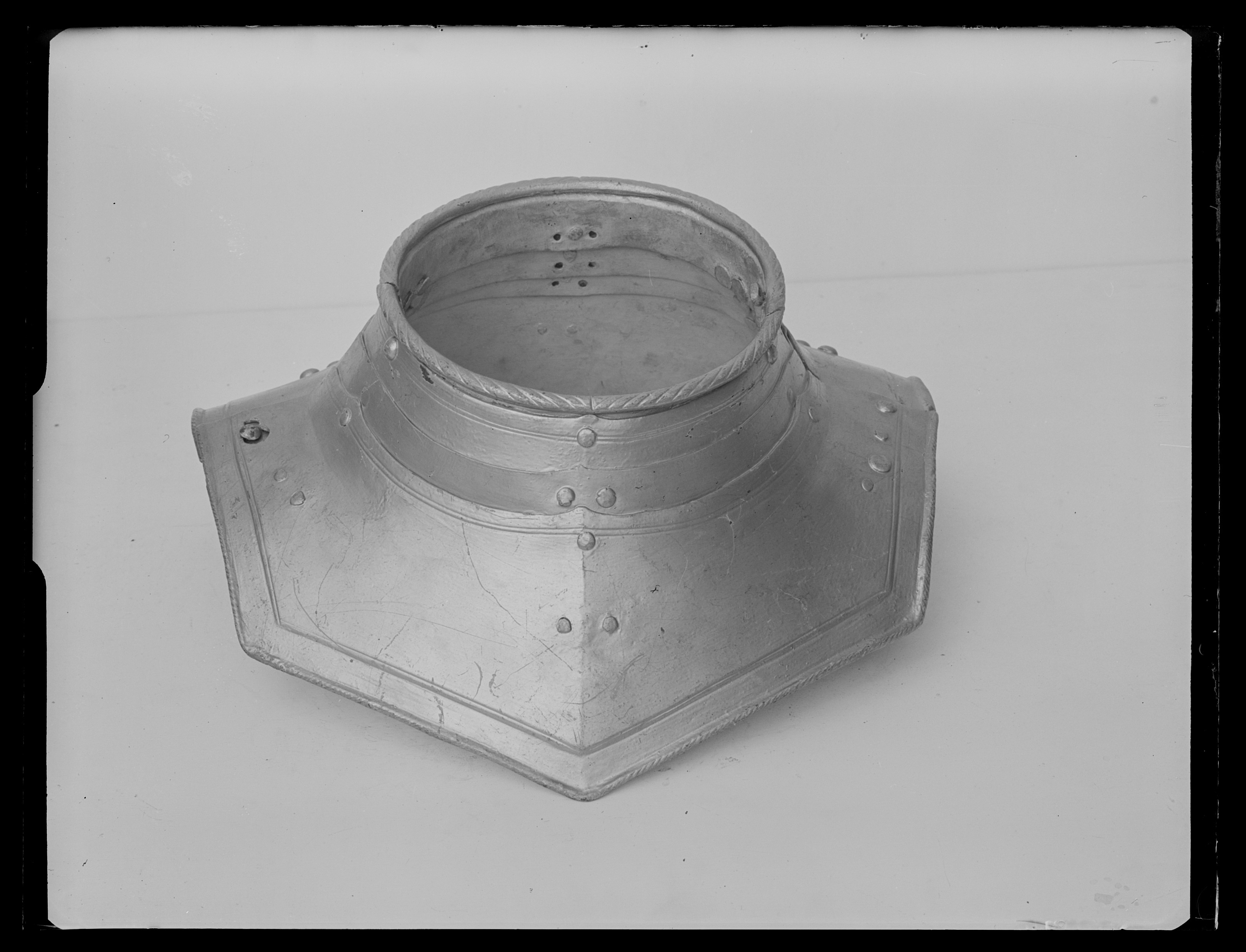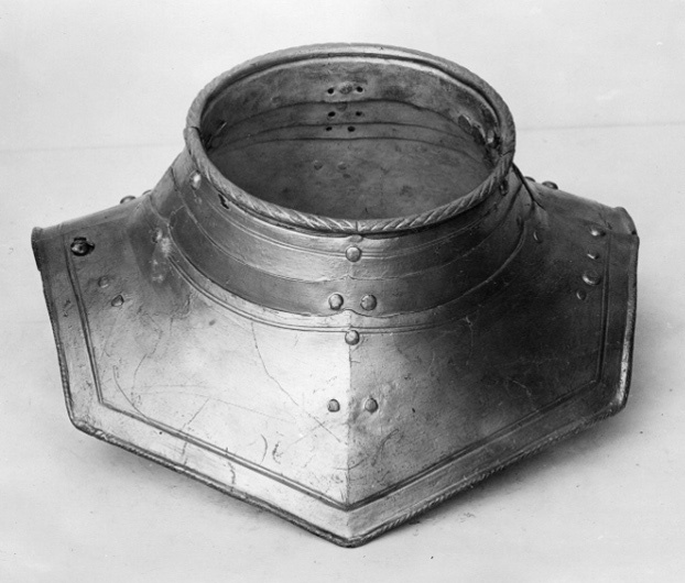1600-talets första hälft. Senare renoverad. Av stål, utsidan målad i silver och insidan i grått. Sammanlagt åtta delar. Bestående av en främre och en bakre halva av fyra skenor vardera. Överst cirkulär halsöppning av två skenor, kanten omvikt inåt och rundsmidd med tät repstavsfilning. I dessa är fästat två mindre och en större skena med spetsig mitt. Ursprungligen fästade i varandra med läderband men dessa är bortplockade och ersatta av nyare statiska nitar. Kragens två halvor öppningsbara genom ett gångjärn i vänstersidan. Låsbar i högersidan i översta skenorna med två tappar genom hål och i nedersta genom utstående nit och hak-hål. Skenornas övre kant uppdragen i tre spetsar med filad dubbel kantlinje. Nedersta större skenan har omvikt repstavsfilad kant, försänkt bård och enkel kantlinje. På framsidan prickpunsad märkning KH.