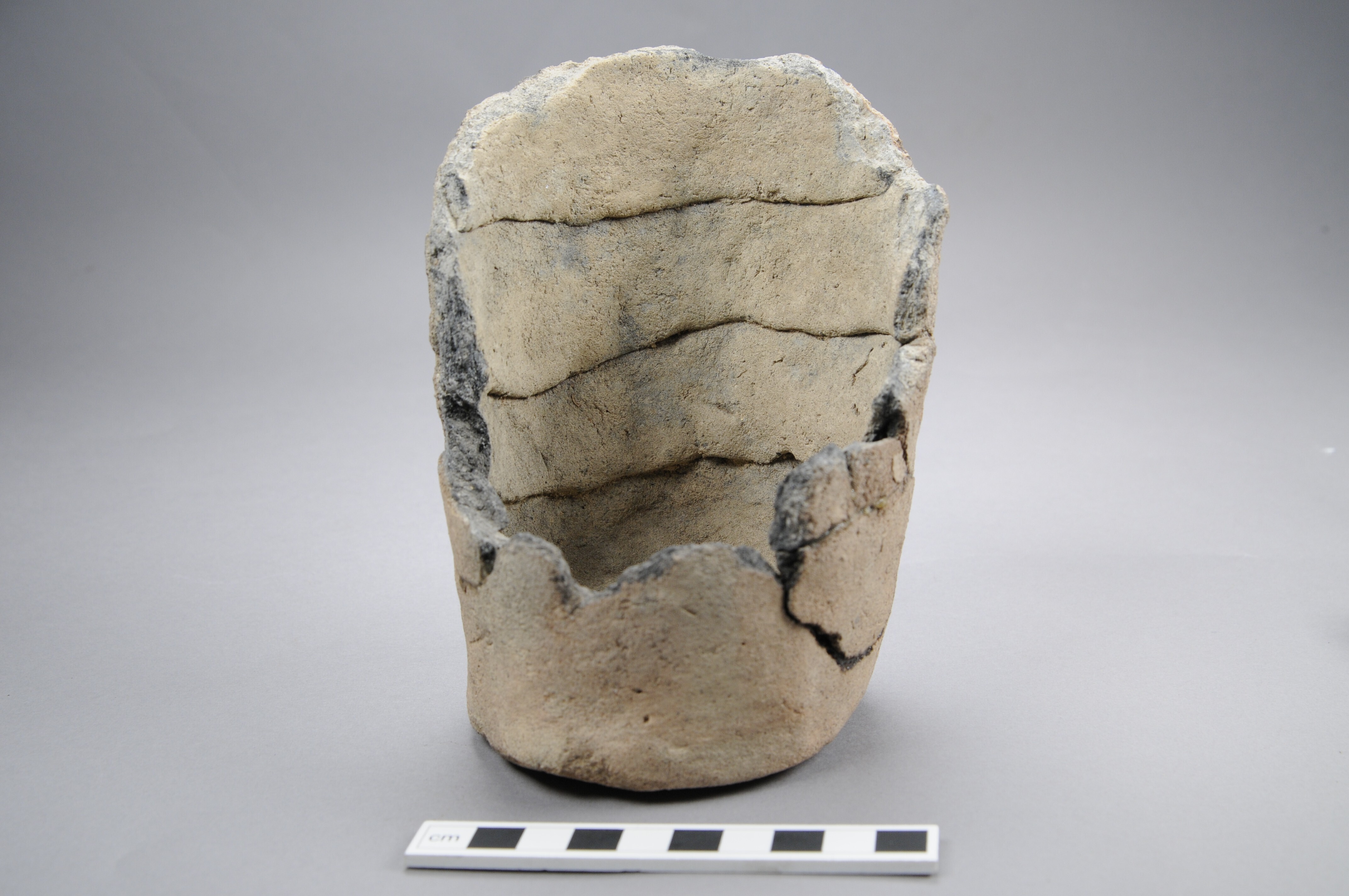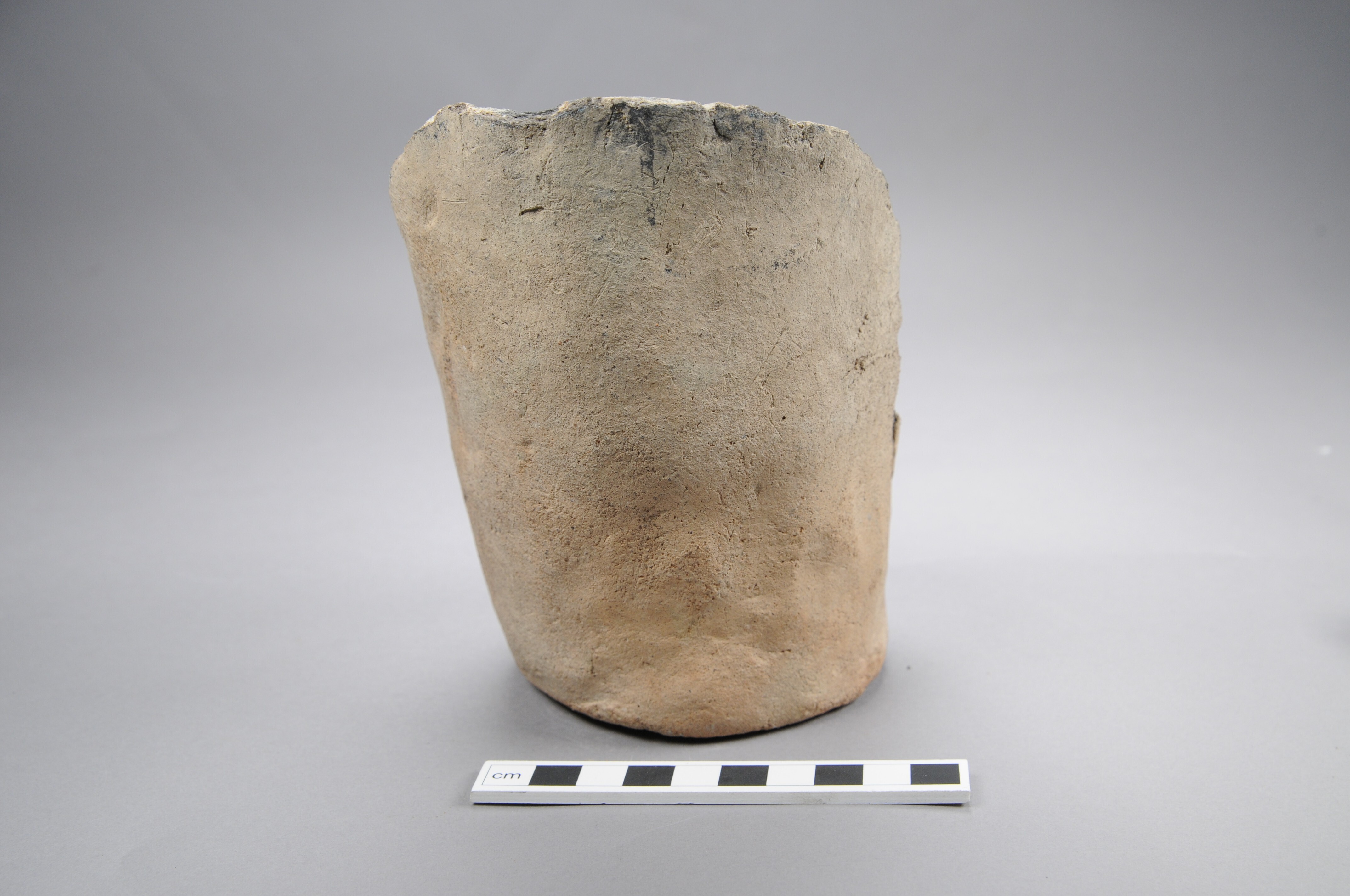 högt och smalt kärl, något skevt. mynning saknas. tillverkat av 30-40 mm höga lerremsor som inte har sammanfogats på kärlets insida med en ansats av N-teknik där remsans utsida har dragits uppåt och insidan nedåt. Botten är tummad, tjock och flat. oxiderat bränd. naturlig magring? odekorerat. slät yta