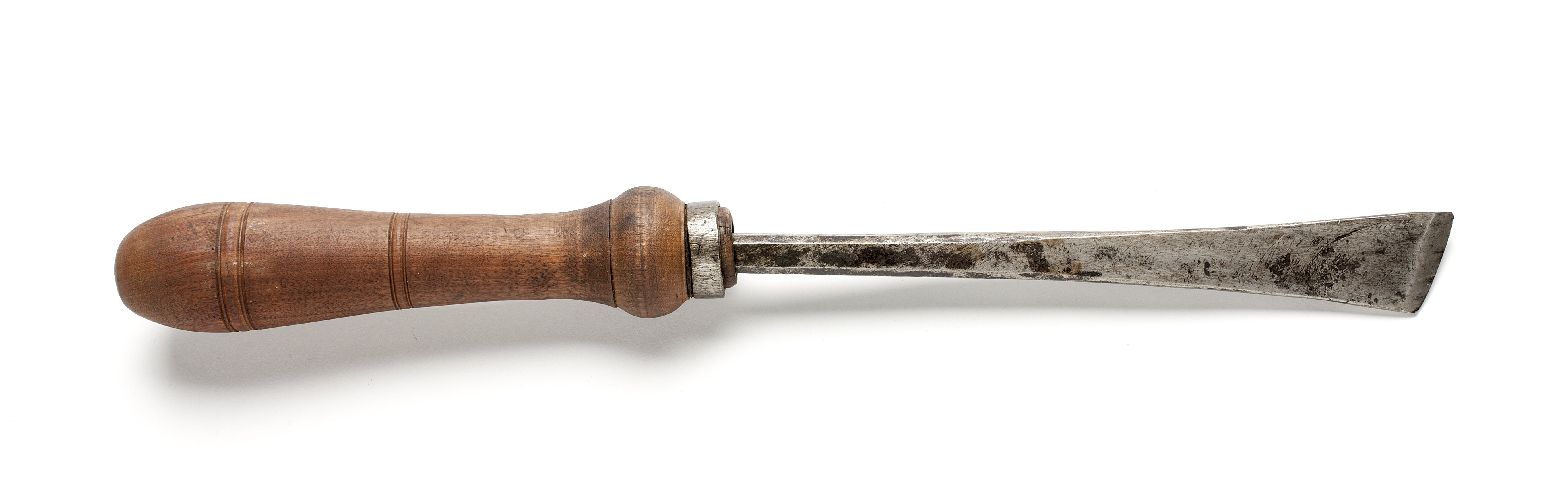 Klinga med rektangulär genomskärning, avfasade kanter. Sned egg. Svarvat skaft av björk med förtjockning nedtill. Stålring.
