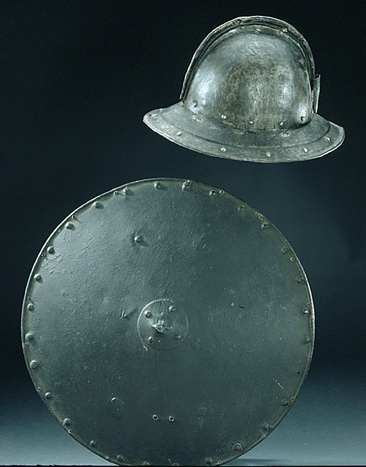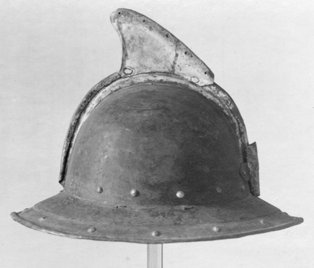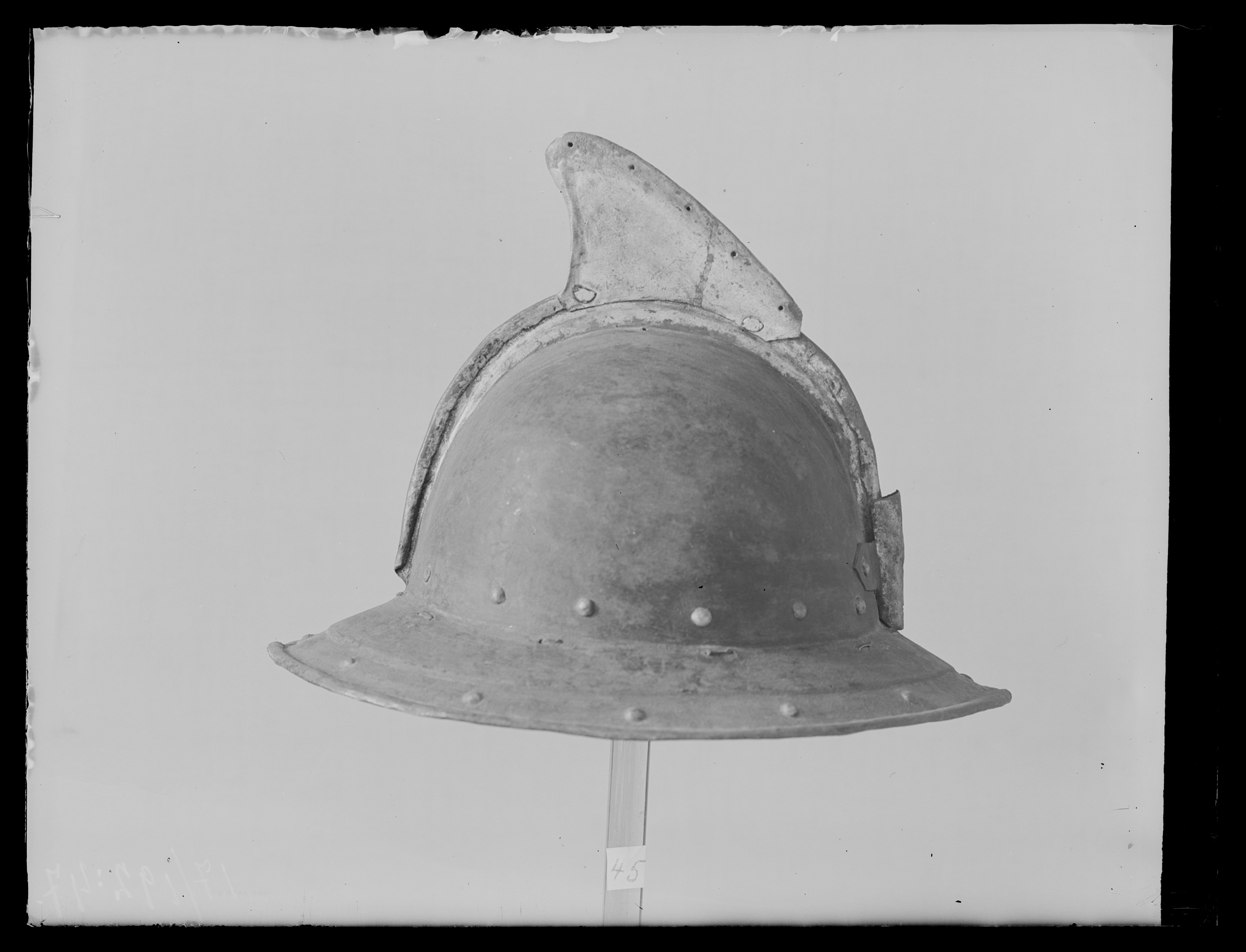 Av driven stålplåt; utsidan blankslipad; med nederkant och kamkant; insidan med slagmärken. Hjälm bestående av två halvor, sammanfogade i en längsmed klockan löpande kam, omvikt och förstärkt. Klockan rundad. Nertill övergår klockan i ett brätte, något neddraget med invikt rundsmidd kant och försänkt bård med falska uppdrivna nitar. På klockan baktill en plymhållare, nedåt avsmalnande med spetsigt tillklippt överkant och tre hål, fäst med två nitar. I klockan nertill på var sida nitar i rad. I kanten där brättet möter klockan är en rad av små slagna hålpar hela vägen runtom. Under 1700-talets senare del och fram till sent 1900-tal var hjälmen försedd med en nitad dekoration i form av en trekantig något framåtsvängd vinge av bleckplåt, av två halvor fäst i kammen med tre nitar.