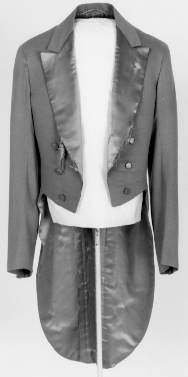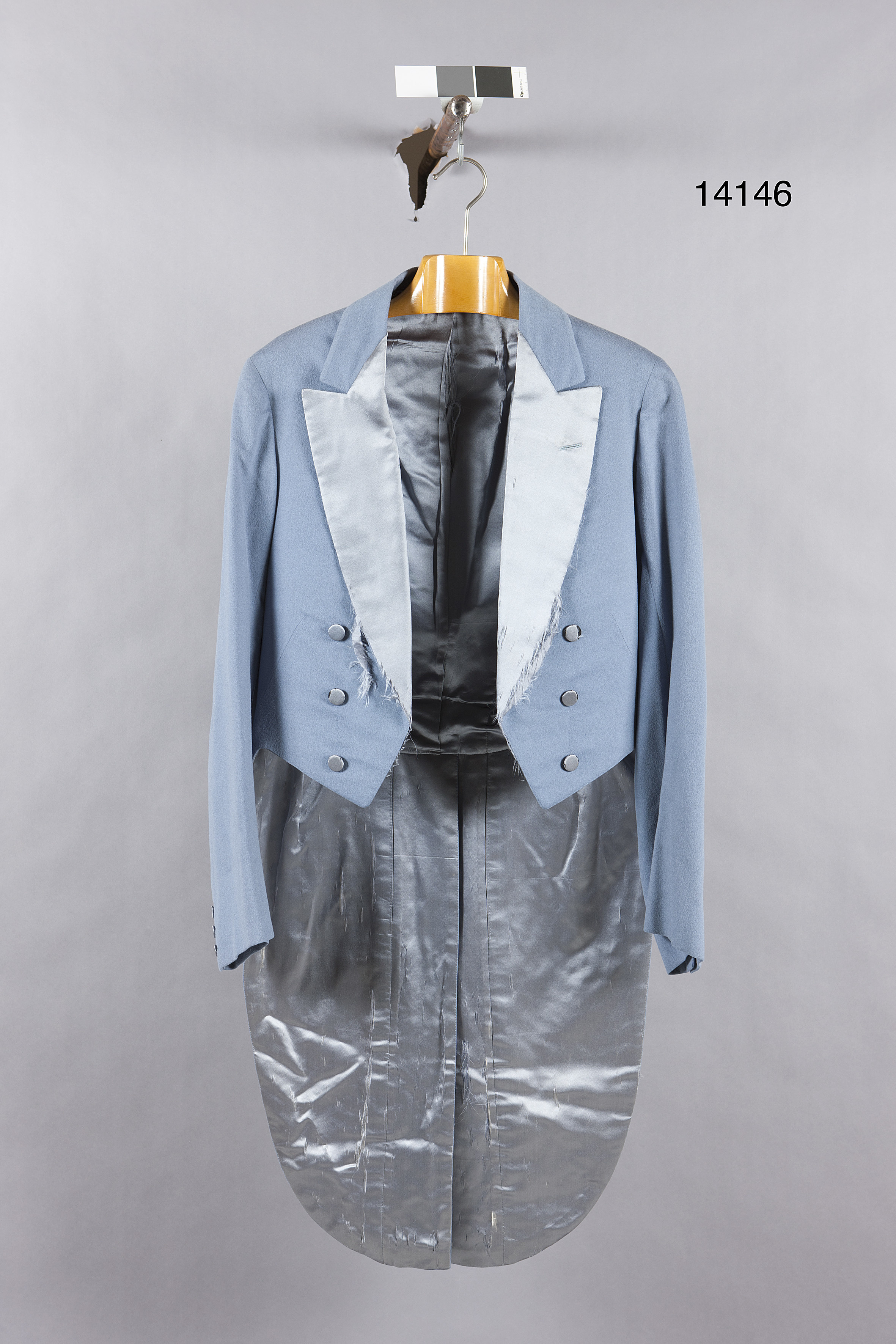 Frack av ljusblått tunt kläde med sidenklädda slag. På det vänstra ett genombrutet knapphål. Två rader plana knappar klädda med ljusblått siden. Ärmarna med tre små knappar lika föregående. I livsömmen mitt bak två knappar. Foder av ljusblått siden. Två innerfickor. I den vänstra innerfickan firmaetikett: "J.M. JANSSON & WALLGREN)) KGL OCH KEJSERL. HOFLEVERANTÖR)) 2-2 STOCKHOLM 1911)) H.K.H. Kronprinsen.