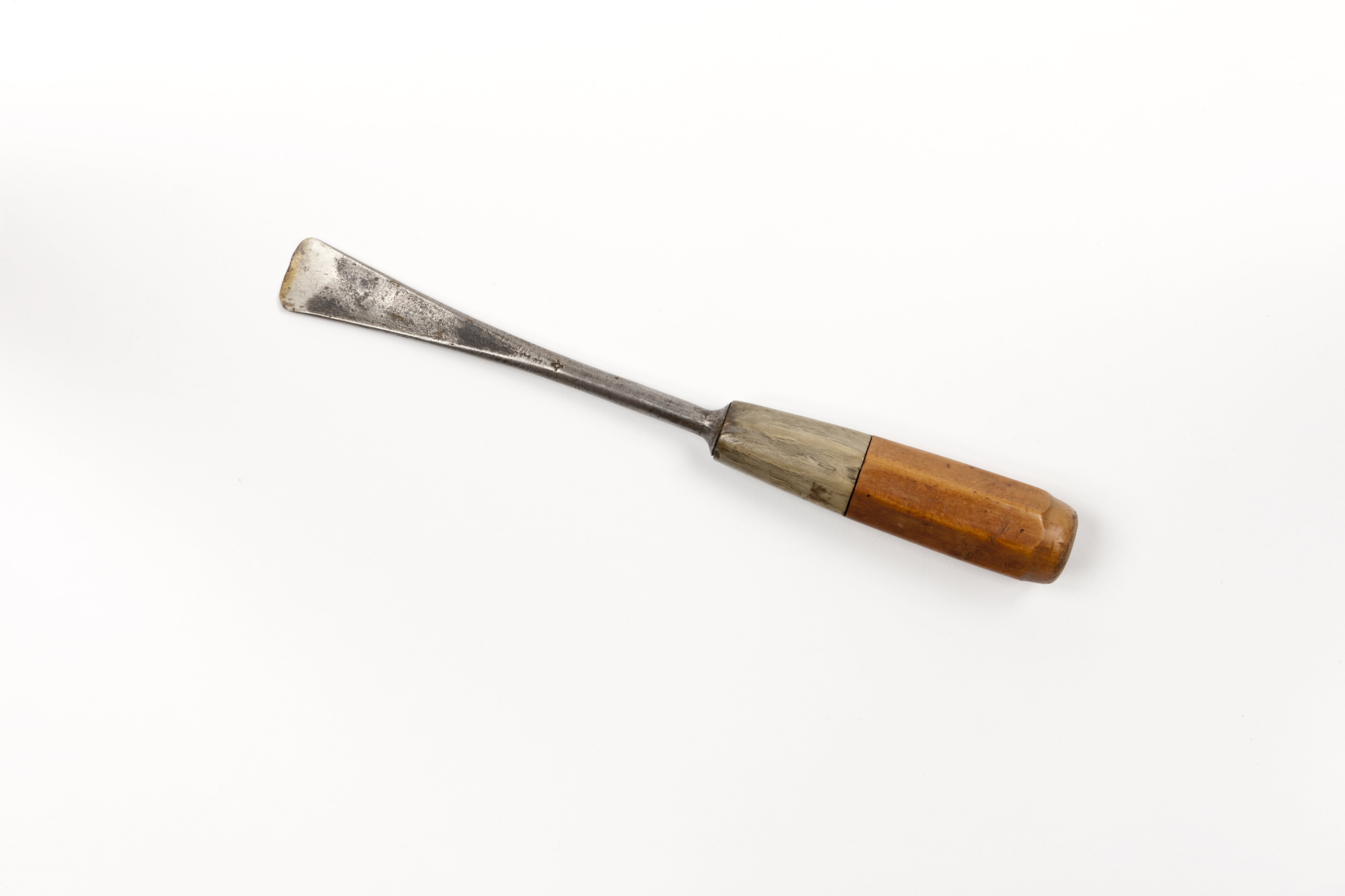Bildhuggarjärn: rak skölp. Rund klinga. Tillplattad ände med rundad undersida och svagt hålig ovansida. Rundad egg, slipad från undersidan. Vidgad bas. Skuret, åttasidigt skaft av buxbom. Hornring. Stämplat på klingan: ring med fyra vingar.
