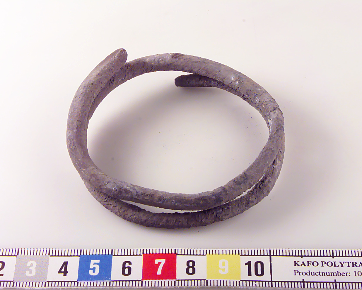 Rundad ten lagd i två varv. Spiralvriden ornamentik. Korroderat ytskikt.