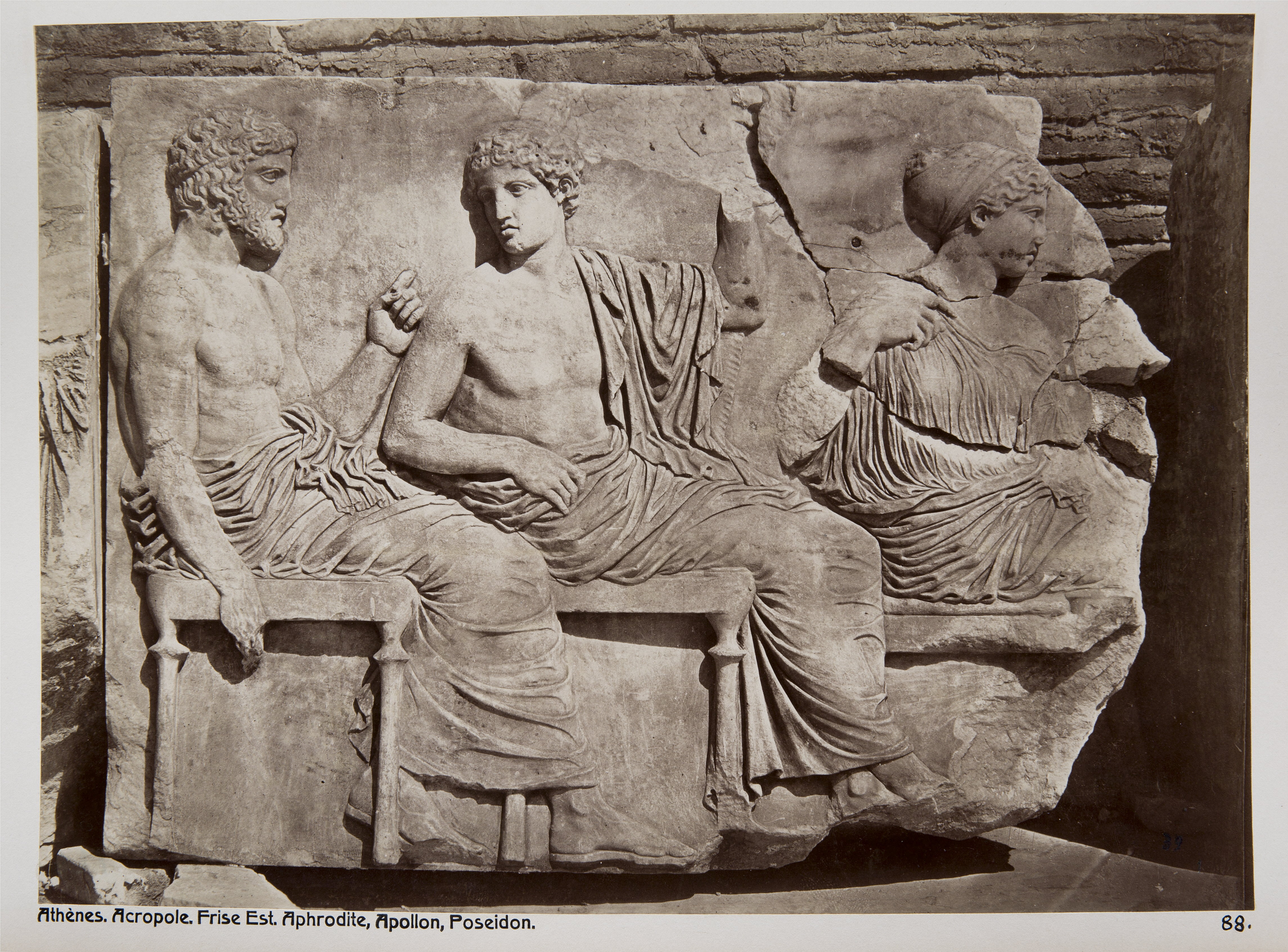 Fris med Aphrodite, Apollon och Poseidon från Parthenontemplets östra del på Akropolis i Aten, Grekland. Text på originalet: "Athènes. Acropole: (Parthénon): Frise Est. Aphrodite, Apollon, Poseidon." Foto från resa genom Grekland, Makedonien och Serbien, 15 mars-6 juni 1896. Fotografierna LXVI:K.18.-147. är köpta av Wilhelmina von Hallwyl, f. Kempe på Korfu samt i Patras, Nafplion, Aten, Thessaloniki och Belgrad. Med på resan var maken Walther von Hallwyl och fröken Ida Uhse. Uppgifterna kommer från Ida Uhses reseanteckningar.