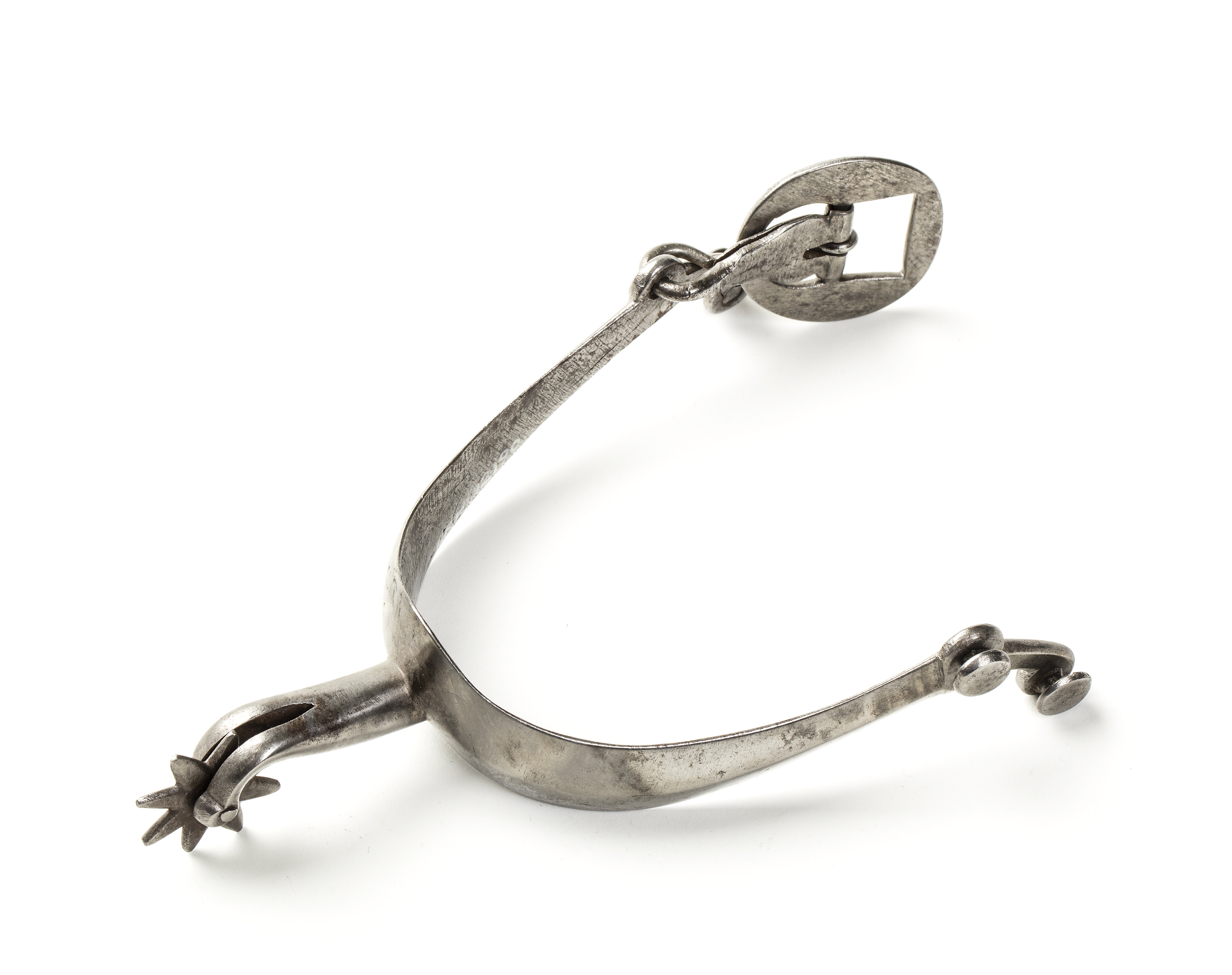 Spännsporre av slätt stål med breda u-formade skänklar med svagt antyden mittås.Ytterändarna svagt nedåtböjda med vardera två knappformiga hållare på hals. Den enaskänkeln med rund grov sölja av stål. Mitt bak hals nedåtböjd i ytteränden. Klingaåttauddig, d: 26 mm. Tureholm