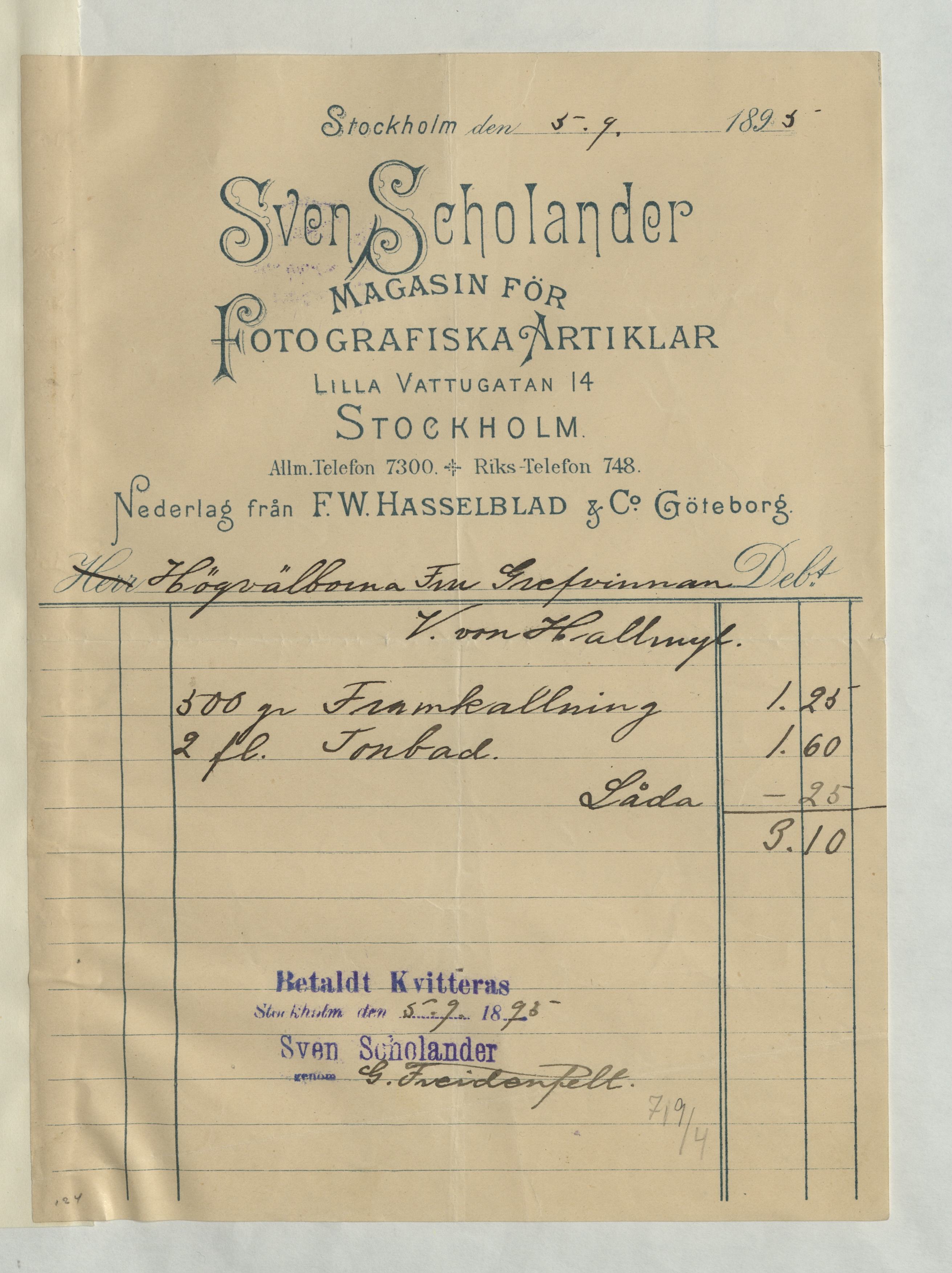 Kvitto från Sven Scholander, Bildhuggeriaffär för fotografiska artiklar till Grevinnan von Hallwyl. 3:10Kr betalt, Stockholm 5 september 1895.