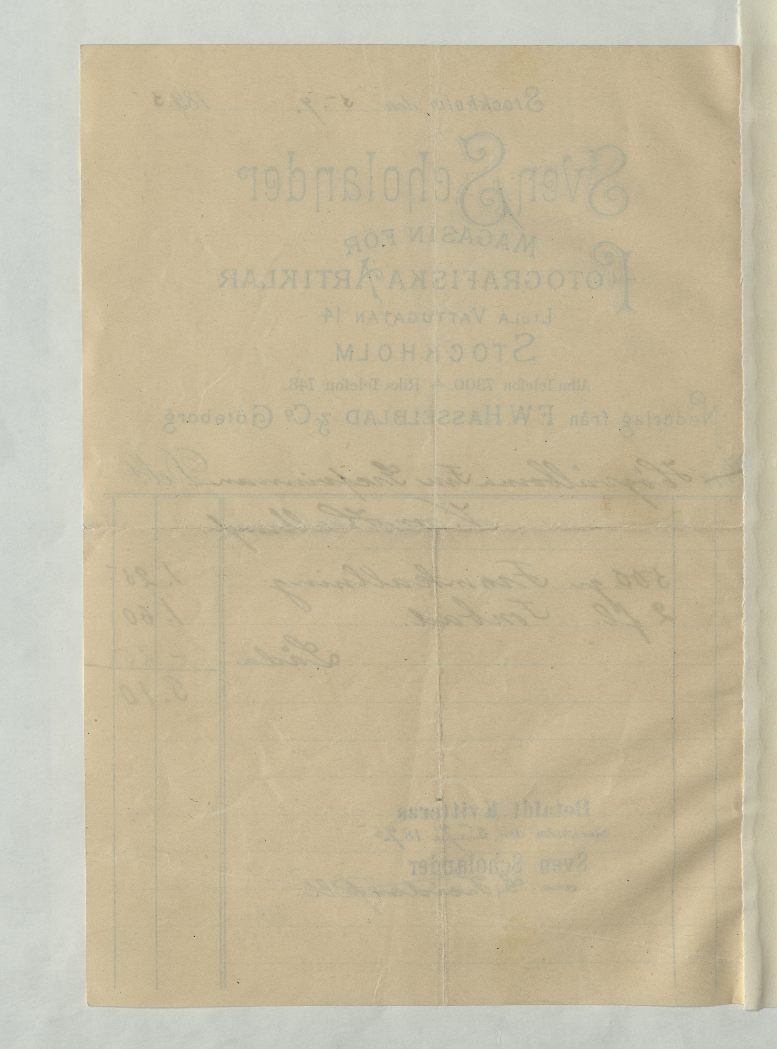 Kvitto från Sven Scholander, Bildhuggeriaffär för fotografiska artiklar