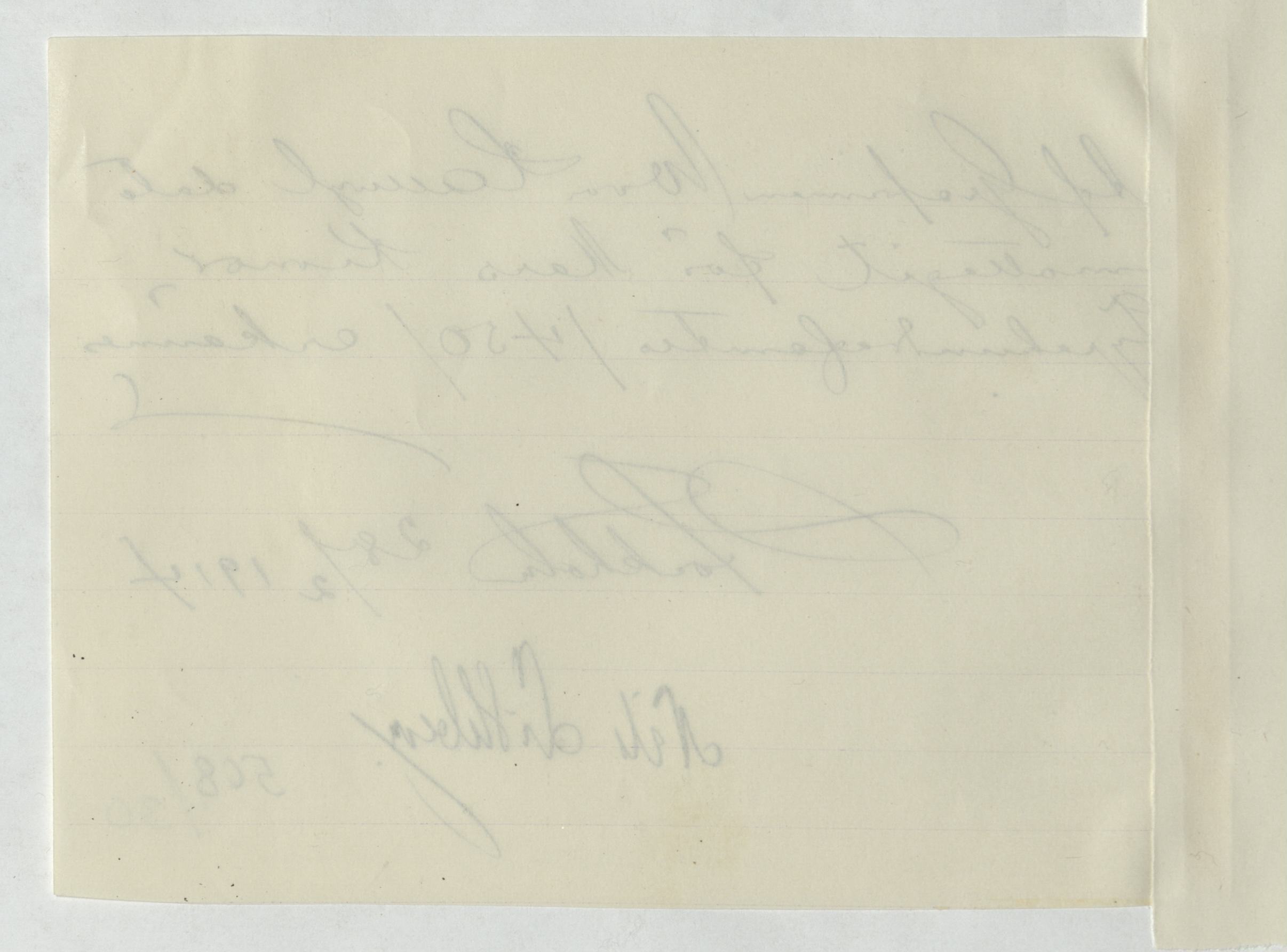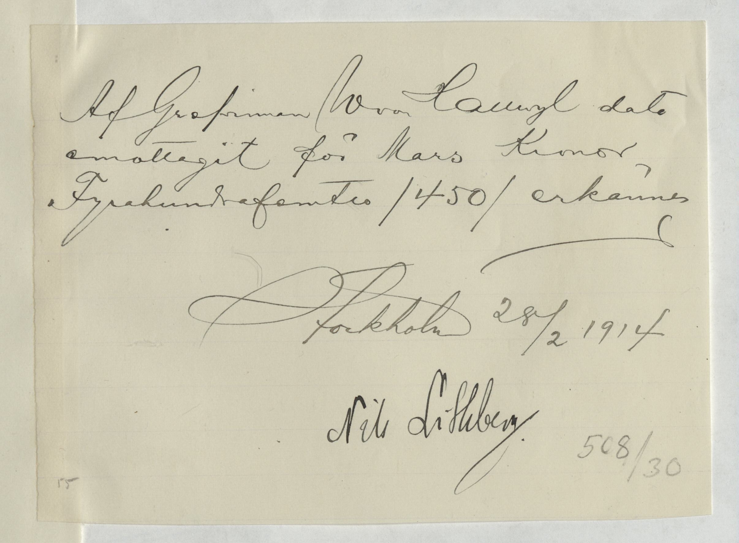 Kvitto gällande pengatransaktion mellan Wilhelmina von Hallwyl och Nils Lithberg. Stockholm, 1914.