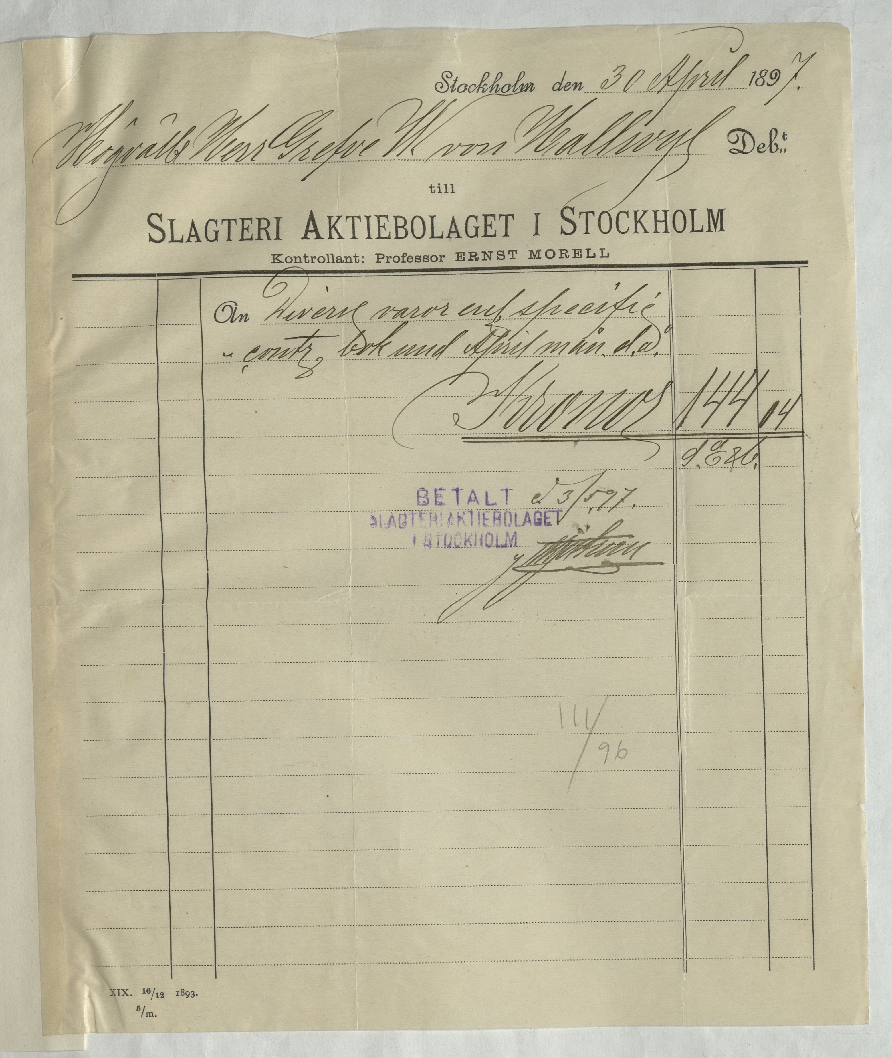 Kvitto från Slagteri Aktiebolaget i Stockholm