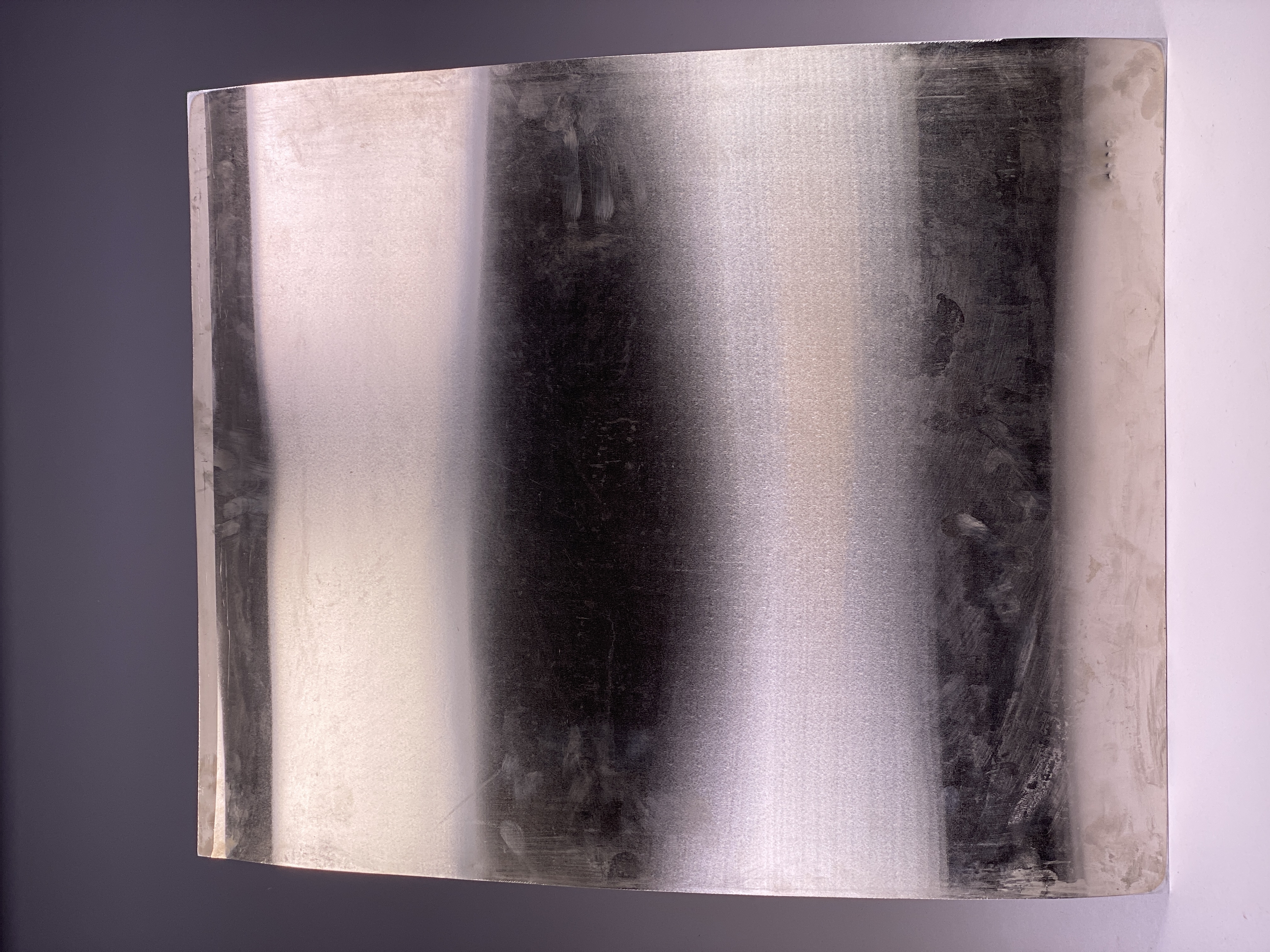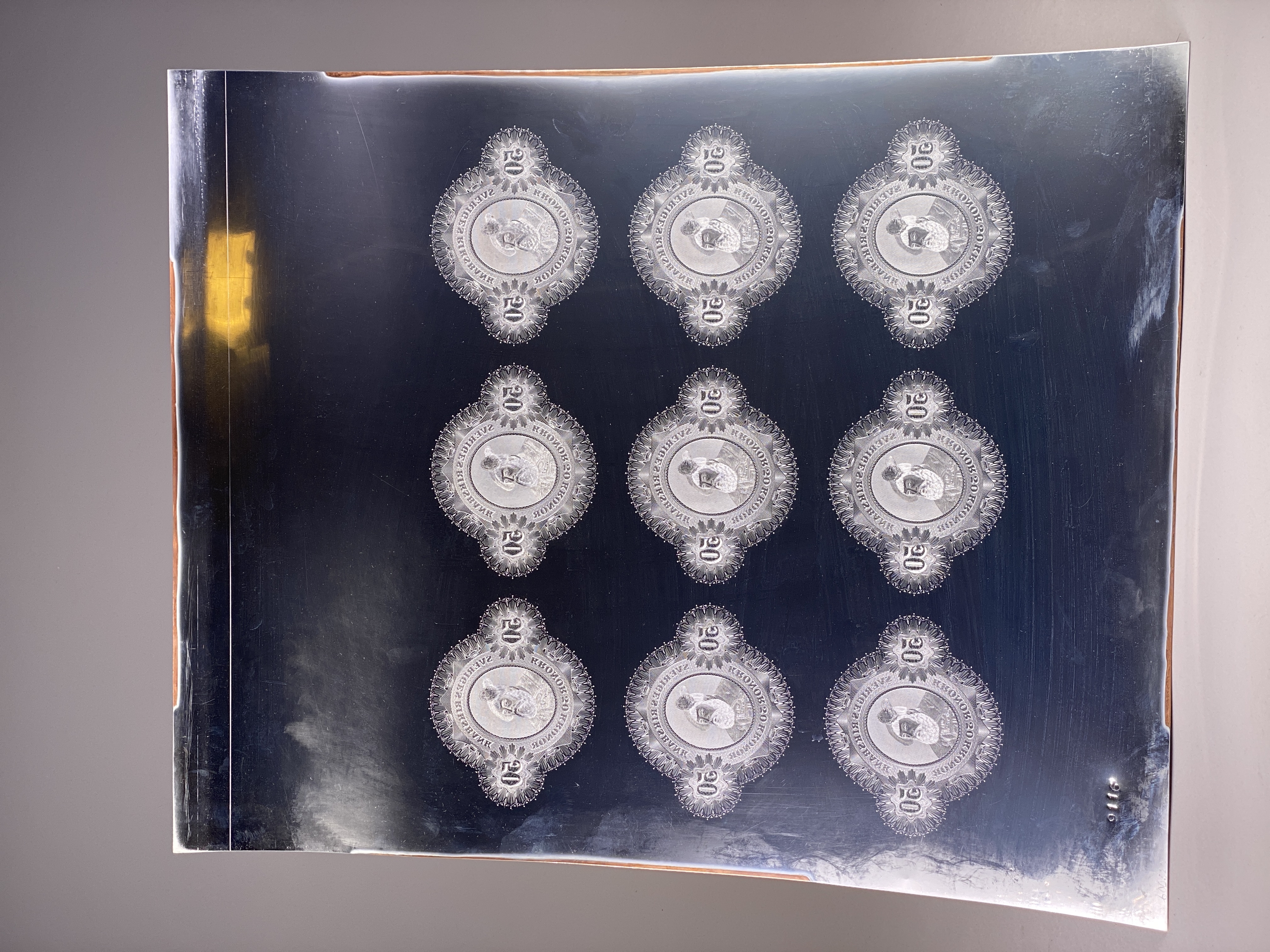 Tryckplåt för baksidan av femtiokronorssedel. Med tillhörande kuvert. Stor och rektangulär plåt med plats för nio stycken sedeltryck, tillverkad i rostfritt stål och koppar. Framsidan med gravyr föreställande Gustav Vasa. Plåten stämplad: "9116", samt med senare inskrift: "600520".