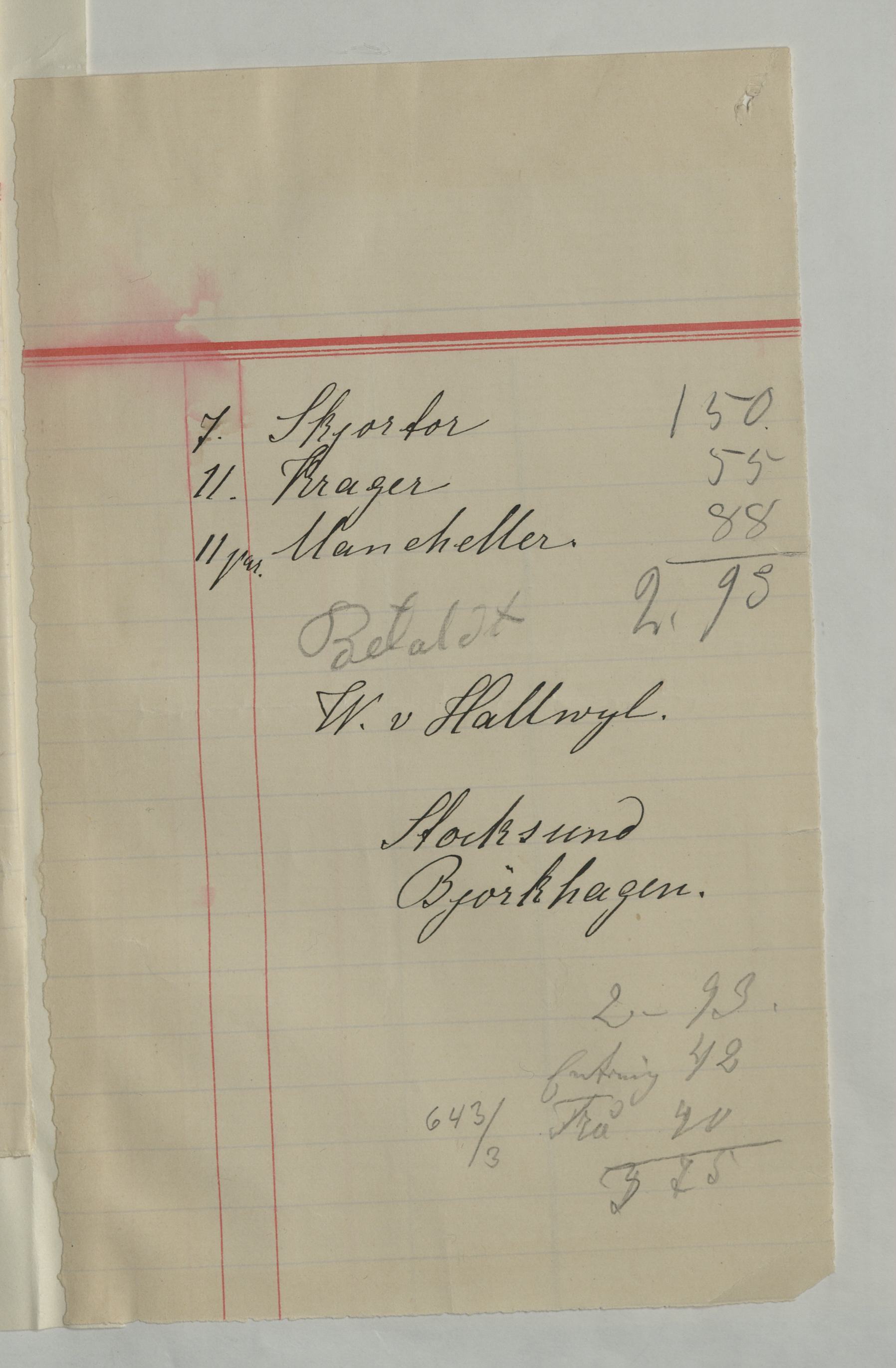 Kvitto från Fru Pettersson, Skjorttvätt, för 7st skjortor, 11 manchetter och 11 kragar. 2:93Kr betald av Greve Hallwyl. Odat.