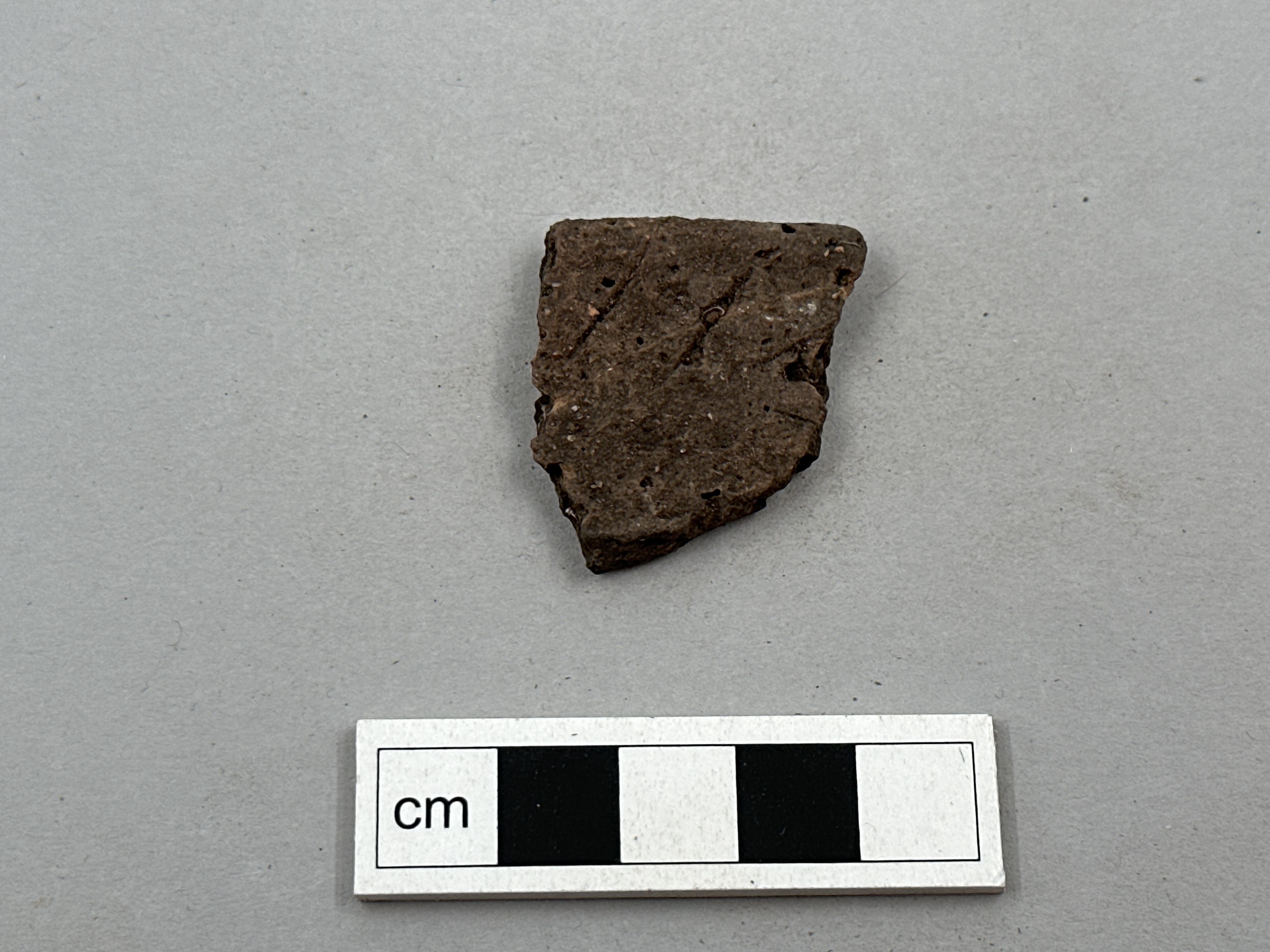 Gättad poröstgods fragment med snedställd linjedekor.