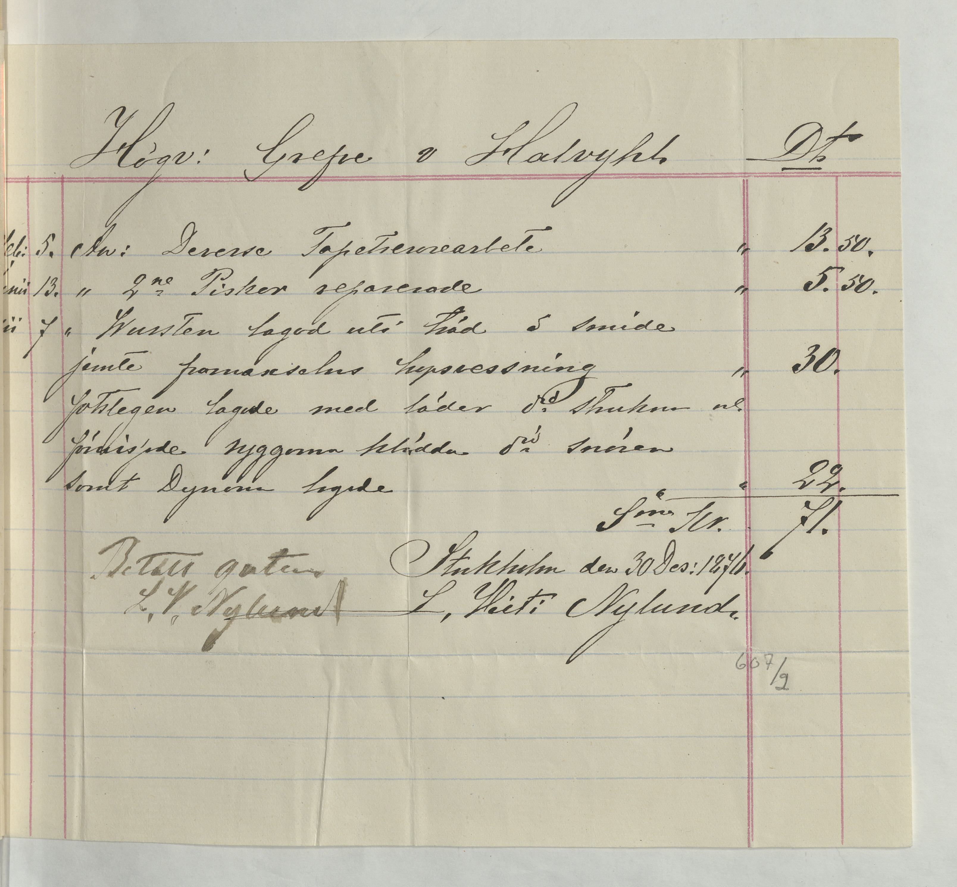Kvitto från Victor L. Nylund, Sadelmakare, på en summa av 71Kr. Stockholm 30 december 1876.