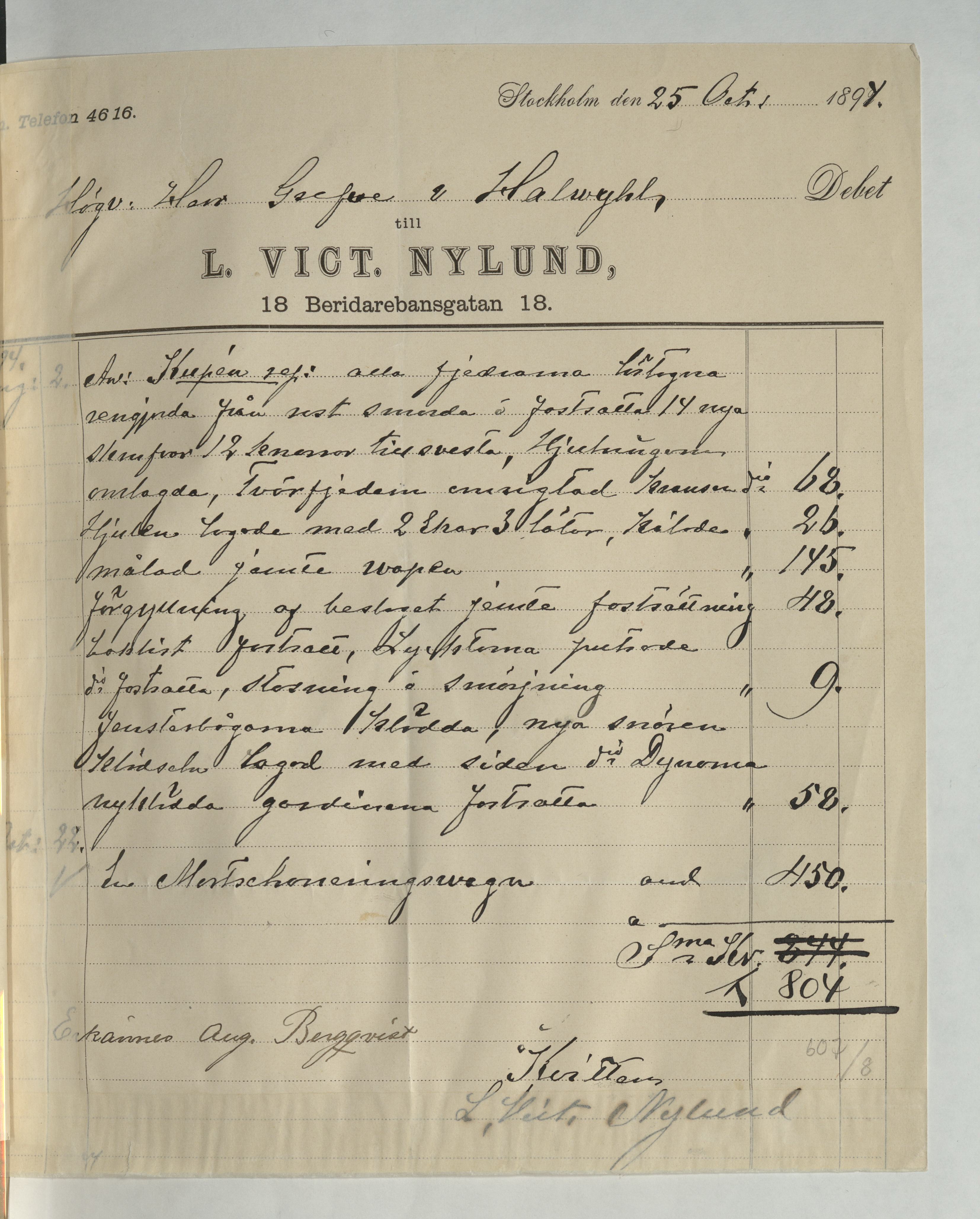 Kvitto från Victor L. Nylund, Sadelmakare, på en summa av 804Kr. Stockholm 25 oktober 1894.