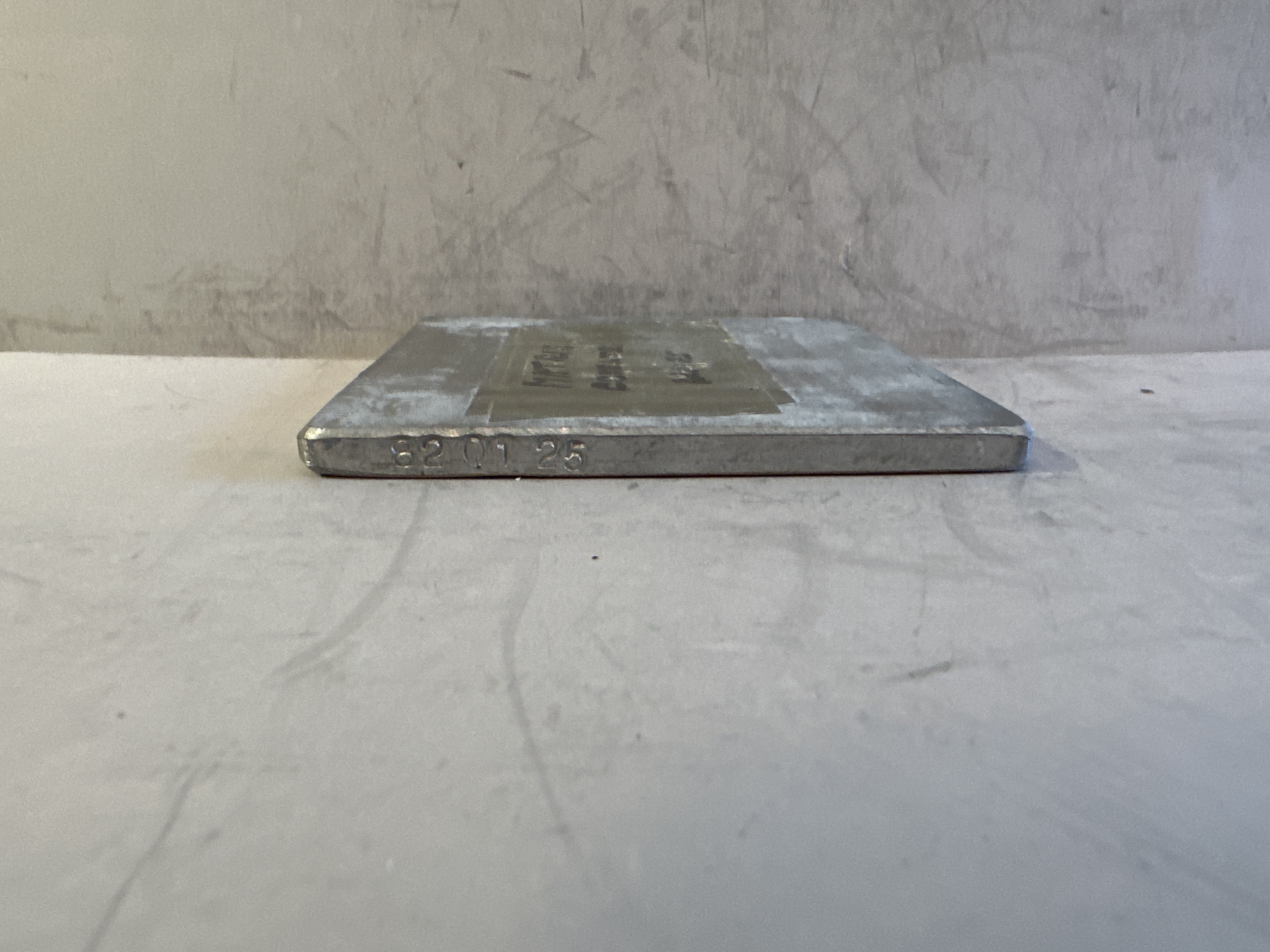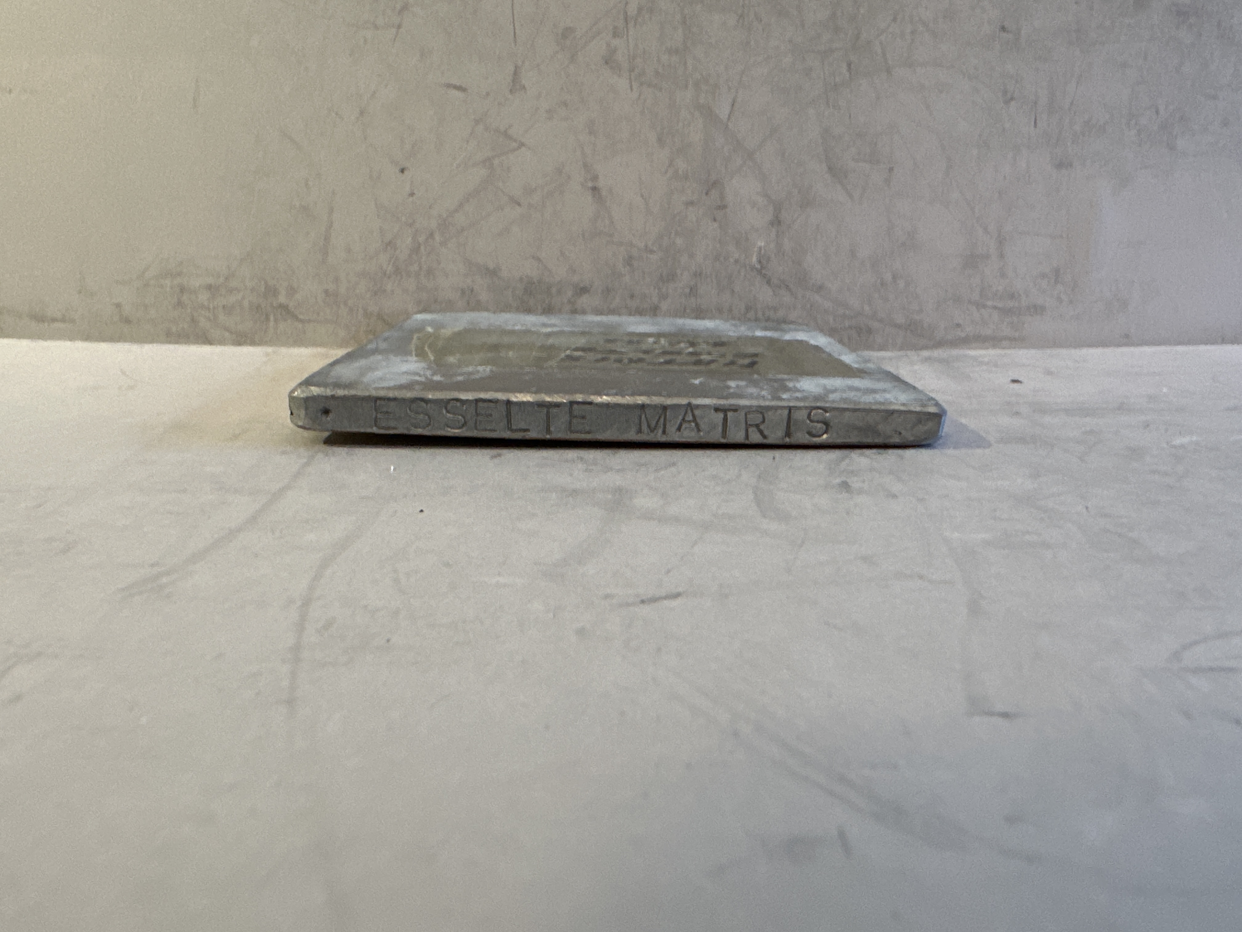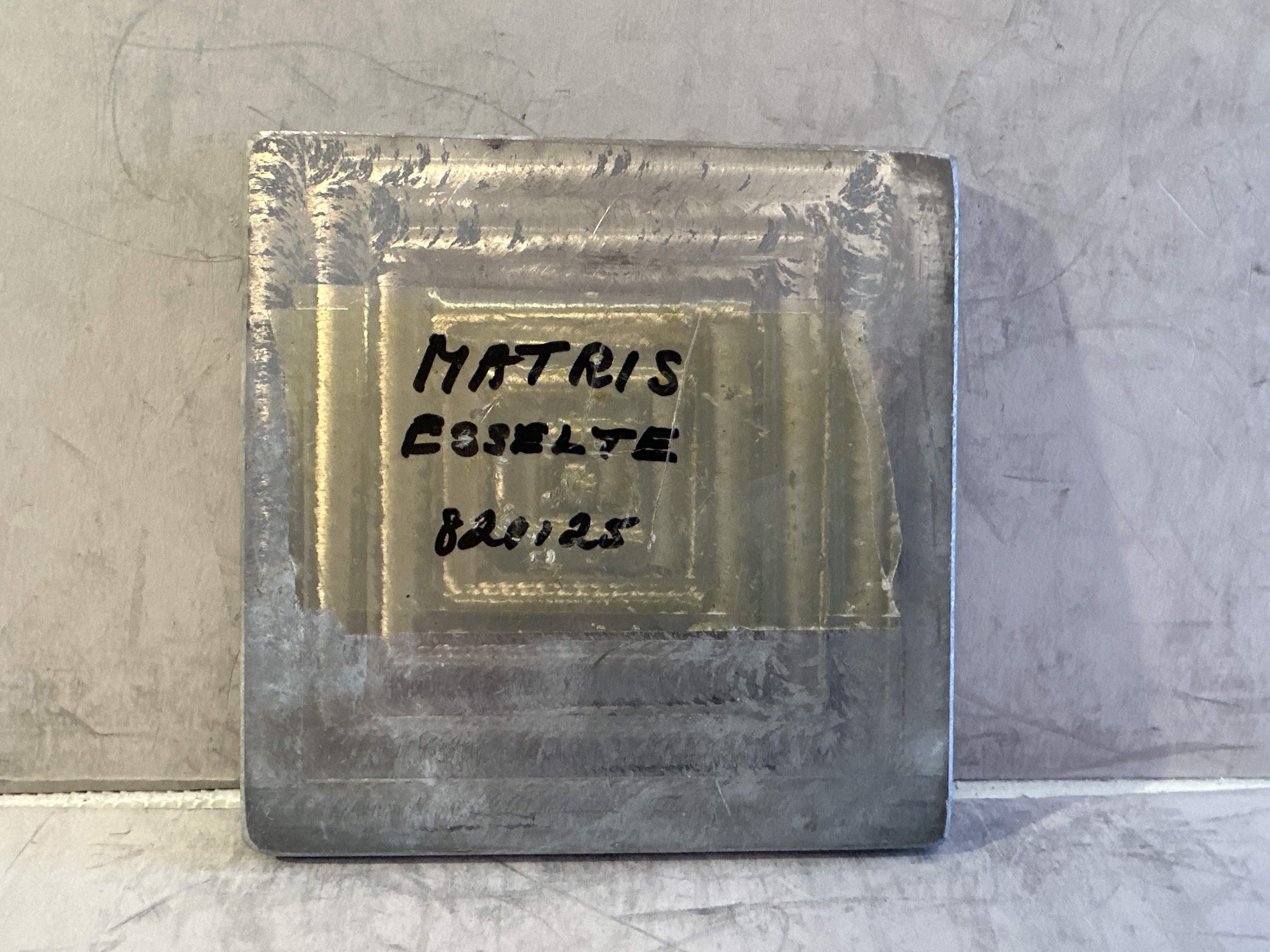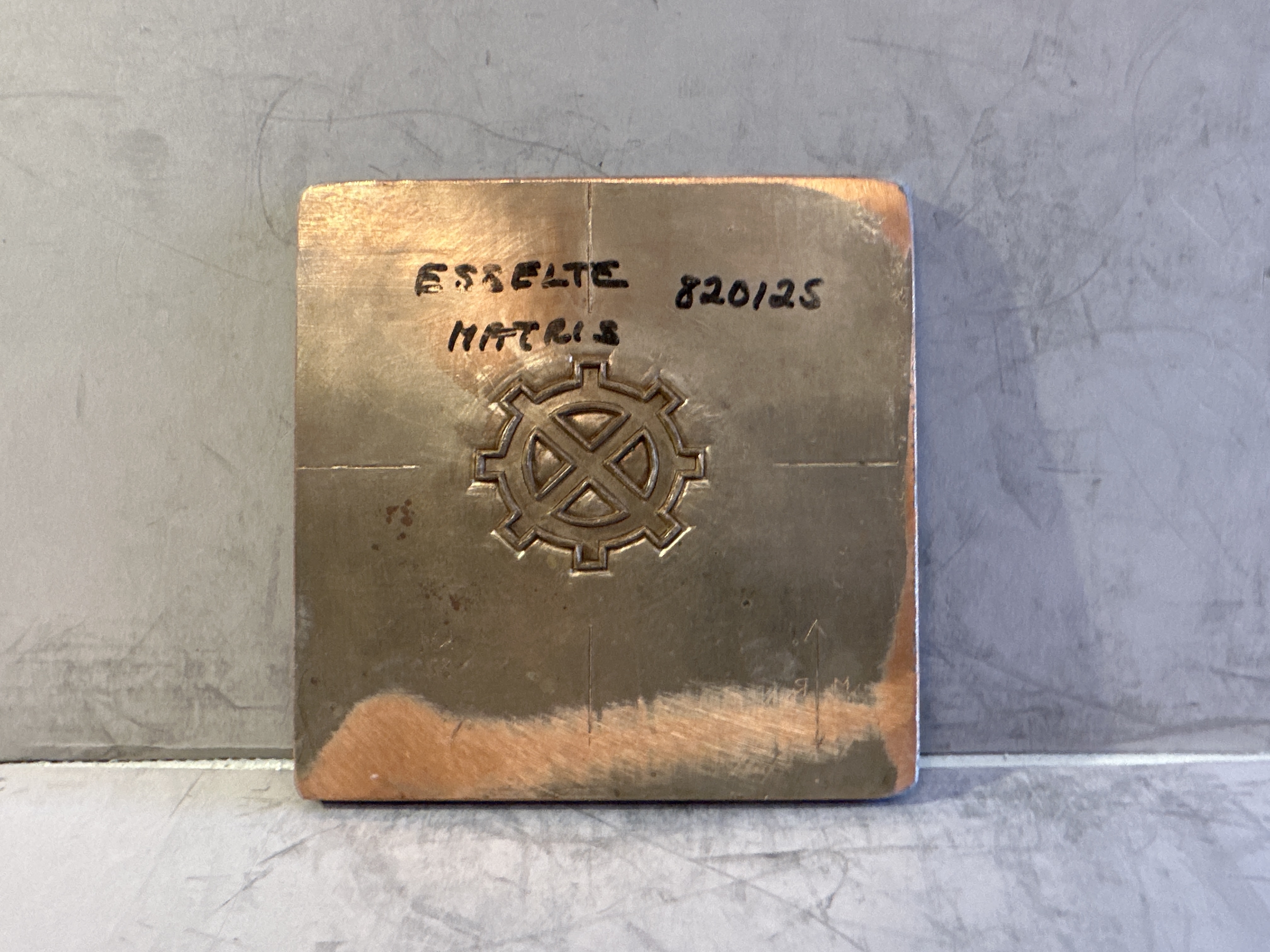 Pressplatta för vattenmärkestillverkning. Plattan tillverkad i bly och koppar, med motiv föreställande kugghjul. Plattans framsida med påskrift i tusch: "ESSELTE MATRIS 820125". Plattans baksida med påskrift i tusch: "MATRIS ESSELTE 820125". Plattans sidor med två inskrifter: "ESSELTE MATRIS" samt "820125".