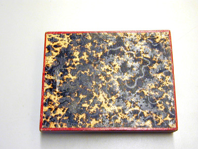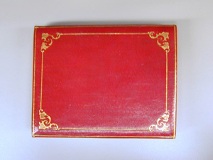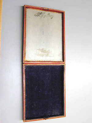 Rektangulärt etui av trä med svagt fasad kant på locket. Utvändigt klädd med rött skinn, dekor i guldpressning i form av kantiljer på lock och sidor samt inre rektangel med hörnornament på locket. På undersidan klädd med skinnimitation av mönsterpressat papper i brunt och gult. Fjäderlås av gulmetall. Locket invändigt klätt med ursprungligen vit sidenatlas, kantbård av guldpapper upptill stämplat med svart färg: "B E Fogelberg", nertill rester av fastklistrad etikett. Underdelen invändigt klädd med violett sammet.