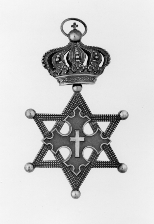 Stjärna av förgyllt silver(?), sammansatt av två punktdekorerade trianglar med kulor på spetsarna (Davidsstjärnan). Därpå lagt ett likarmat kors med spetsiga, tretungade armar, därpå ett latinskt kors i relief. Baksidan slät. Vid den övre spetsens kula fäst med scharner en kunglig krona, igenom äpplet draget en bandring.