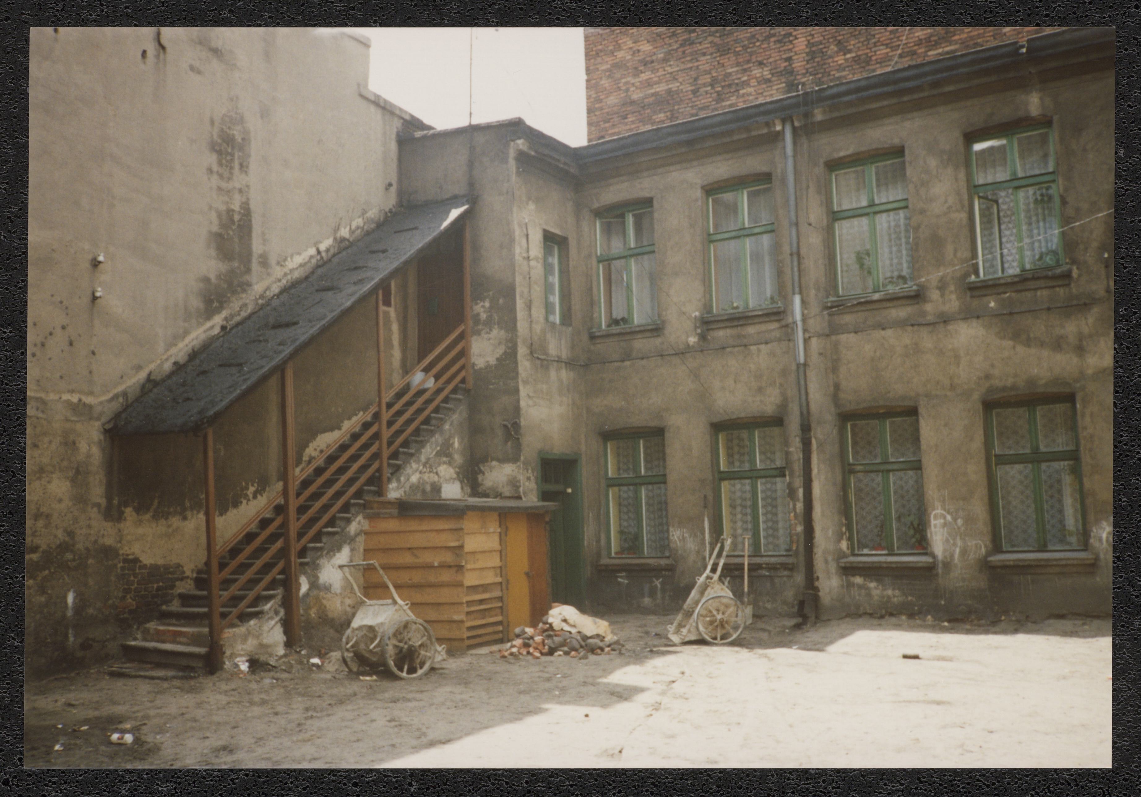 Fotografi taget i samband med Rosa Gelbarts resa till hemstaden Pabianice i Polen 1993. Bilden föreställer barndomshemmet på Warshawska 84.