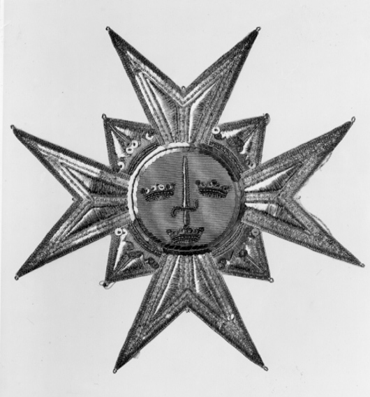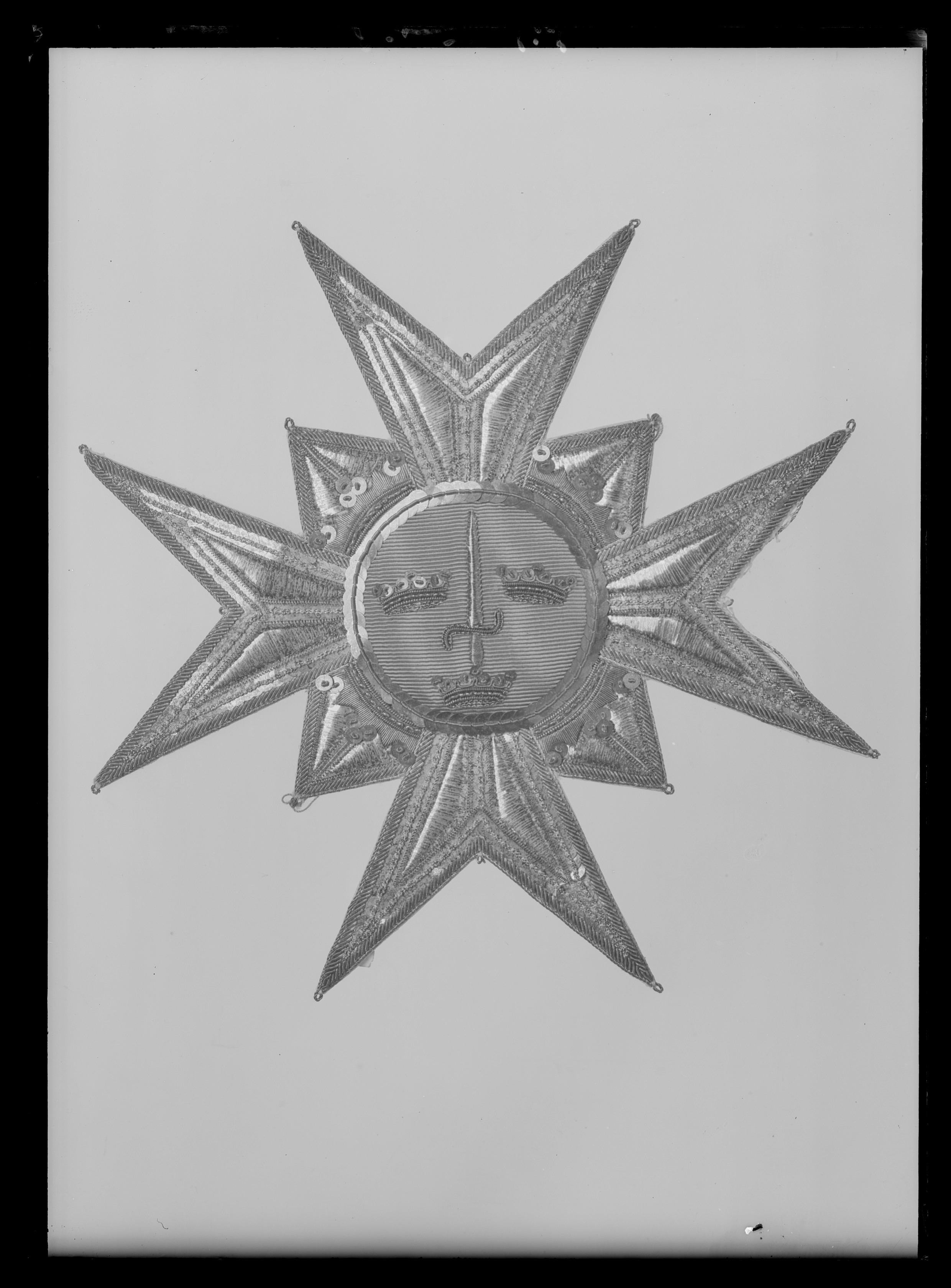 Malteserkors broderat med silverlan -paljetter och -kantiljer. Mellan korsarmarna vinklar, broderade med silverlan och -kantiljer därpå öppna kronor broderade med träd, kantiljer och paljetter av förgyllt silver. Svagt välvd medaljong täckt med ljusblå sidenmoaré därpå broderat, svärd med klinga av silverlan och fäste av träd och kantiljer av förgyllt silver, tre kronor och kantring av kantiljer och paljetter av förgyllt silver. På baksidan vitt papper, påskrift med bläck: "Har burits av // Axel Gustav von // Arbin, + 1856. // gåva av hans son // Axel Gustav von Arbin till Erik Te // strup 23/10 1943".