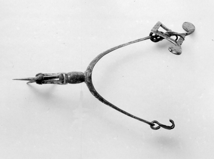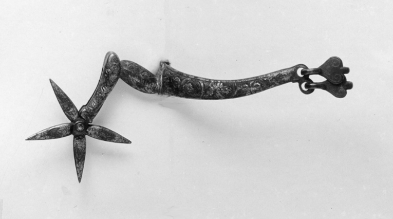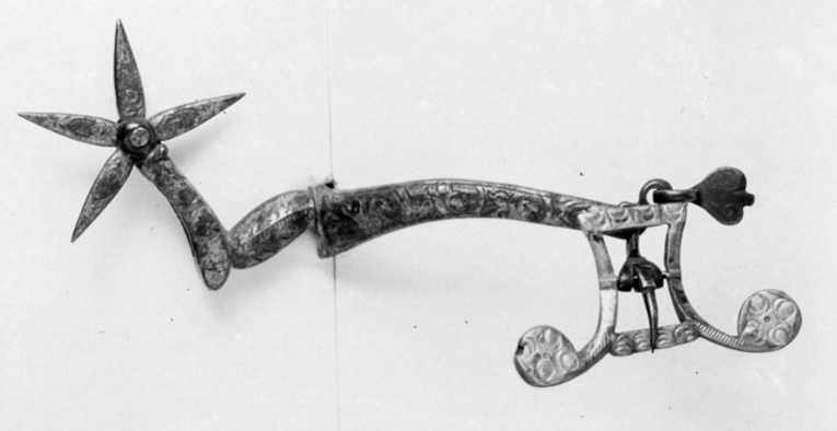 Sporre av stål med yttäckande, punsad ornering och påslaget silver och guld. U-formade,något uppåtböjda skänklar med två ringformiga hållare i ändarna. I den ena två hakar i den andra en hake och en stor, rektangulär remsölja av försilvrad och förgylld mässing. Söljan med två kraftigt volutformigt utdragna hörn. Hals, vinkelformigt nedböjd, delen närmast skänklarna spolformig. Klinga stor femuddig.