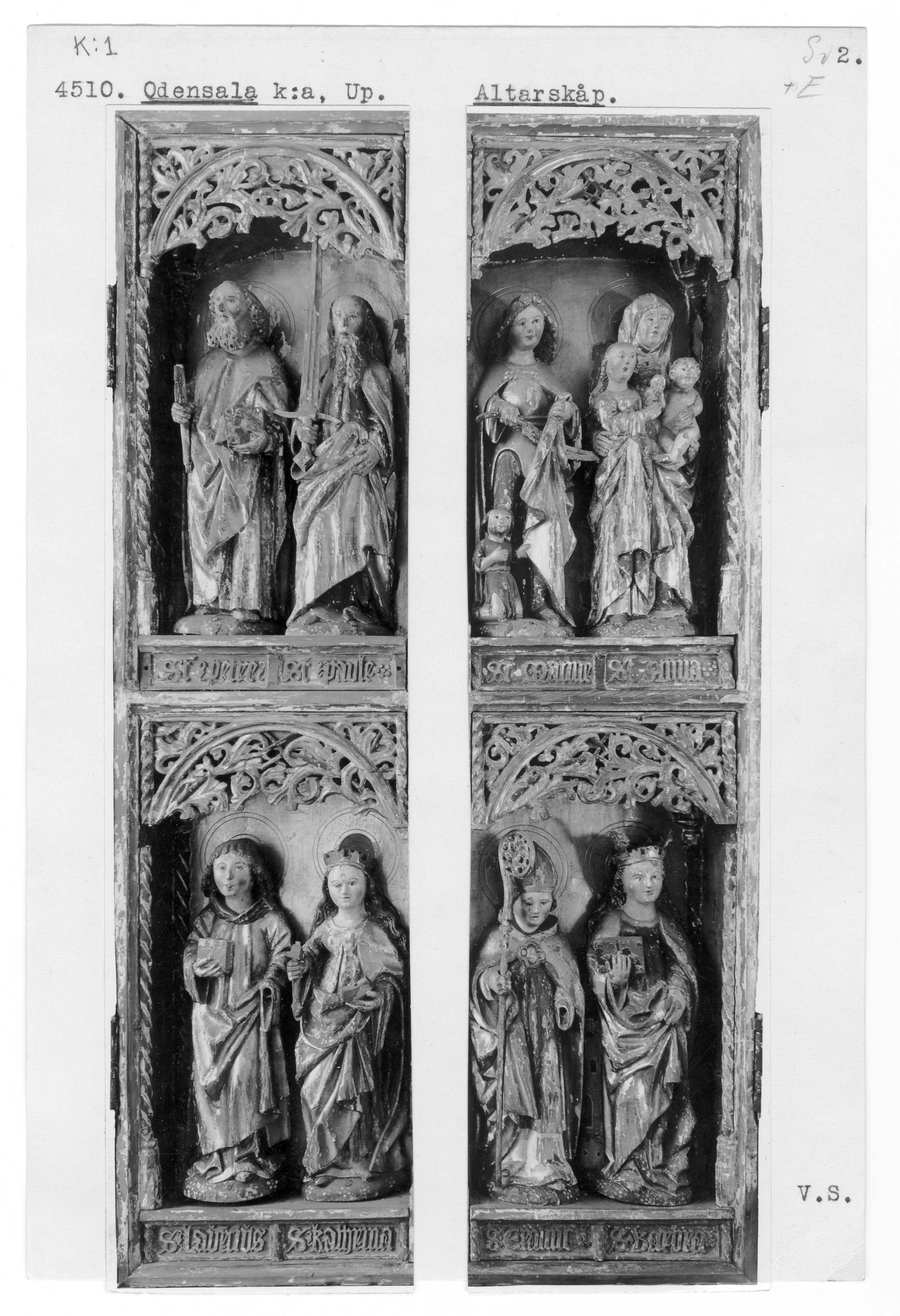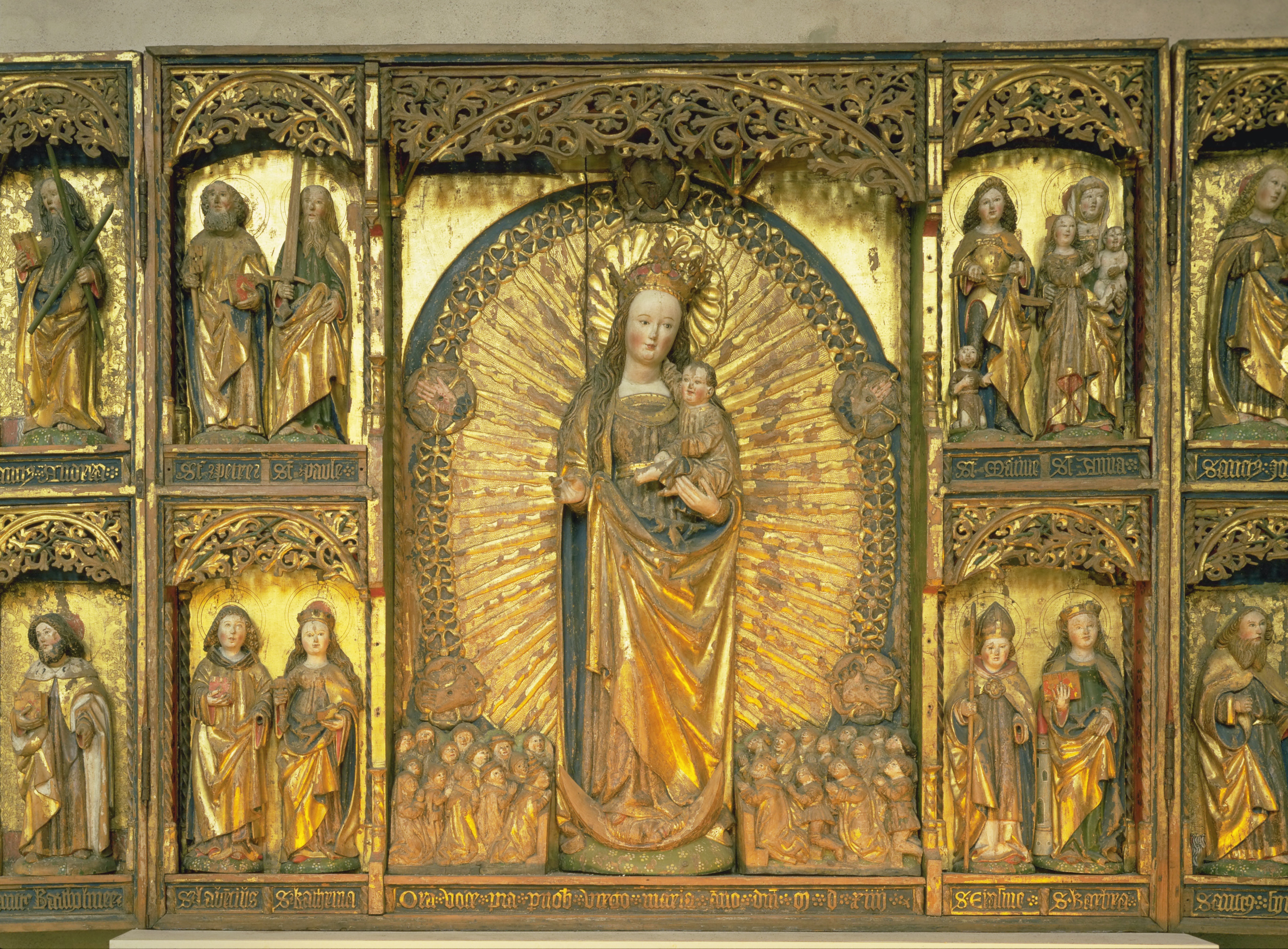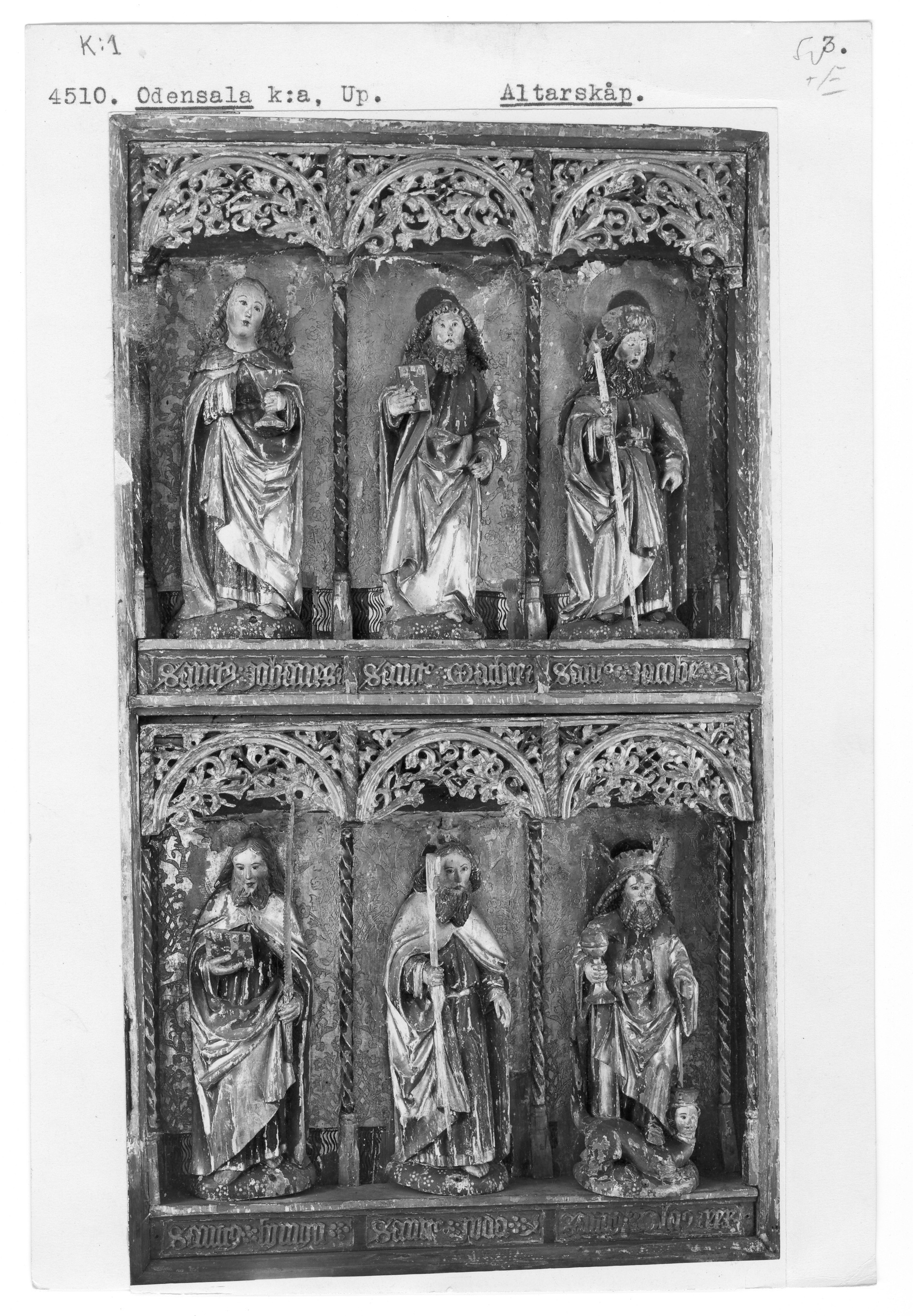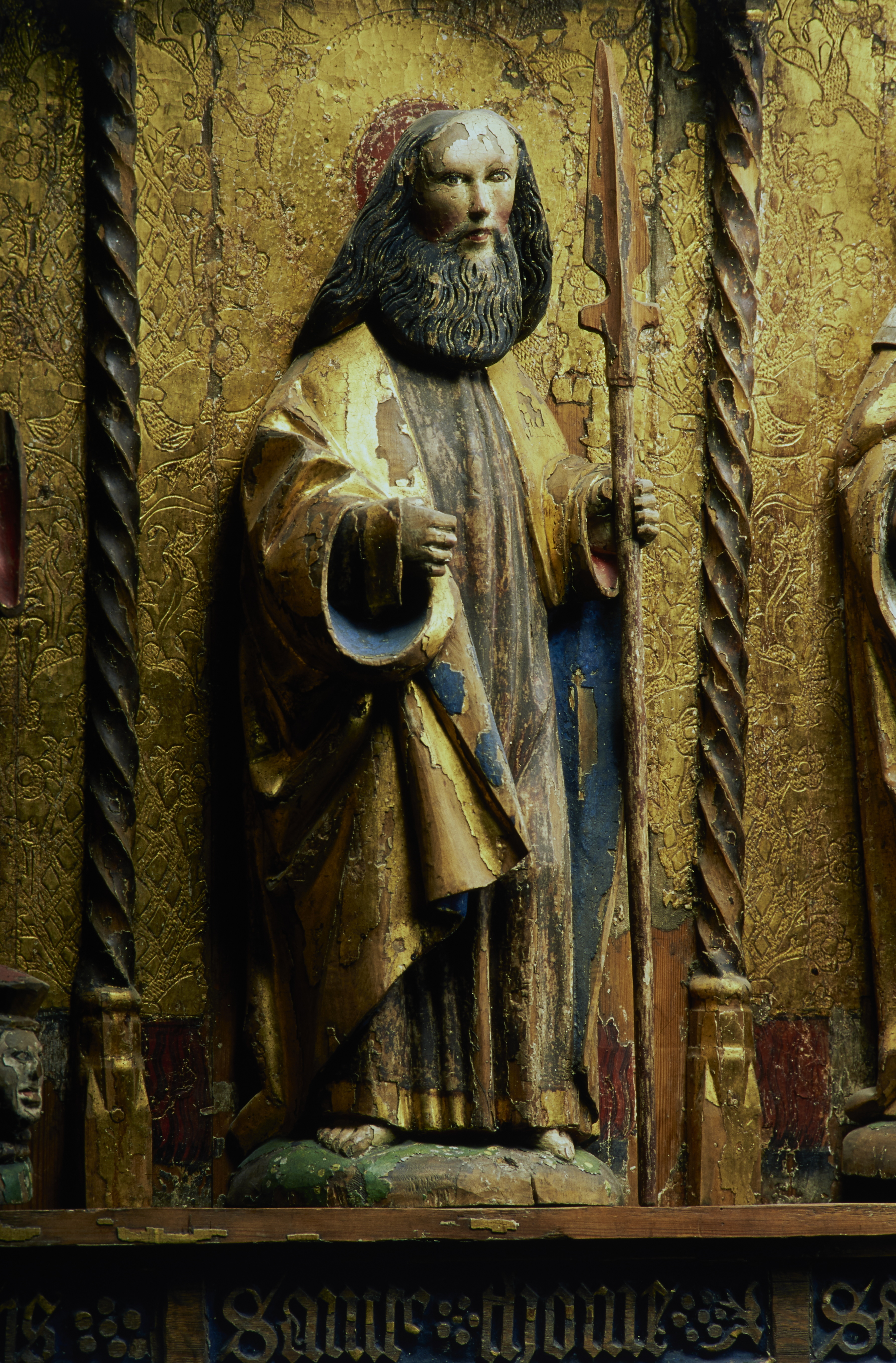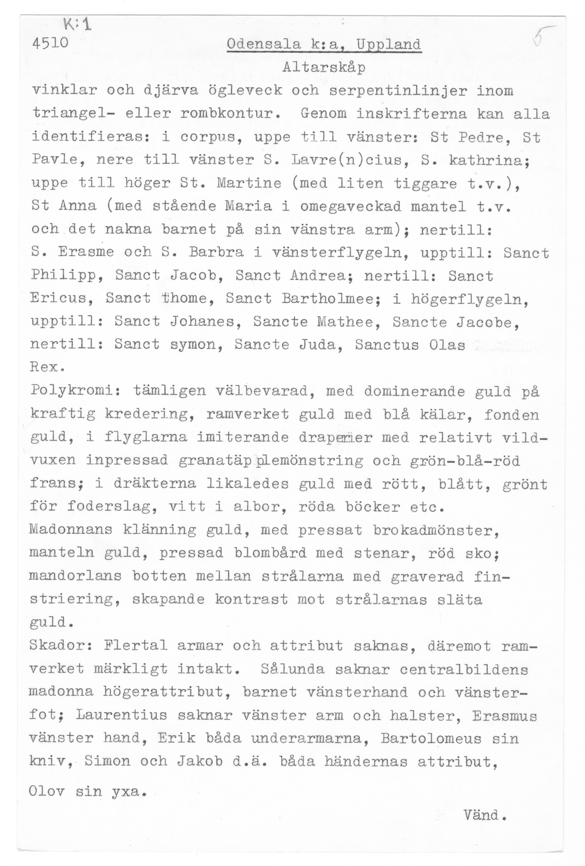 Kondition: Jesusbarnet har förlorat vänster hand och fot, flera helgon har förlorat sina händer och attribut. Färg: till största del välbevarad.
