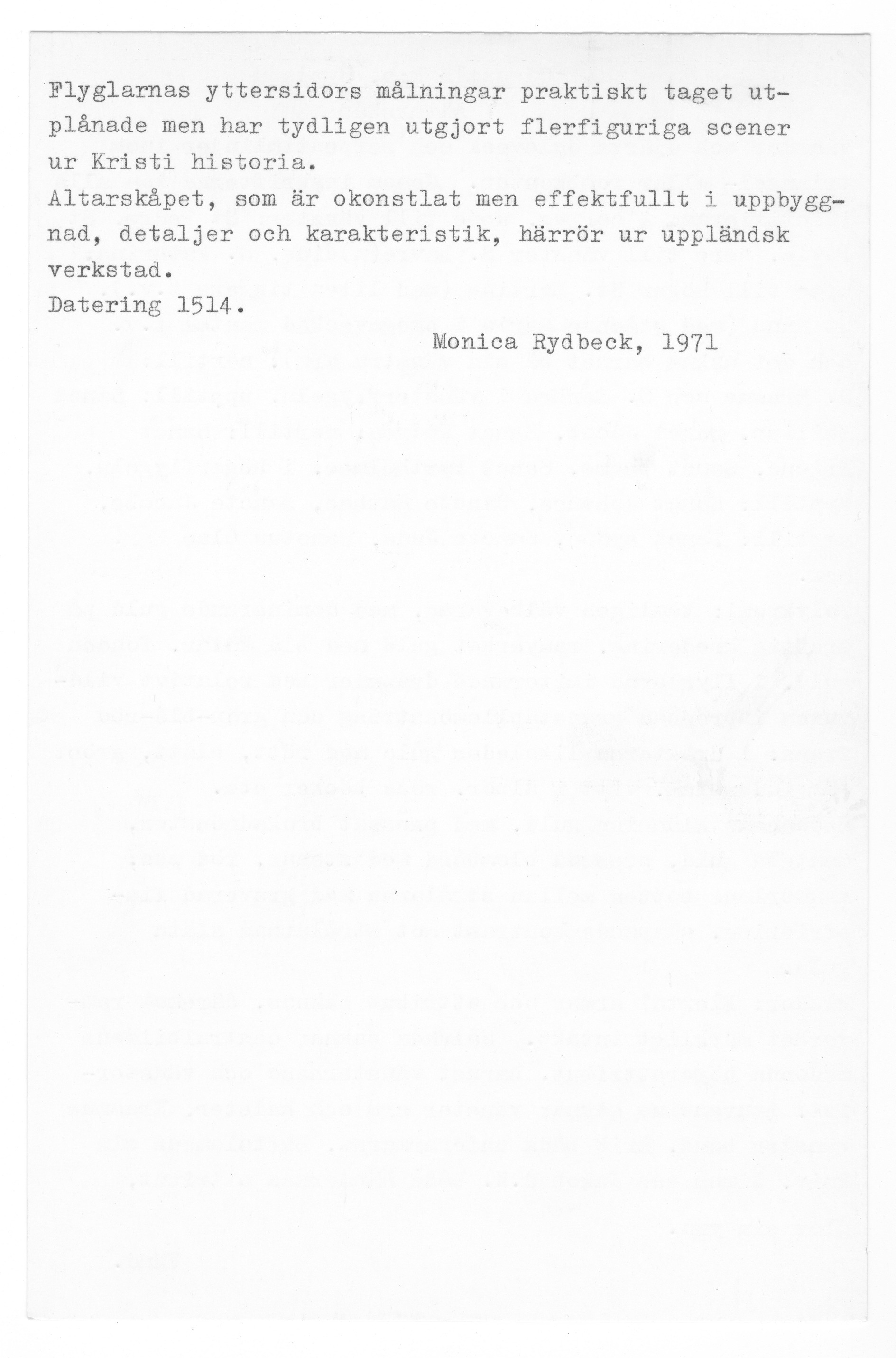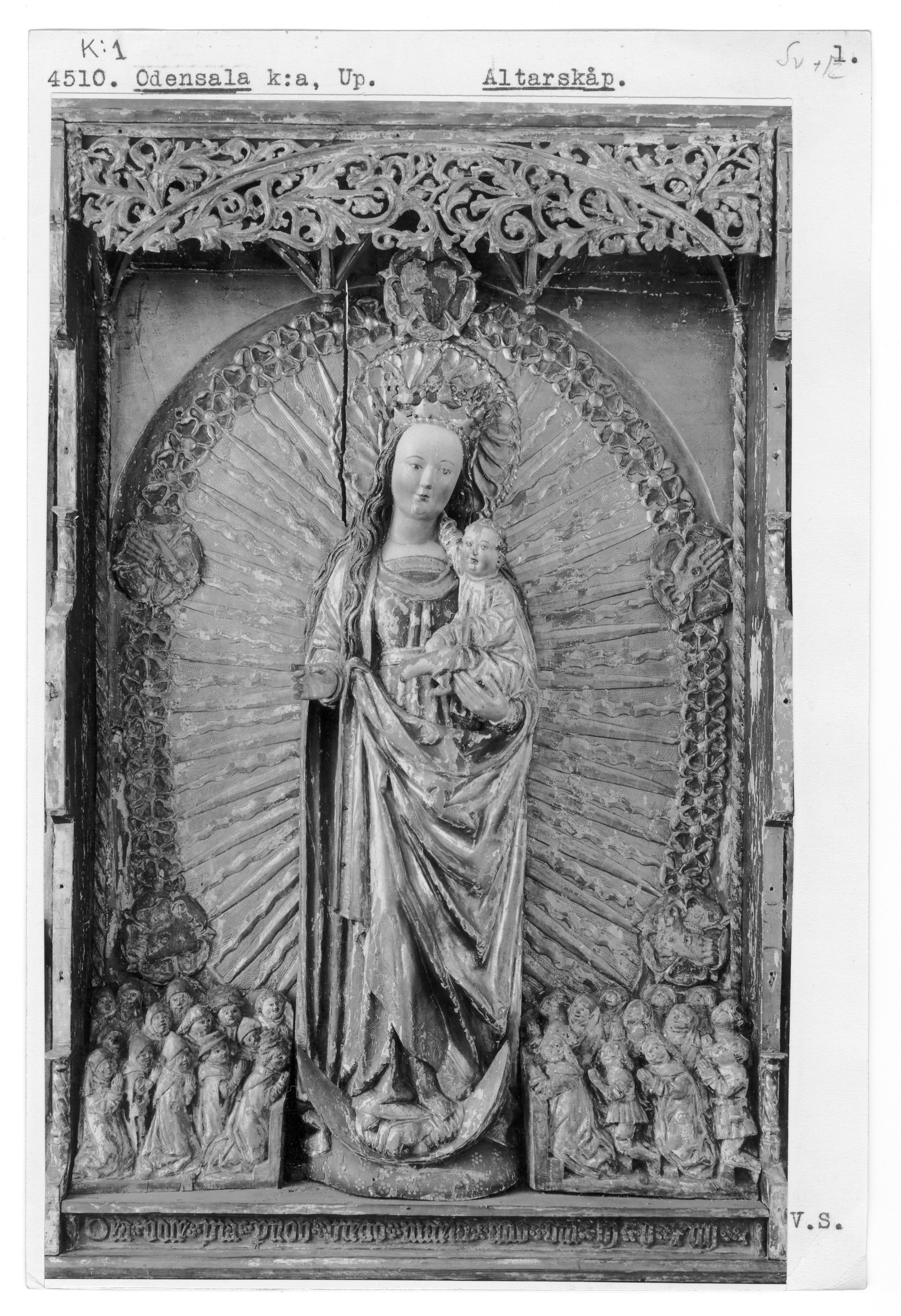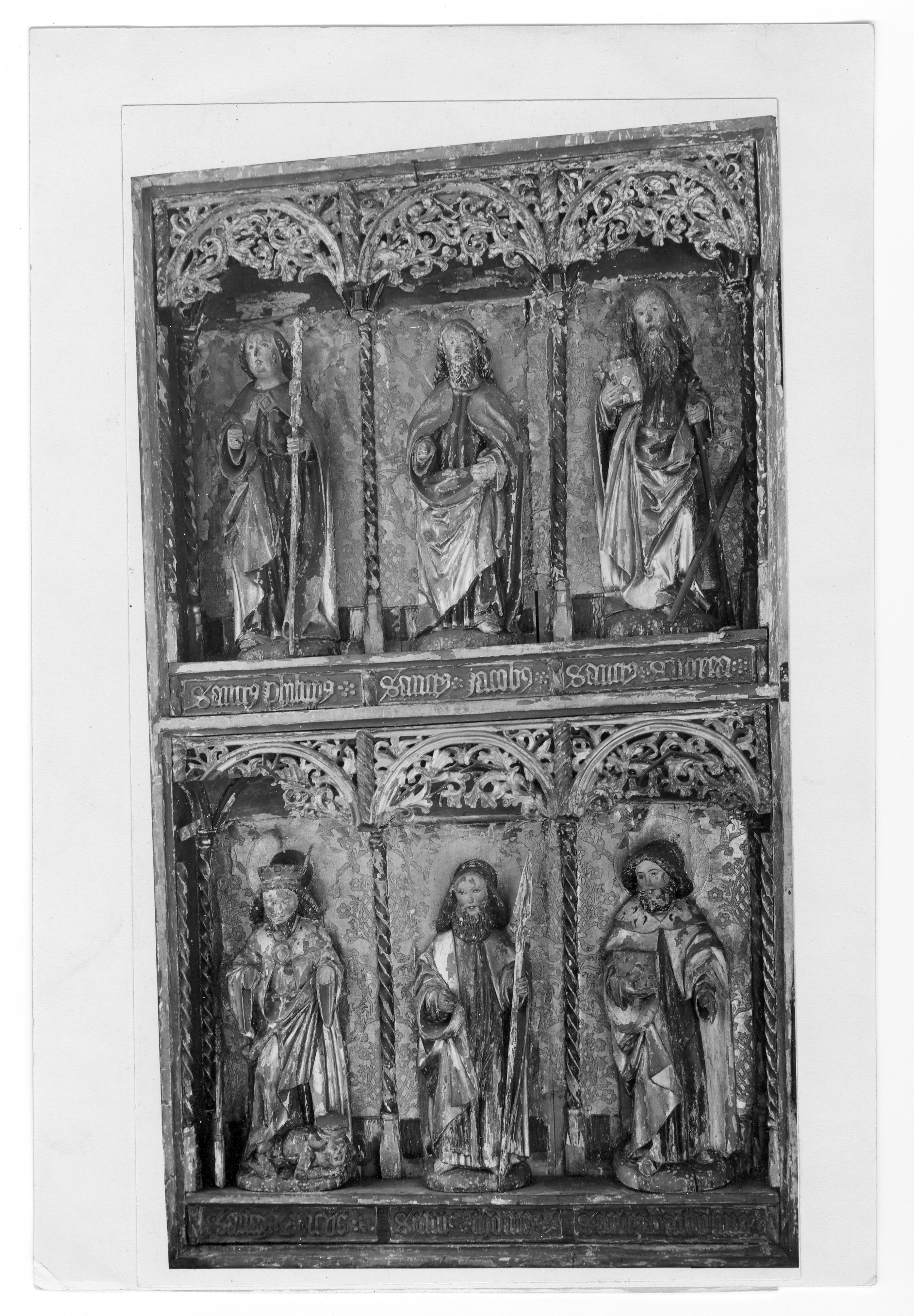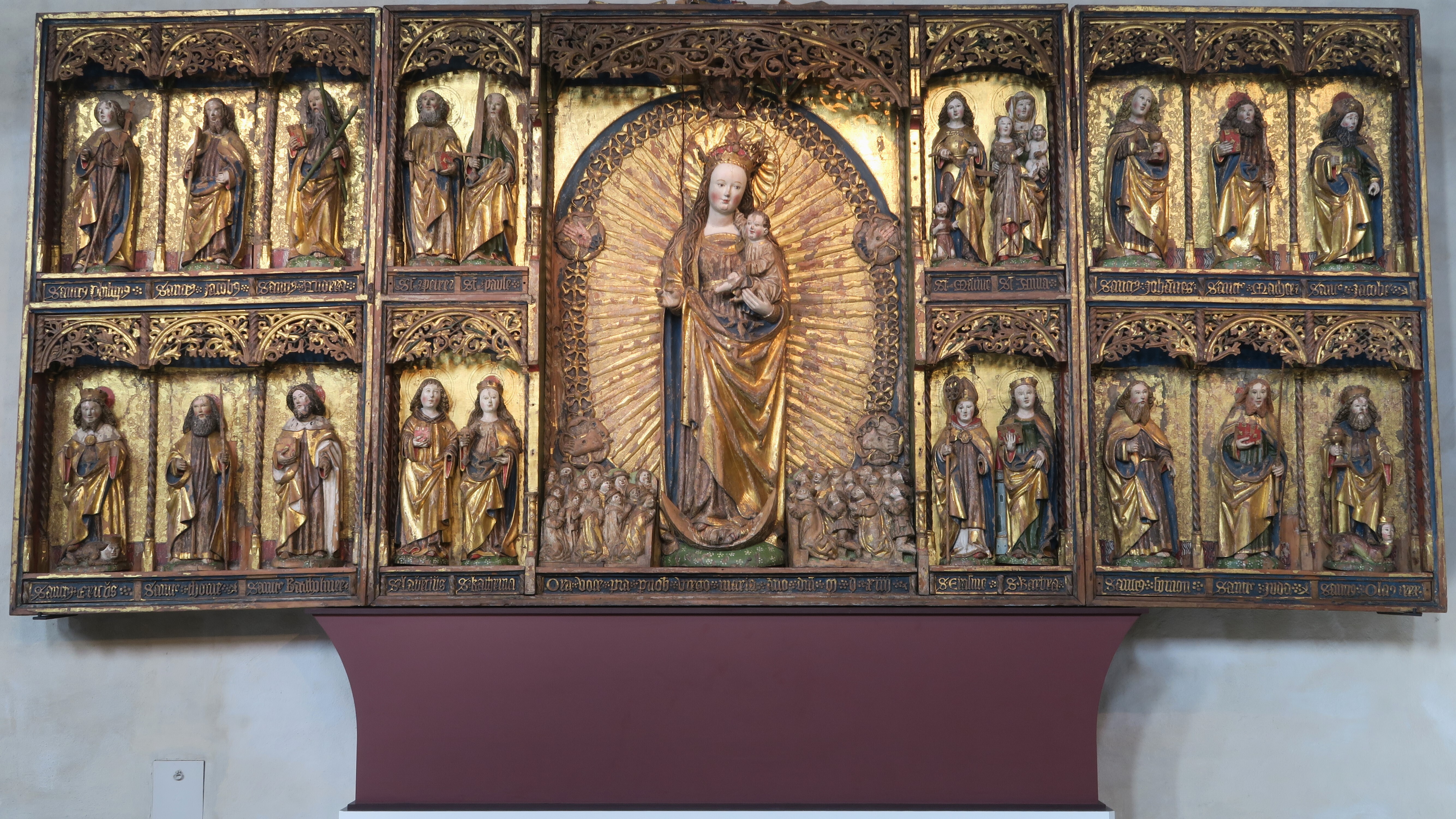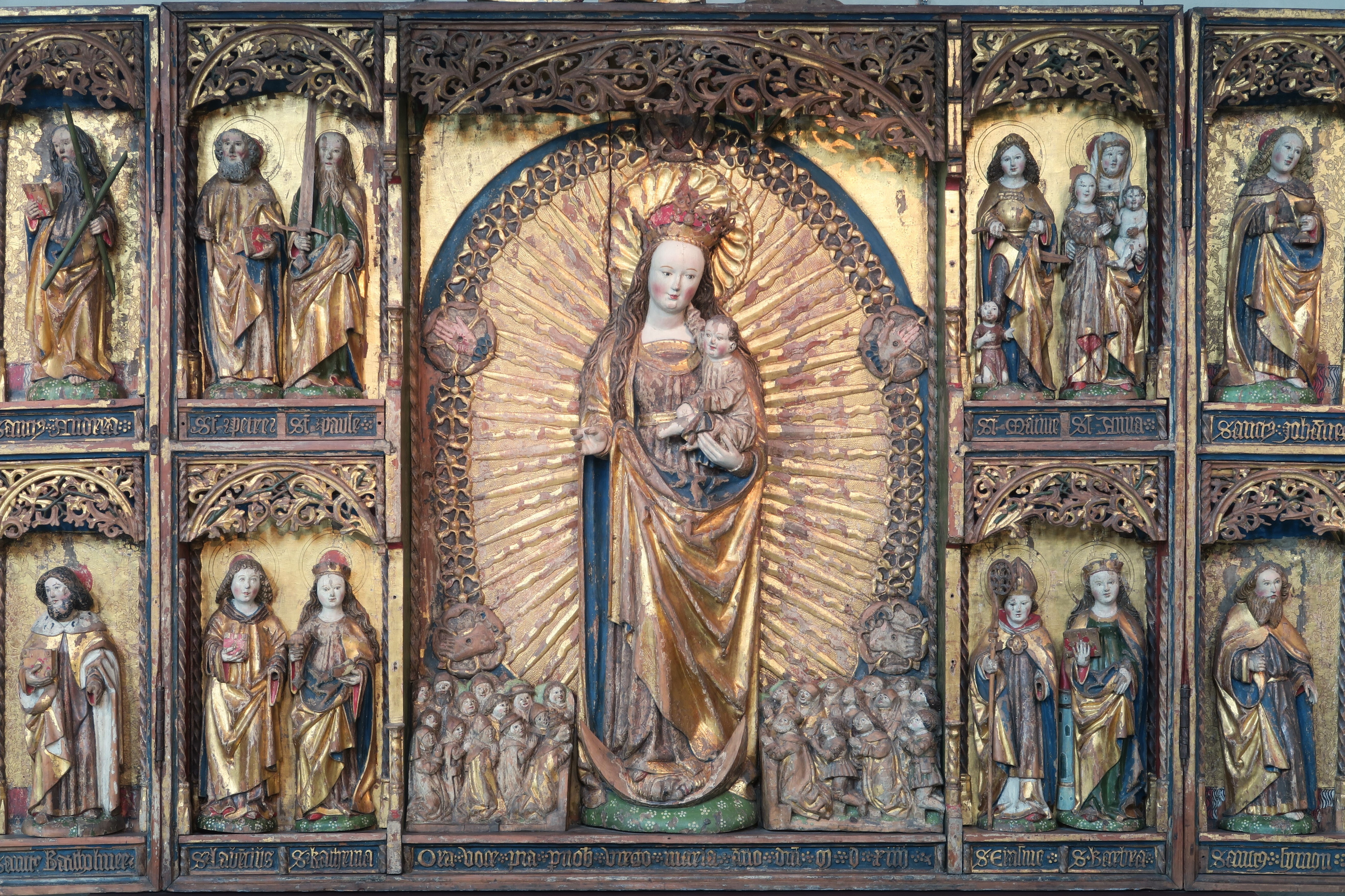 Kondition: Jesusbarnet har förlorat vänster hand och fot, flera helgon har förlorat sina händer och attribut. Färg: till största del välbevarad.