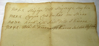 Gulvitt papper med gulnande kanter. Handskriven svagt rödaktig och något blek text. No 1.X flugöga Dito flugvinge flugben No 2.X Loppa Lus m hår m skinn No 3.X Kork Fisk fjell Dito S.Kierna. No 4.X Blå K. Kierna Fl. Kierna Salitra Perf..