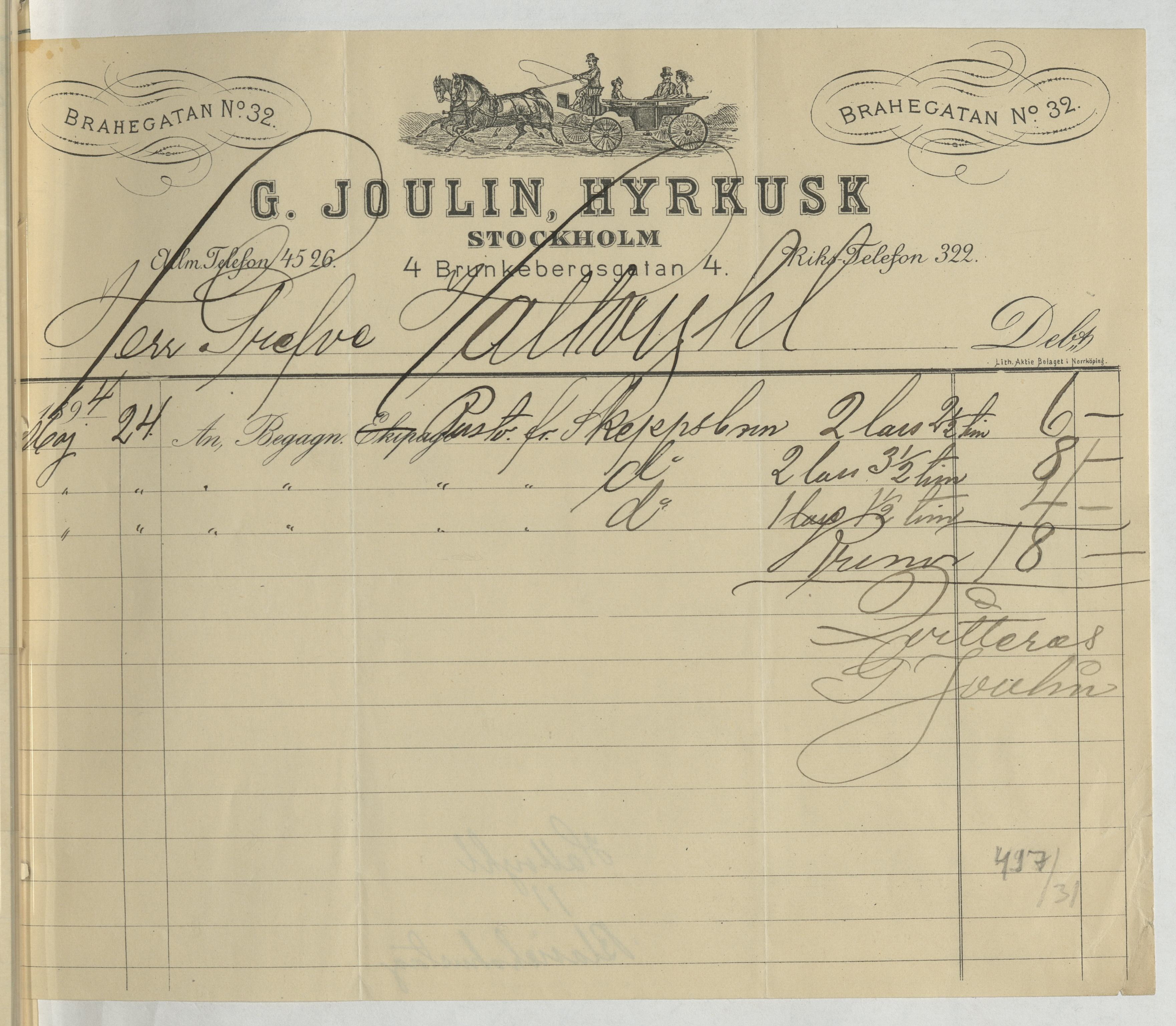 Kvitto från G. Joulin, Hyrkusk. Gällande flertalet transporter från Skeppsbron. Stockholm, 1894.