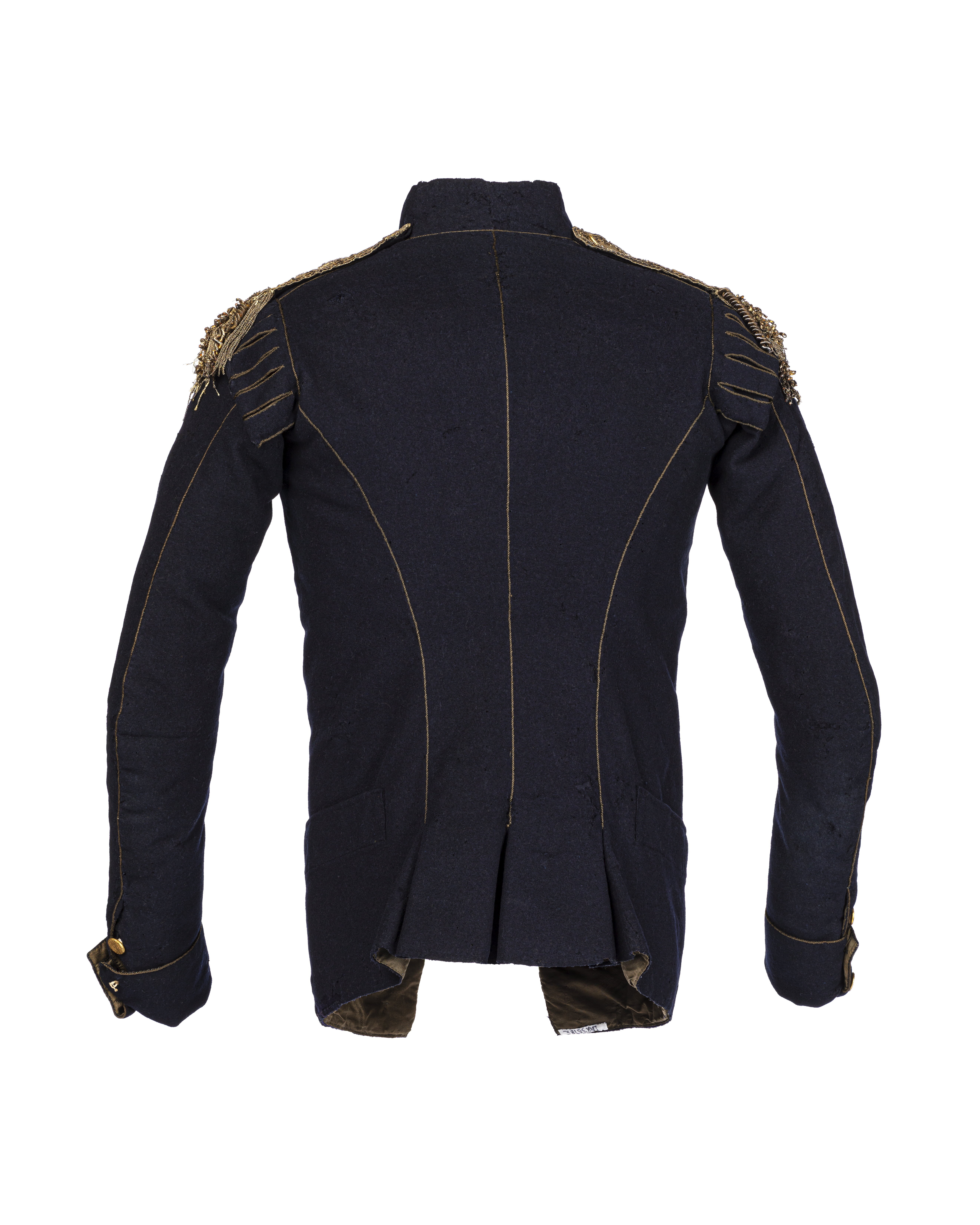 Uniformsjacka av mörkblått kläde med samtliga sömmar garnerade med en svart silkessnodd. Sydd av två fram- och två bakstycken. Jackan är av öppen modell med en dubbel, dekorativ knapprad som håller uppe två 72 mm breda, omvikta slag. Ursprungligen 16 knappar i vardera knapprad. Knapparna är av trä, förgyllda, pressade med en knottrig dekor och en blomma mitt på. Knapparna är knäppta i breda knapphål, 36 mm. Vid skuldrorna sitter på vardera slag ytterligare en förgylld knapp knäppt i ett rätvinkligt knapphål. En 48 mm hög ståndkrage. Långa smala ärmarna med uppvikta slag med ett sprund i nederkanten, knäppt med tre förgyllda knappar. Epåletter, 140 mm långa och 50 mm breda, bestående av ett band vävt av guldtråd samt guldlan kantat med guldpaljetter. På bandet sitter fyra kronor, tre öppna kronor krönta med en större, sluten krona. Bandet är upptill spetsformat och fastknäppt i jackan med en förgylld knapp. I nederkanten av epåletten sitter en 105 mm lång frans bestående av tvinnad guldtråd samt buljonger och krepiner i guld. Fransen hänger ned över en 45 mm bred axelklaff uppklippt i tungor kantade av svart silkessnodd. I nederkanten på vardera framstycke en iskuren horisontell ficka, 204 mm bred, med en markerad kant, 41 mm bred. Fickorna är på insidan fodrade med beigefärgat linne. I nederkanten på baksidan är jackan veckad så det bildas två vikta skörtkappor. Baksidan har en mittsöm samt två sidsömmar. Jackan är på insidan fodrad med grågrön taft. Ärmarna är på insidan fodrade med beigefärgat linne. På vänster bröst sitter serafimerordens kraschan, broderad på en botten av naturfärgad lärft samt ljust skinn. Ett malteserkors av silverpaljetter kantat med kantiljer av silver. Korsuddarna är indelade i par så att det bildas fyra korsarmar. Mellan korsarmarna sitter en seraf broderade i relief av silvertråd med detaljer av gul och svart silkestråd. I mitten en upphöjd rundel klädd med ljust blågrönt ribbat siden, runtom kantad av guldpaljetter. På rundeln en påskrift med bokstäverna IHS av silverpaljetter med ett latinskt kors stående på bokstaven H:s tvärstreck, omgivet av riksvapnets tre kronor av guldtråd och guldkantiljer. Under den nedersta kronan står tre kristi korspikar av silvertråd. Under serafimerorden är svärdsordens stora kors påsytt. Detta föreställer ett svärd av silver med en klinga med mittås, parerstänger med volutavslutande ändar. Mellan parerstängerna ett rektangulärt kryss med en blomma mitt på. En kavel med snedställda etsningar. Nederst en knapp med en mittknapp. På vänster slag i det fjärde och femte knapphålet uppifrån, sitter svärdsordens ordensband av gult siden med blå kanter, 35 mm brett. Bandet har ett stödtyg av svart linne. På hertig Karls initiativ infördes år 1788 en mindre uniform för "Kongl amiralitets Corpsen" bestående av en mörkblå jacka, vit väst och blå långbyxor. Jacka och väst var av kläde. I midjan knöts ett blå- gult sidenskärp och på fötterna bars ungerska halvstövlar samt en svart filthatt.