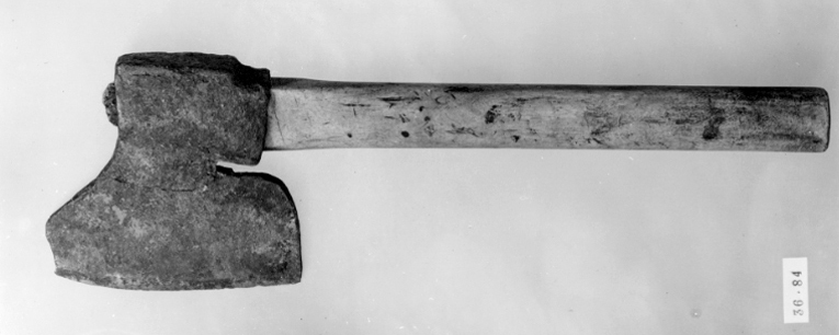 Ur Johan Rings bössmakarverkstad. Yxa med huvud av järn i form av en slöjdyxa med den karaktäristiska skåran mellan bladet och holken - den s.k. kvarken - som användes för att dra ut spikar. Den slipade eggen mycket svagt välv. Skaft av ek med ovalt tvärsnitt som övergår i ett kilformat, rektangulärt tvärsnitt att fästa i holken. Upptill en islagen kil av järn.