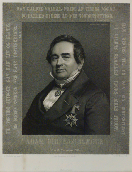 Bröstbild , fas vänster. Frack. Vit skjorta. Orden. På litograferad ram tre citat av H.C. Örsted. Inskrift : "ADAM OEHLENSCHLAEGER f.d. 14. November 1779". Signerad : "J. Wilhelm Gertner pinx. 1846" , två ggr. "Em. Baerentzen & C:o Lith. Inst. " , "J.W. Tegner lith". Förgylld ram med pastellagerankor i hörnen. Ramlistens bredd 75 mm.