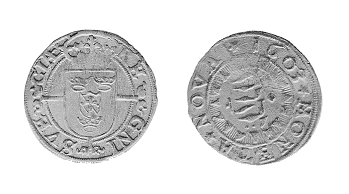 SILVER. Öre 1603. Åtsida: Under sluten krona rikets vapensköld (Tre kronor, mellan vilka en sköld med Vasa-vapnet på två strängar). Bakom skölden ett kors, de tre synliga armarna avslutade i bladflikar. Mellan två av kronan och korsarmarna avbrutna pärlstavar omskrift. Frånsida: Inom strålkrans av omväxlande tätare och glesare knippen Jehovah i hebreiska skrifttecken: Mellan två pärlstavar omskrift med årtal: Moneta Nova 1603. Rand: Slät. Mått: Vikt: 21 gr. Diameter: 25 mm.