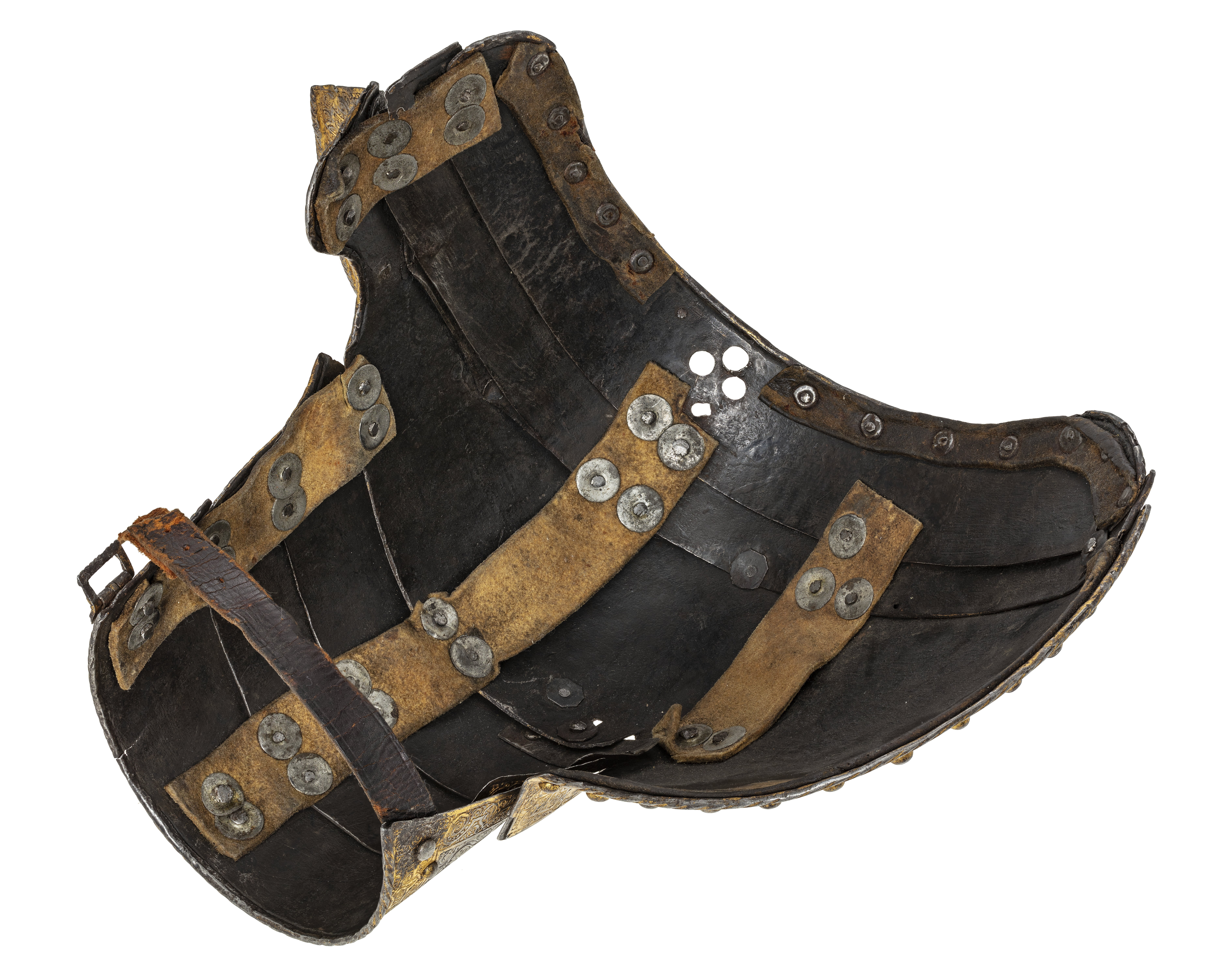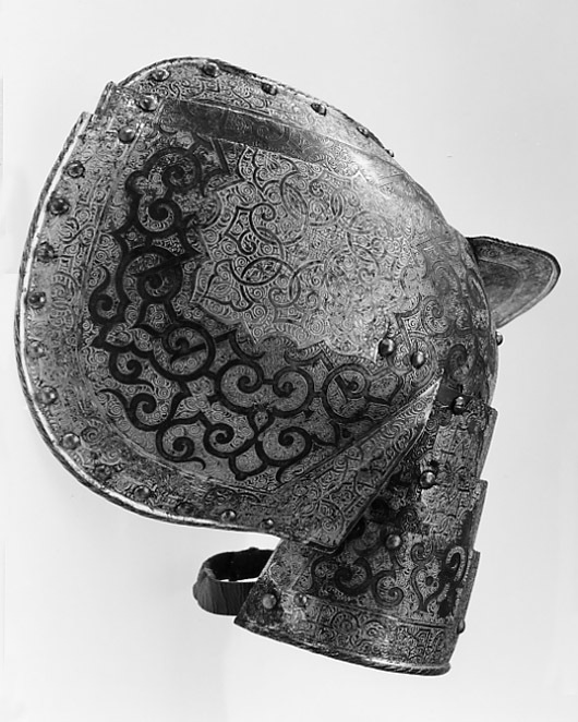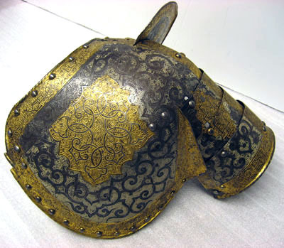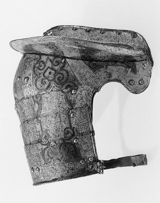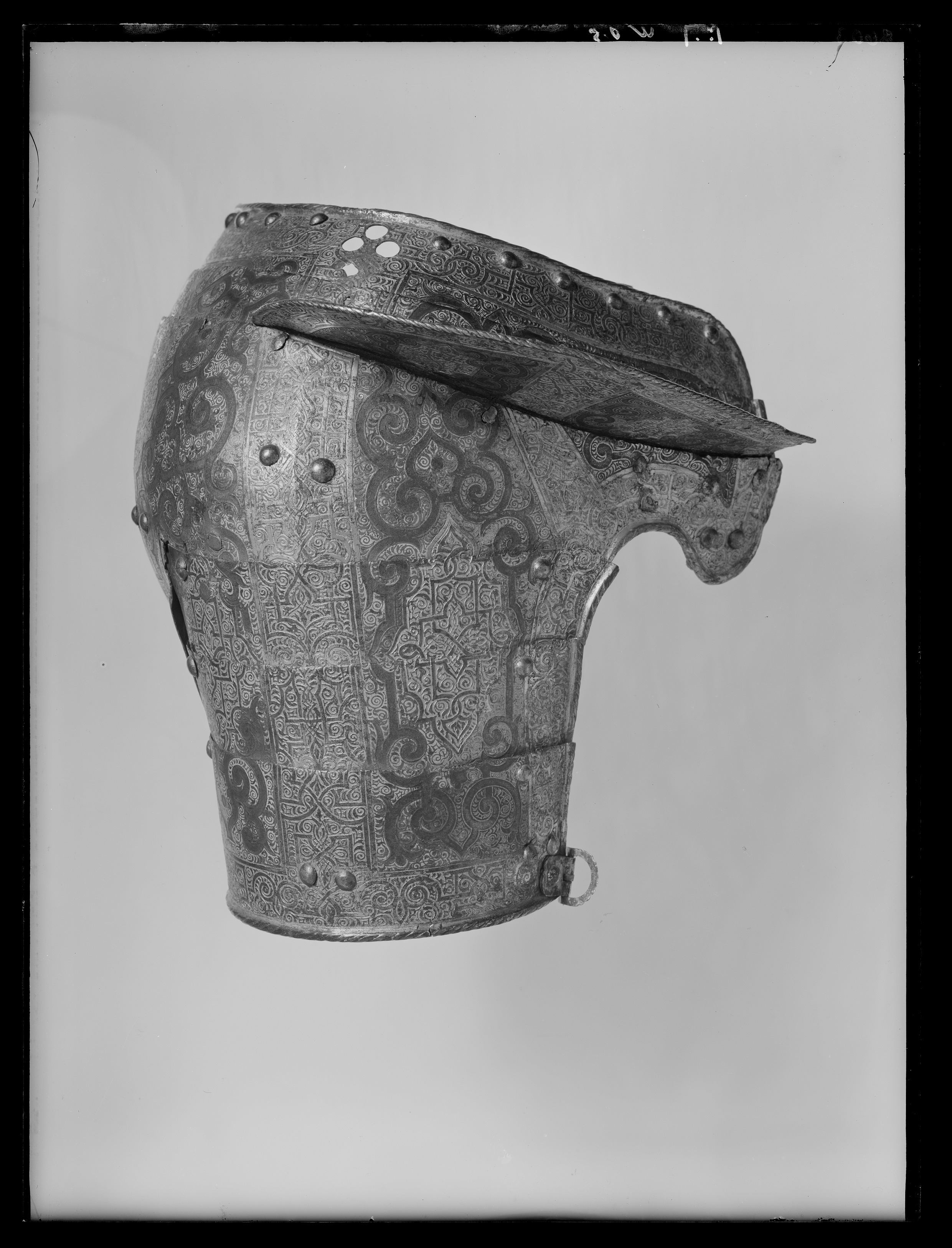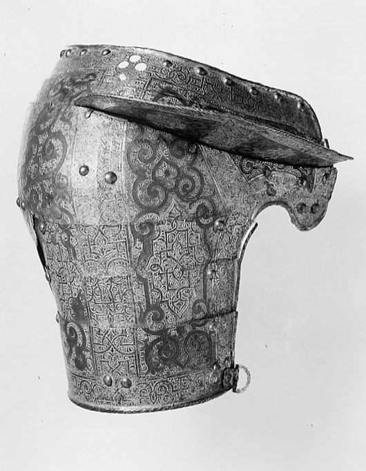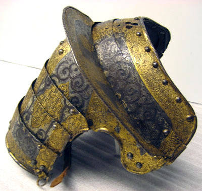 - 1 rustning af jern, helt och hållet etsad i ornamenter, hvilka äro dels förgyllda dels ifyllda med en hvit massa, rustningen, som uppgifves hafva tillhört konung Christian II, består af: hjelm i 5 delar med slutet visir, hakbetäckningen att öpna på midten, kammen hög, starkt bakåtsluttande, för hjelmbusken en hylsa, muttern på ena sidan af visiret jemte knappen till fjedern på öfre visiret borta, hjelmen invändigt fodrad med stoppning, öfverklädd med sidensars,