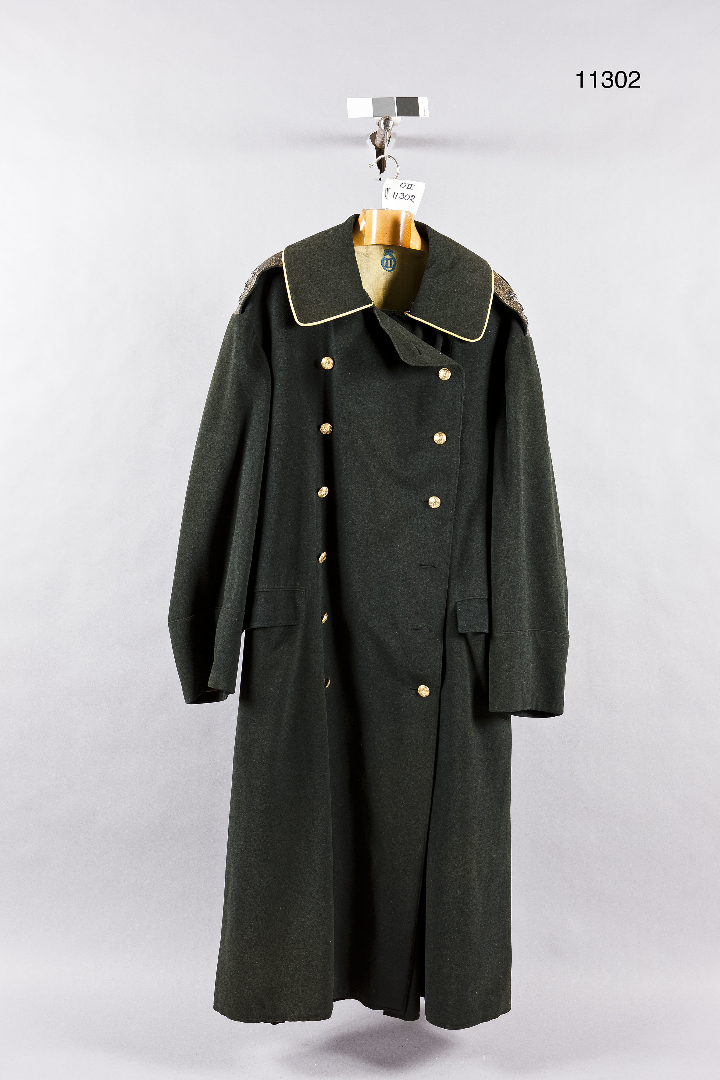 Kappa av mörkgrått kläde, tvåradig med fällkrage. Rakskuren. Fem knappar i varje rad, för generalitet d: 22 mm, med firmanamn på insidan: "C.C. SPORRONG & CO. STOCKHOLM". Axelklaffar med generalsgalon samt tre broderade silverstjärnor. 145 mm breda ärmupppslag. Två ytterfickor med rakskurna ficklock, den vänstra med hål för sabelbärrem. Runt kragen gul passpoal. I ryggen sprund med dold knäppning med sex sidenklädda knappar d: 13 mm. Ovanför sprundet slejf, knäppt med två, vertikalt placerade knappar. Foder av gult linne med en innerficka. På mitten, nedanför kragen, fastsytt monogram (Oskar II:es) nedanför kunglig krona.