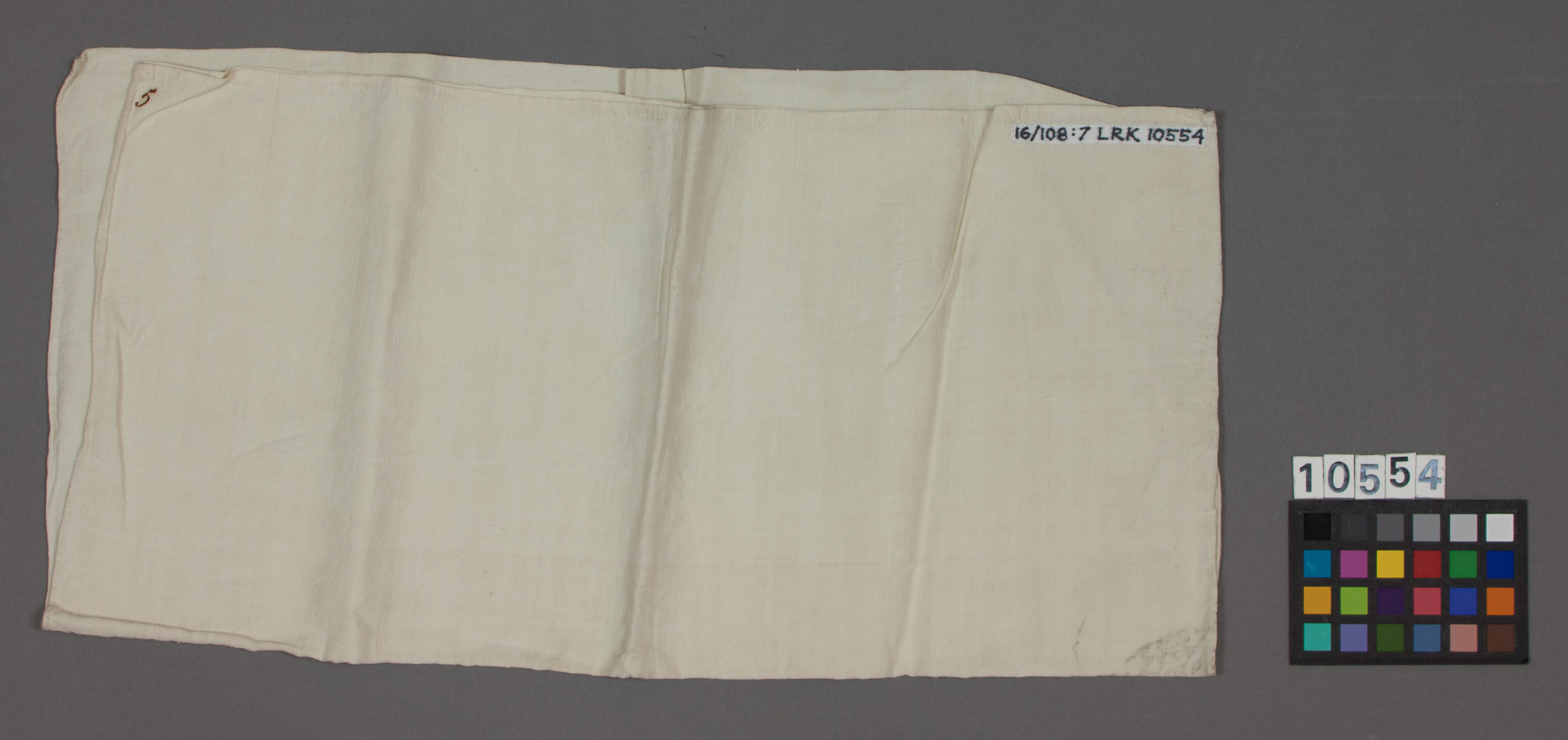 Plagg ingående i en korg med babykläder som använts av Sofia och Oskar (II):s barn. Kvadratiskt örngottsvar av vitt linne med handsydda sömmar. Ena sidan öppen och fållad, i ett hörn med märkbläck "5".