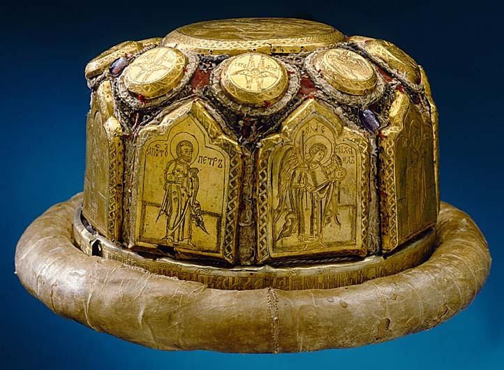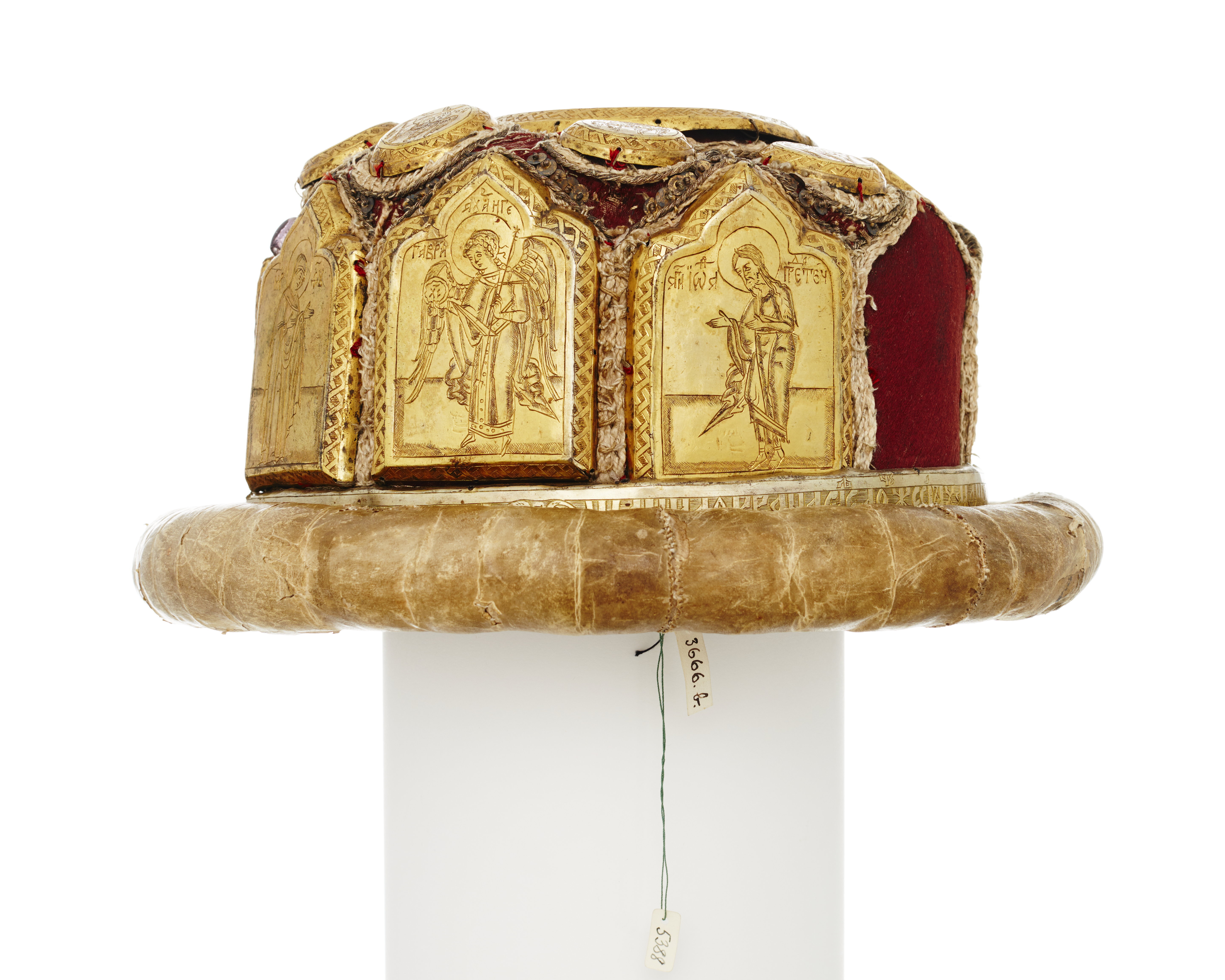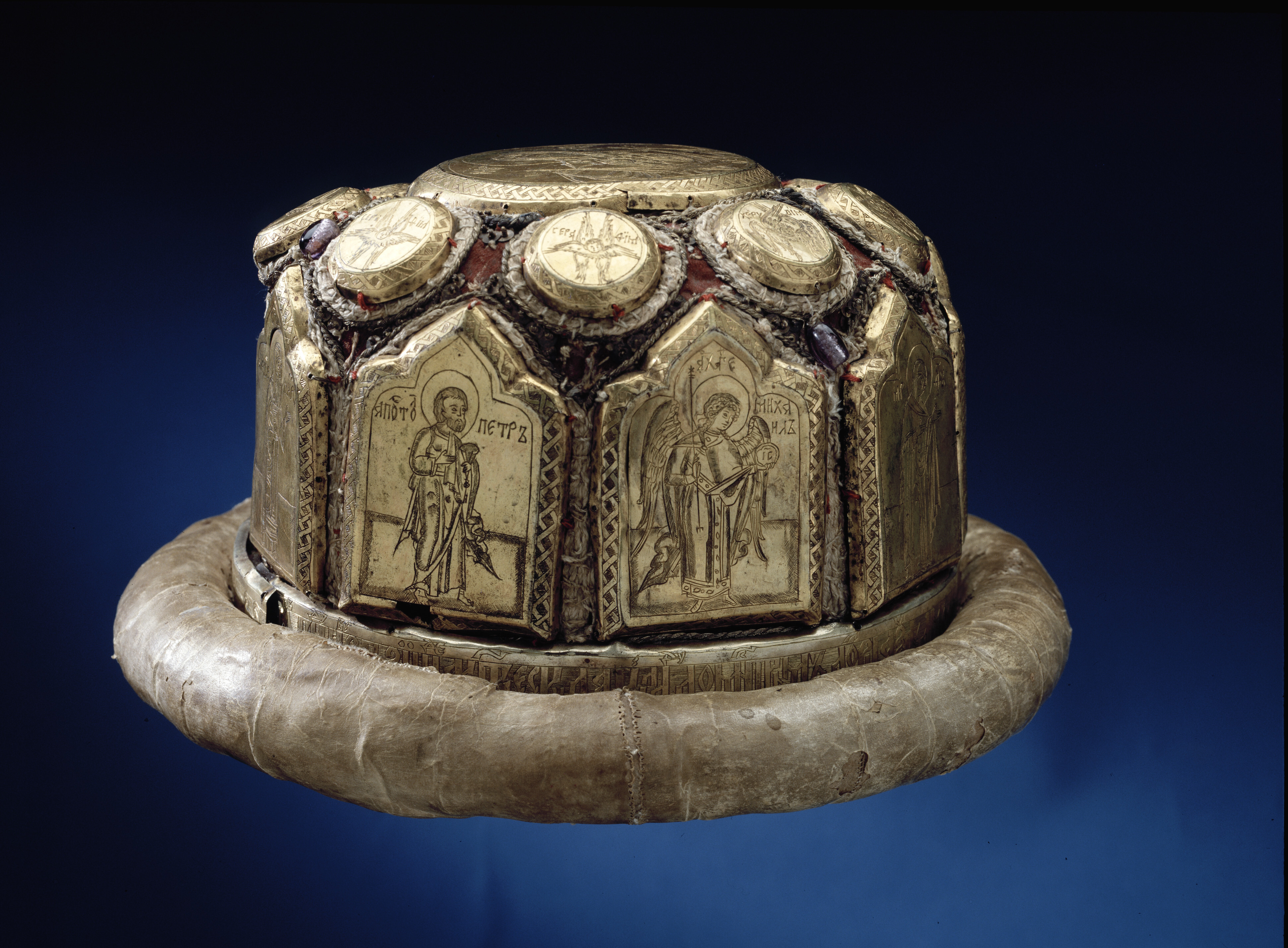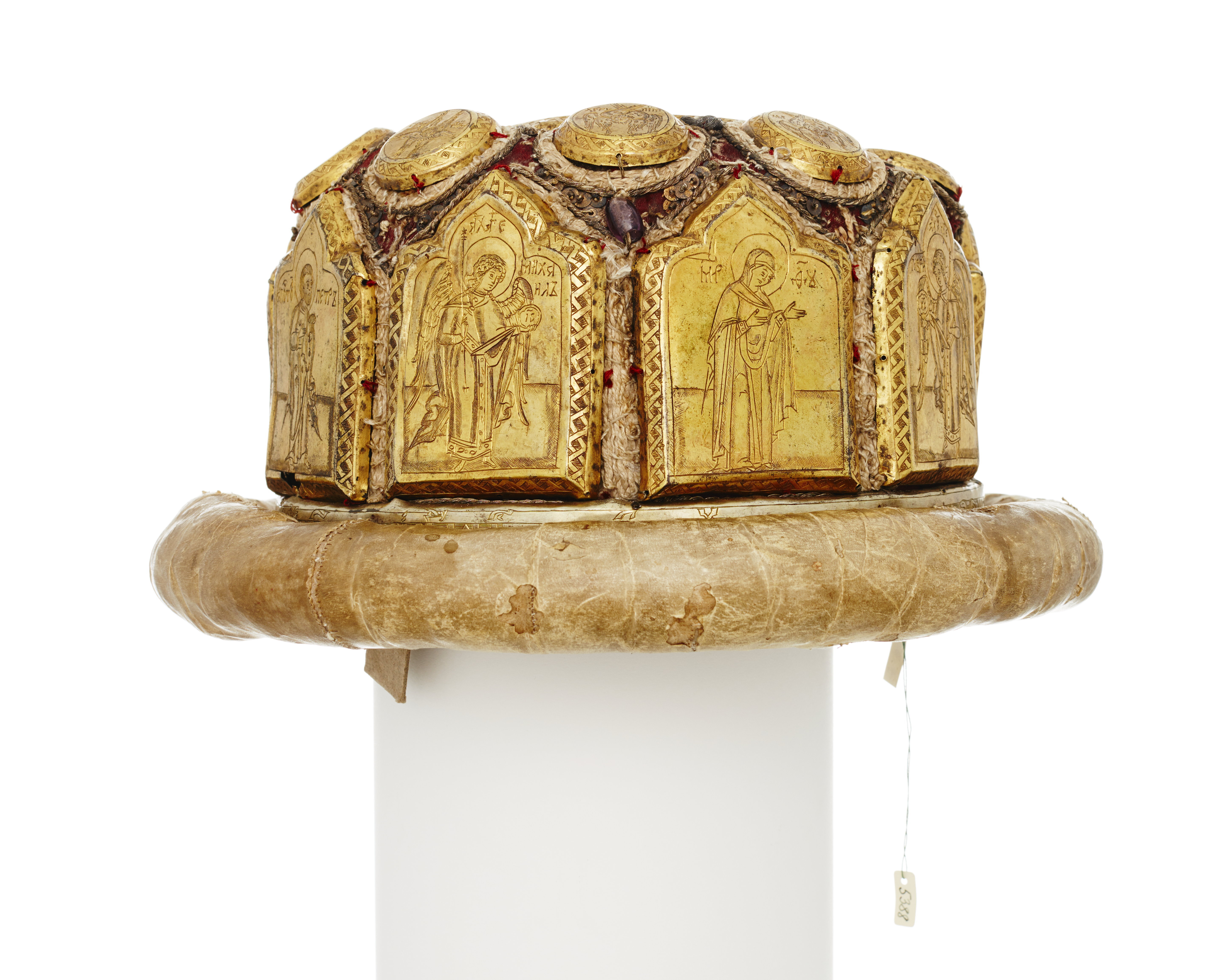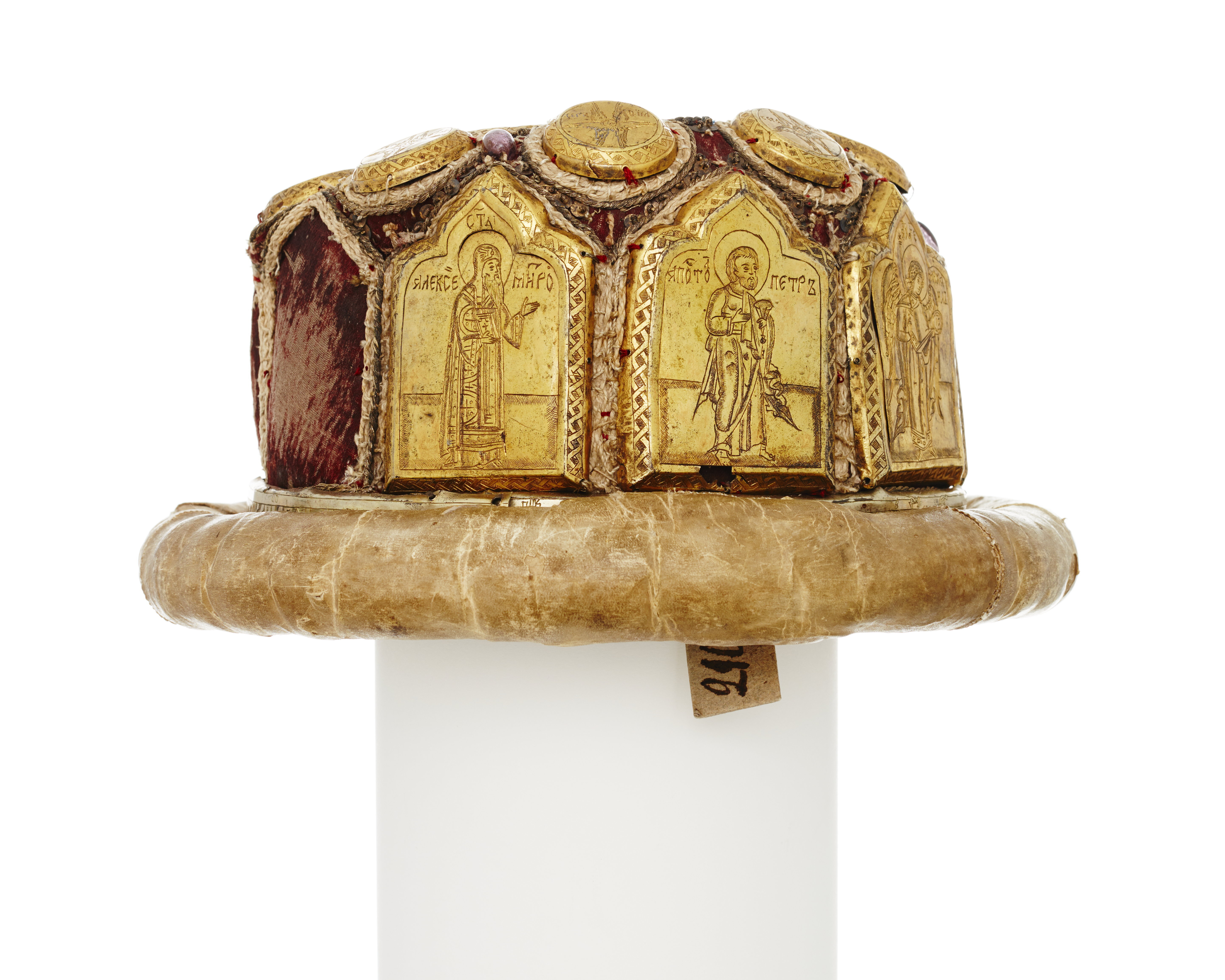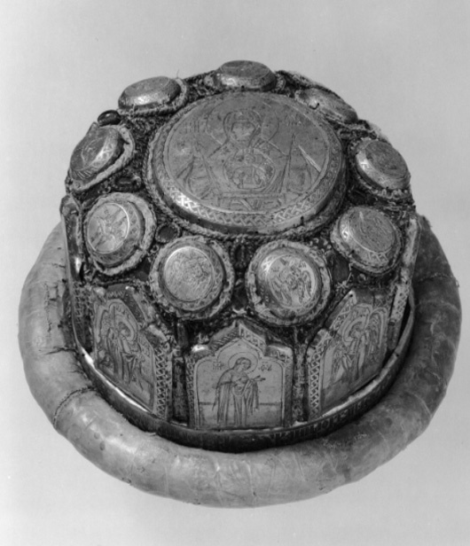 Krigsbyte från Narva, 1700. Mitra av hattformig modell med cylindrisk kulle med svagt rundad kant. Vulstformigt brätte, b: ca 30 mm, klätt med pergament (ursprungligen med skinn?). Kullen klädd med delvis mycket slitet, karminrött siden, nertill vid brättet ring av förgylld silverplåt, b: 30 mm med graverad, gammalslavisk text (översättning se Bodin Per-Arne, "Kejsarkrona och törnekrona", tidskr. Livrustkammarne 15:12, Stockholm 1981): År (7)159 november, 17 dagen gav statssekreteraren Michail Danilovs hustru, änkan Uljana, dotter till Vasilij, denna biskopsmössa till Tjudovklostret, till den undergörande Aleksijs hem, till minne av sin make Michail Danilovitj, eremitmunken Misail och sin dotter Ksenia för sin själ Därovanför en krans med sex, ursprungligen nio helgonbilder, graverade på rektangulära plåtar med trepassformig överdel, mellersta bågen spetsig, h: 83 mm, b:58 mm, gammalslaviska texter: 1 - ett manligt helgon med otydlig text "pete.."; 2 - ärkeängeln Gabriel: "achange gabri"; 3 - Maria: "mrthy" (mätär Theo - Guds moder); 4 - ärkeängeln Mikael: "achage michail"; 5 - evengelisten Petrus: "apoto petr"; 6 - helgon i biskopsdräkt: "st.alekse miro". På kullens översida en krans med nio runda plåtar med serafer och keruber, fyra stycken med text: "serafim", fem med "cherubi". Mitt på kullen en stor, rund plåt, d: 102,5 mm med Maria och Jesusbarnet, text:"mrthy" (Guds Moder". Runt plåtarna broderier med silke, silvertråd och -paljetter, två ovala, genomborrade glaspärlor bevarade. Hatten invändigt stoppad och klädd med blekrött siden.